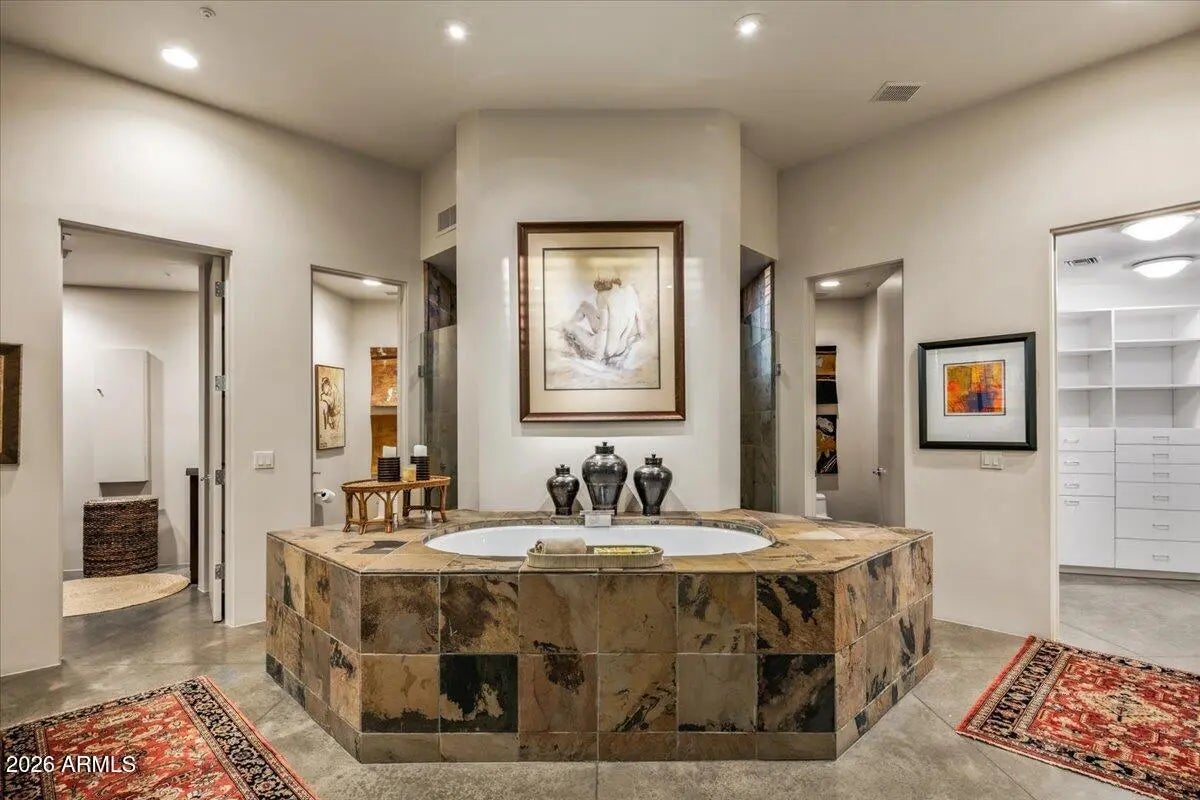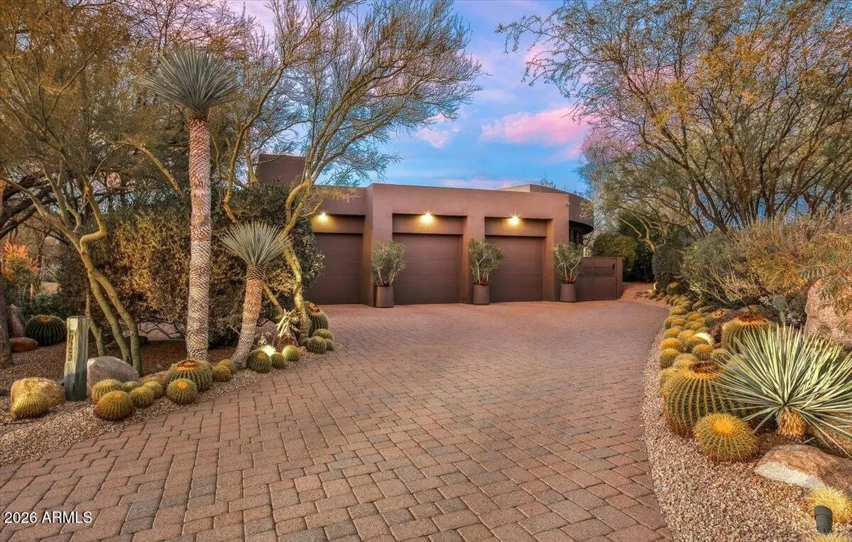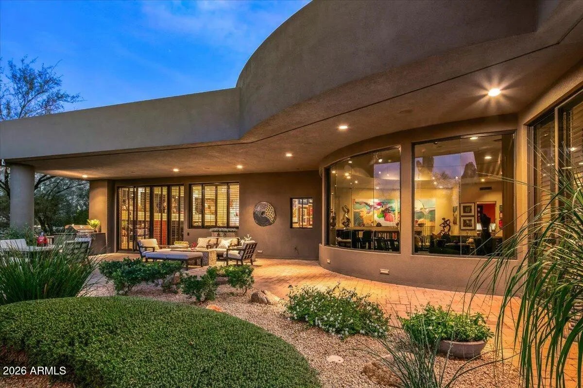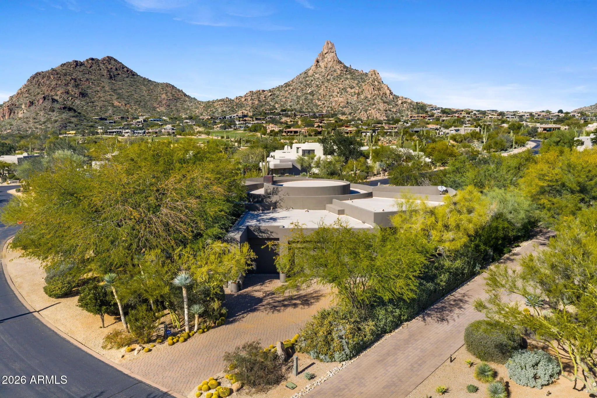 IMMEDIATE GOLF MEMBERSHIP AT CLOSE OF ESCROW. A true architectural statement in North Scottsdale, this one-of-a-kind residence is defined by its distinctive round design, thoughtfully imagined and designed by the original/current owners to create effortless flow and visual intrigue throughout. Walls of glass frame clear, unobstructed Pinnacle Peak views, filling the home w/ natural light and a constant connection to the desert landscape. The lower level offers exceptional versatility, featuring multiple flex spaces and a private bedroom ideal for a media lounge, wellness retreat, home office, or guest suite. A climate-controlled wine room adds an elegant touch for collectors and entertainers alike. Discreetly tucked away, ascend the hidden staircase (only accessible from the... home's interior) that leads to the rooftop view deck where breathtaking mountain vistas set the stage for sunset gatherings and quiet moments alike. Below, a tranquil backyard oasis unfolds with a sculptural water feature that brings movement, sound, and a calming, zen-like atmosphere, creating a private sanctuary perfectly aligned with the home's architectural serenity. Bold yet timeless, artistic yet livable, this home delivers a rare blend of inspired design, elevated lifestyle, and unforgettable presence. Owners also had plans previously drawn up for a pool and guesthouse to be added on the back side of the property. Plans would need to be resubmitted to Desert Highlands Architectural Design Review Board to be approved.