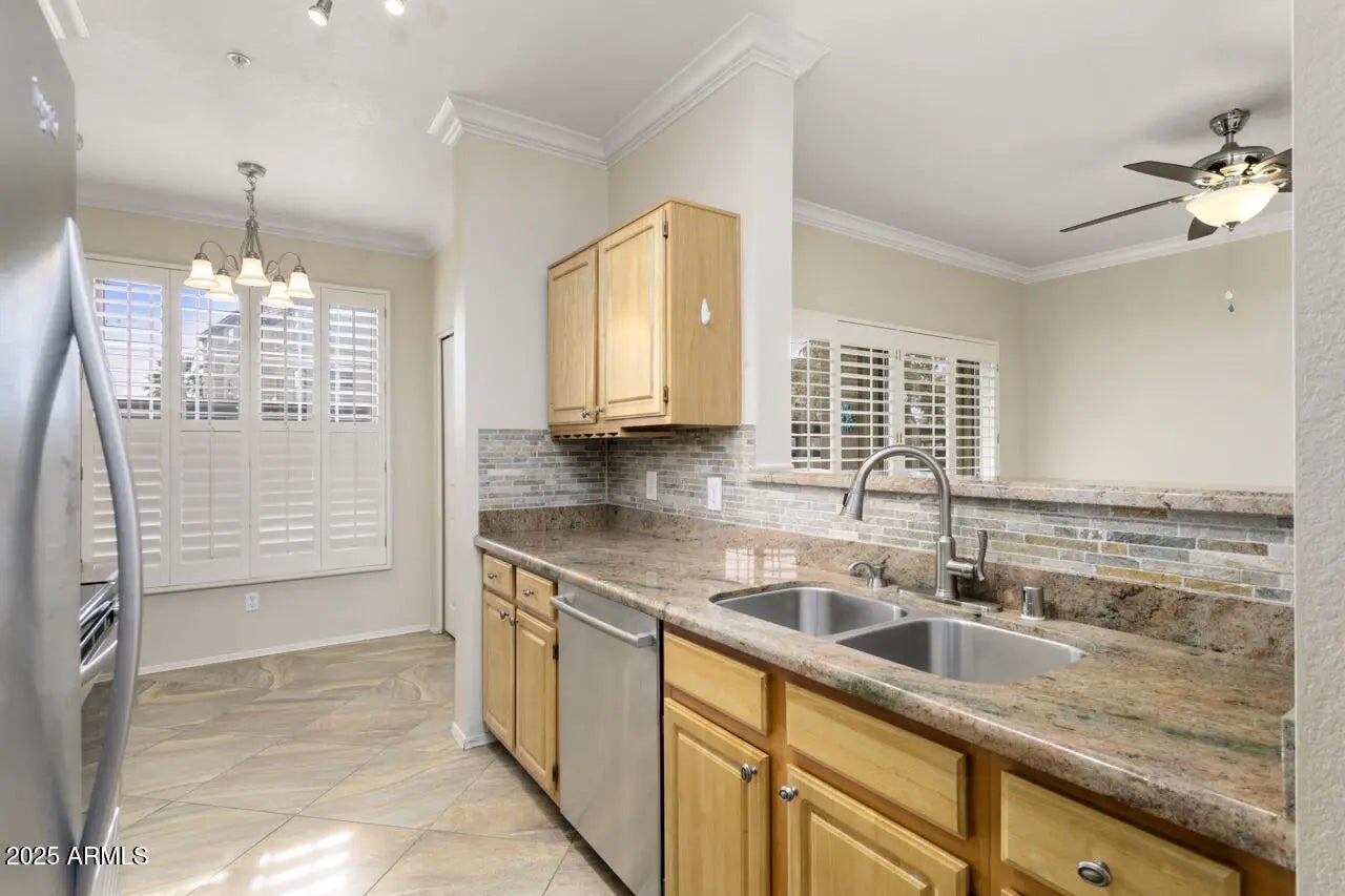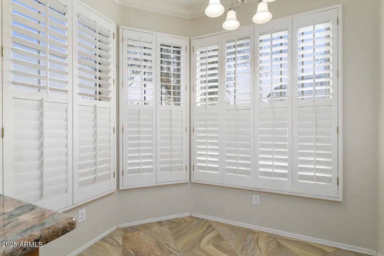 This GRANDE model boasts a split floor plan with 2 bedrooms, 2 baths offering privacy for guests and owners. The stylish kitchen features granite countertops, pull-out drawers, and new appliances. The main bathroom also features granite countertops. Updates include new tile flooring and lighting. Other desirable features include plantation shutters, comfort commodes, crown molding, a Murphy bed in the guest room, and a new furnace and carpet. A security door adds extra safety and security. La Solana offers plenty of amenities including a heated beach-entry pool, spa, clubhouse, theater, lending library, hair salon, and a resource room equipped with computers. You also have access to the amenities in Sun City Grand.