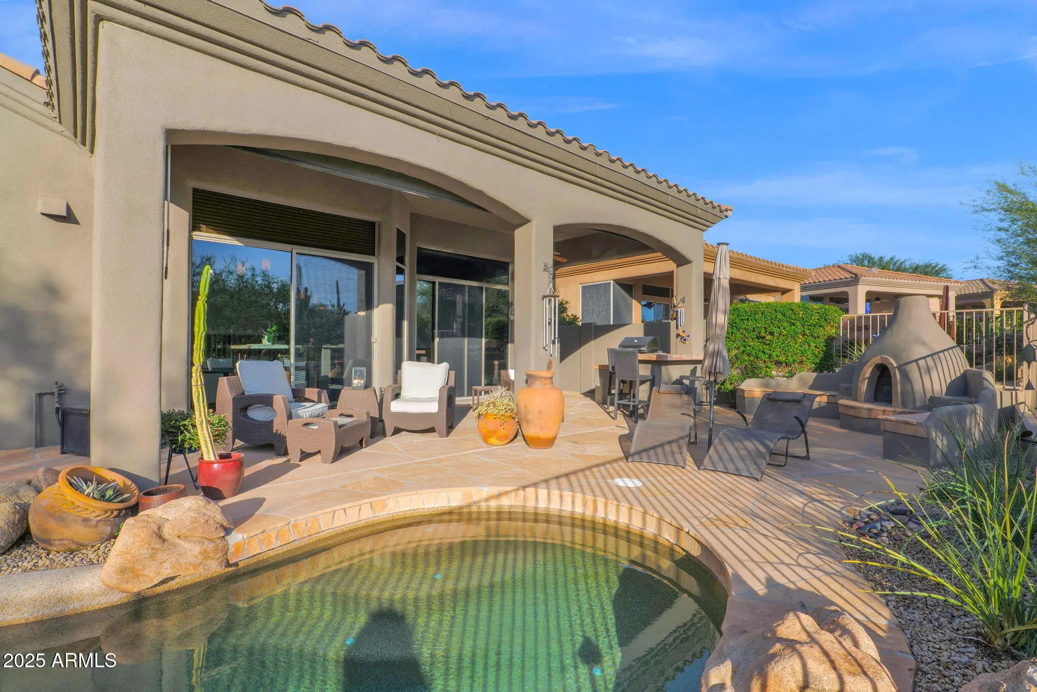 Elevated desert living in this beautifully updated home located on the 5th hole of the renowned Legend Trail Golf Course. Designed for both comfort & style, the home features designer paint, tastefully updated kitchen & baths with travertine flooring & an irresistibly private backyard. Soak up the sun in the pool, with sweeping golf & mountain views. Built-in BBQ & beehive fireplace for dining under the stars. Legend Trail is a premier community with a championship golf course, clubhouse, fitness center, resort-style pool & spa, tennis & pickleball courts. Legend Trails is close to Pinnacle Peak Park, & miles of trails in the McDowell Mountains. Enjoy Barrett-Jackson, Phoenix Open, Arabian Horse Show, Western Week, Bike Week, exceptional restaurants, shopping, & entertainment.