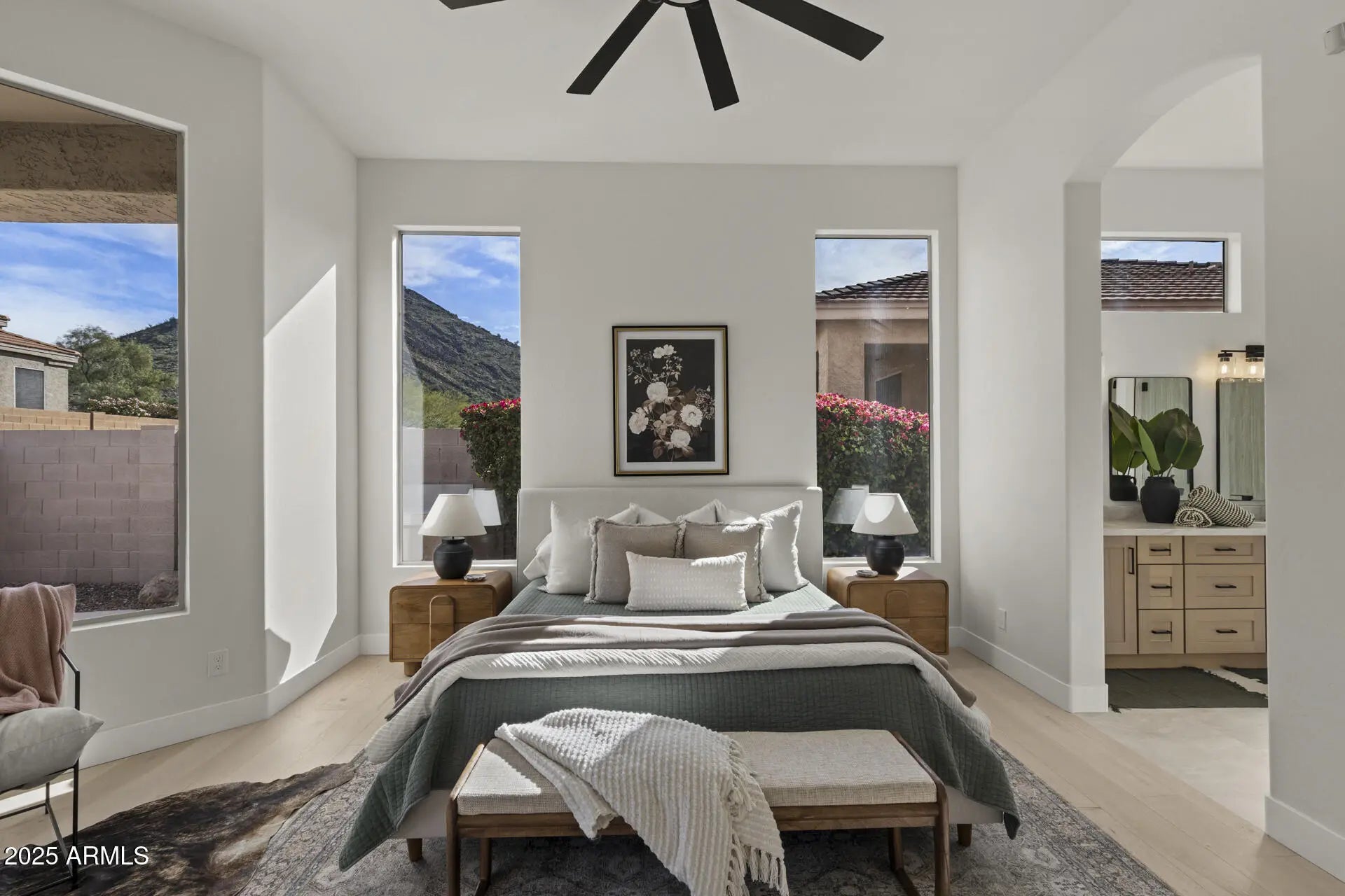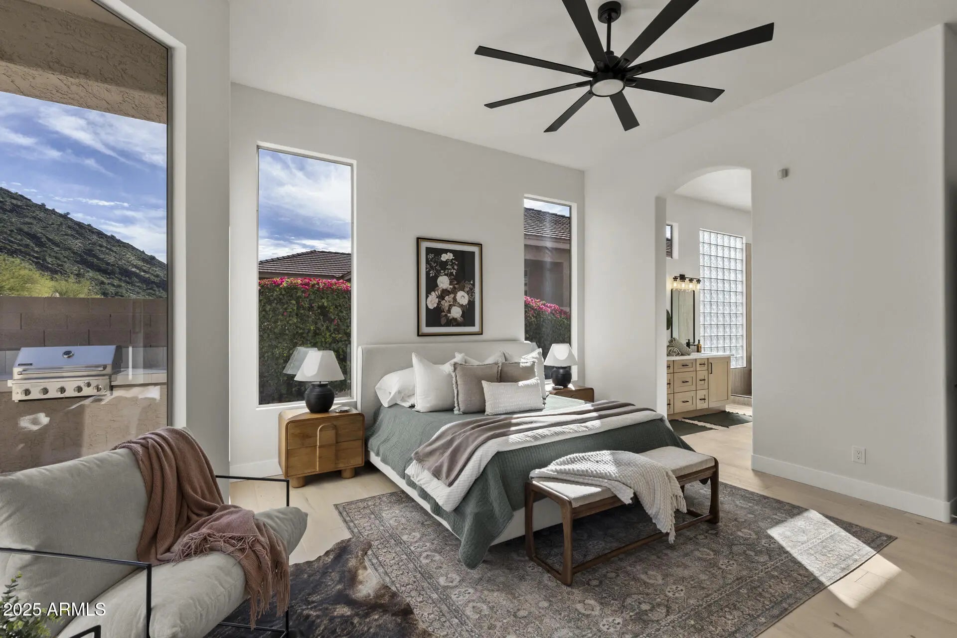 The search is over! This stunning luxury makeover is sure to check your boxes! With 4 bedrooms, 3 bathrooms, a 3 car garage with mountain views.. this home is ready for its new owner! As you enter the home you will be greeted with a large bright room with formal dining and a seating area next to your chilled wine cooler. Moving rooms, say hello to the gorgeous new kitchen with customs cabinets, waterfall quartz countertops and all new GE Monogram appliances. Overlooking the great living room with an abundance of natural lighting, enjoy the new gas fireplace and mountain views just outside your windows. This split floor plan offers 3 bedrooms (1 being ensuite) and 2 bathrooms on one side and the primary suite, laundry room and garage on the other. Entering the primary suite you are greeted with mountain views, a door with access to the backyard/patio and a completely revamped bathroom. Starting with a beautiful oversized double vanity with tons of storage, an extra large tiled walk-in shower with multiple sprayers and a walk-in closet with custom built-ins. Head to the backyard for a sparkling pool, new turf, mature landscape, mountain views, covered patio and a gas bbq!