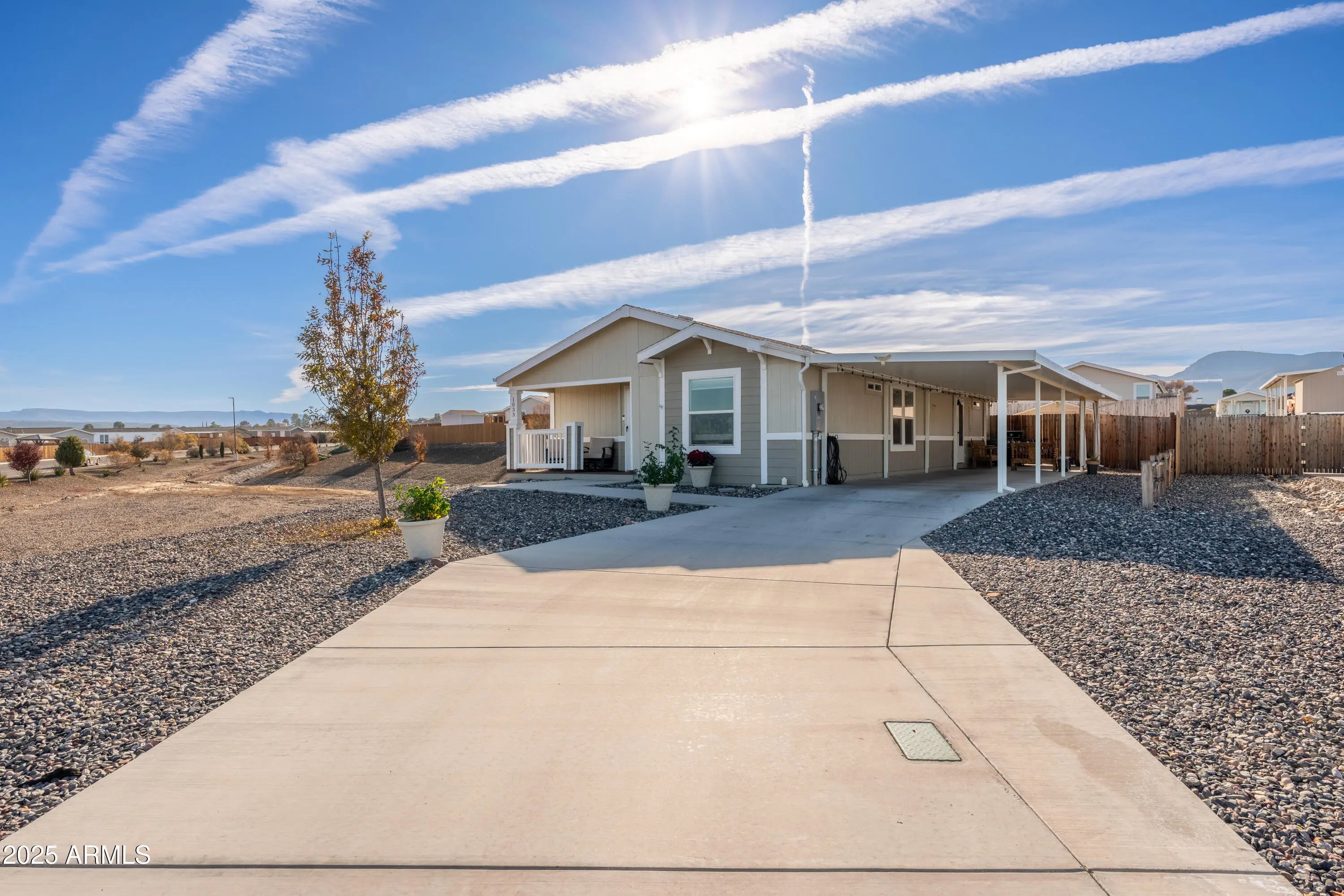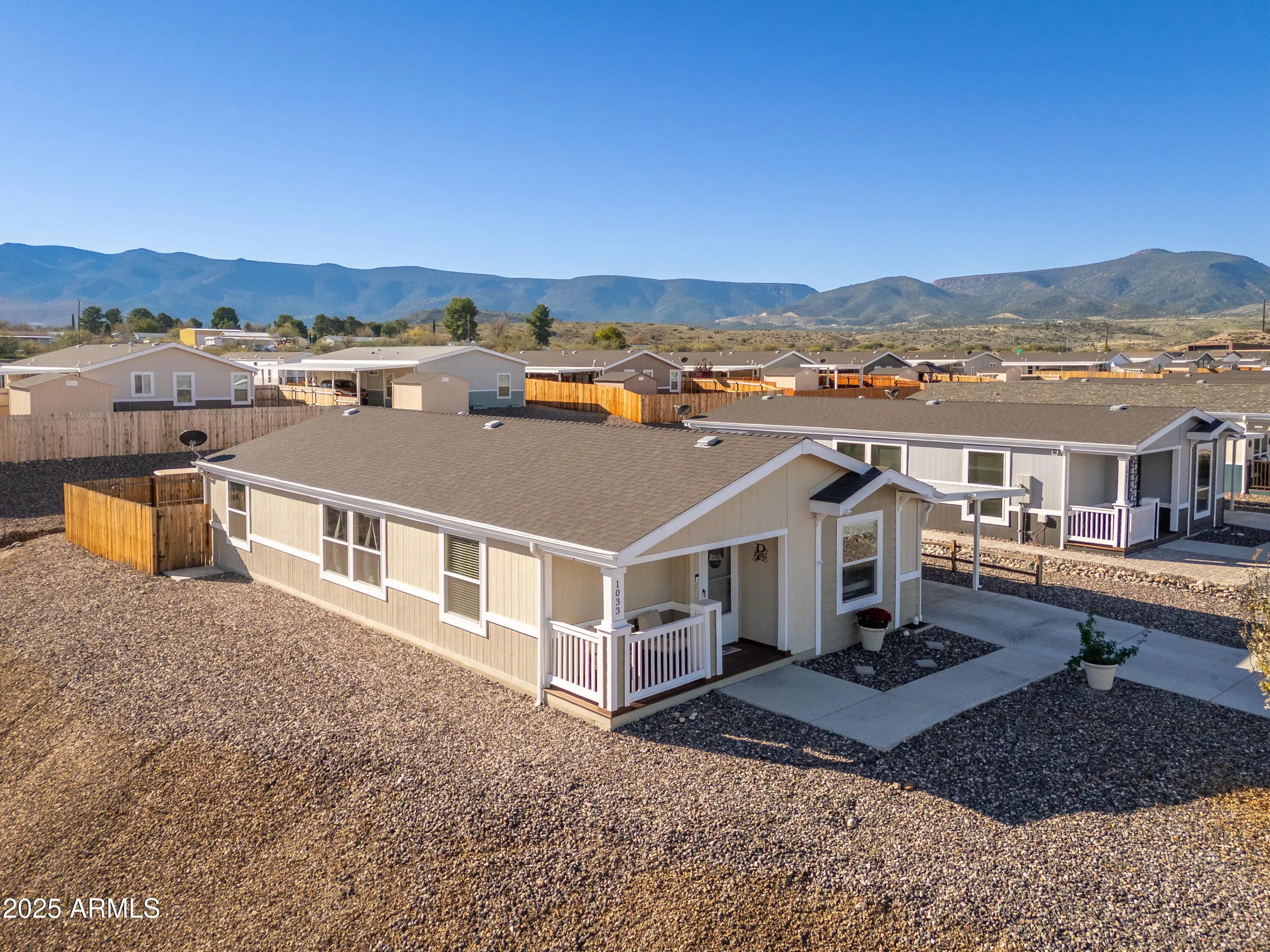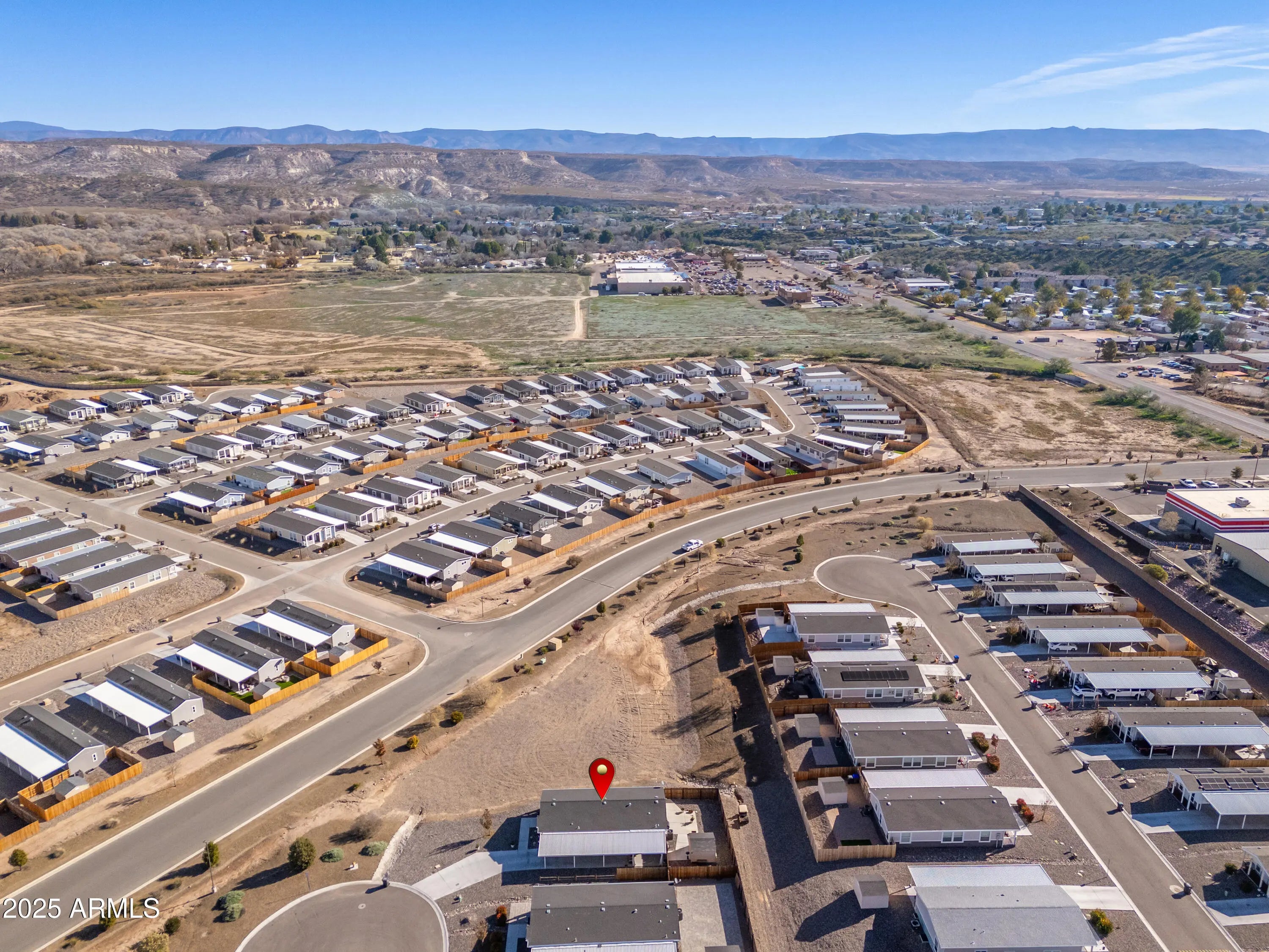 Welcome to this charming 3-bedroom, 2-bathroom 2021 manufactured home located at the end of a quiet cul-de-sac in the desirable Verde Ranch Estates community in Camp Verde. This home features a bright and spacious open-concept layout with luxury vinyl plank (LVT) flooring throughout, creating a clean and modern aesthetic. The split floor plan offers privacy and functionality, while large windows invite natural light and showcase scenic views of the adjacent common area. Outside, the property includes a double carport for covered parking, a fenced yard ideal for pets or gardening, and a storage shed for added convenience. Situated on leased land, this home provides affordable, low-maintenance living in an all-ages community that offers an impressive range of amenities including a clubhouse swimming pool, spa, fitness center, and gated access. Enjoy a peaceful neighborhood atmosphere with easy access to the Verde River, outdoor recreation, and nearby attractions in Cottonwood, Sedona, and beyond. This is a wonderful opportunity to own a newer home in a well-maintained, amenity-rich setting.