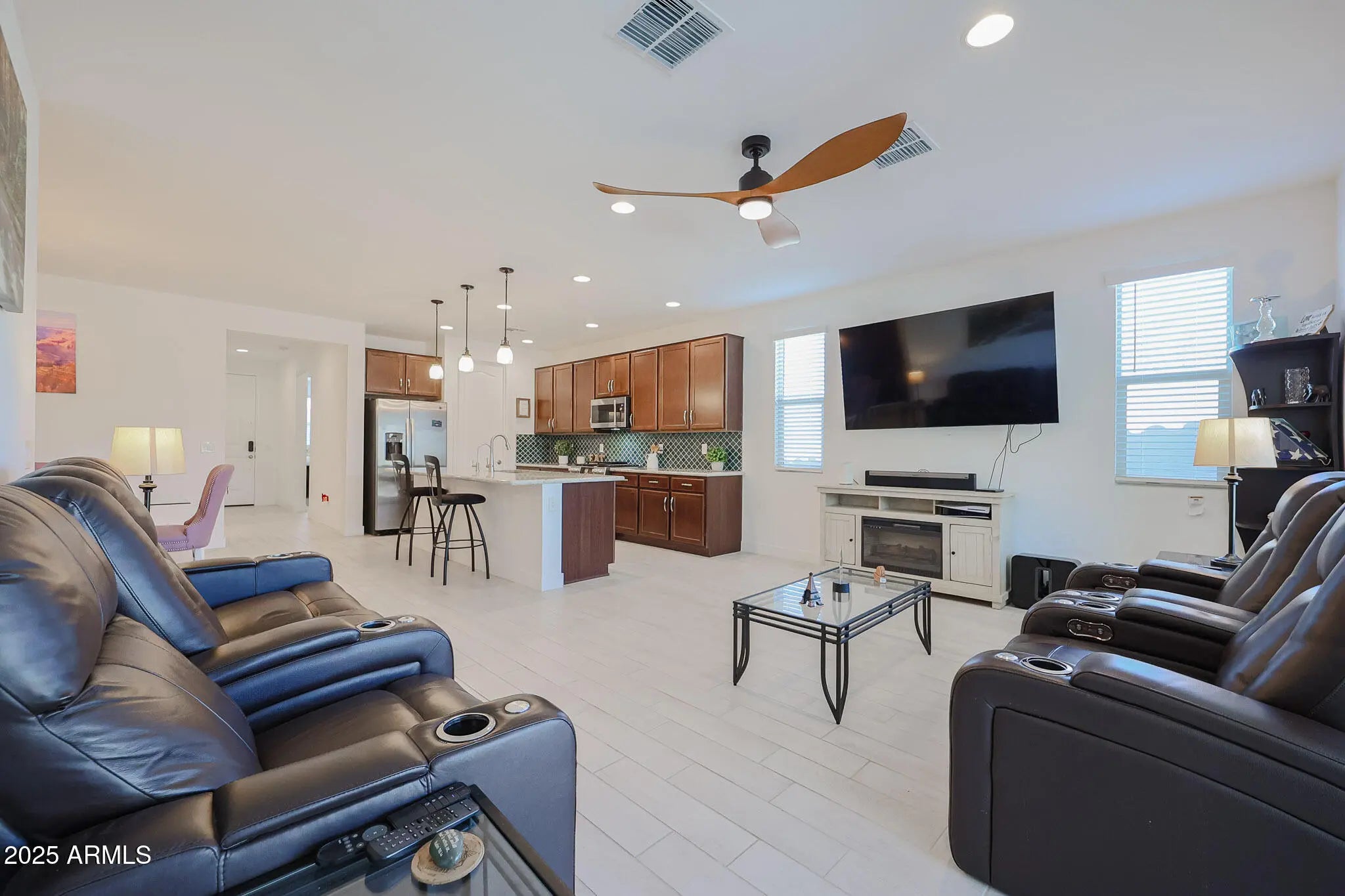Welcome to this inviting 2-bedroom, 2-bath home with a versatile den/bonus room, thoughtfully designed for comfort and easy living. Located on a corner lot the exterior offers attractive curb appeal with a paver driveway and walkway to the front door, complemented by desert landscaping and a decorative dry rock riverbed. Inside, the open great room features medium-toned wood cabinetry, a stylish tile backsplash, stainless steel appliances, and a gas stove - perfect for everyday cooking and entertaining. The kitchen flows seamlessly into a generously sized dining and entertaining area highlighted by a 3-panel sliding door that opens to the backyard, creating a bright indoor-outdoor connection. Just off the dining space, the den/bonus room includes a barn door, offering both flexibility and privacy. The spacious primary suite leads to a well-appointed bathroom with dual sinks, granite countertops, and a large walk-in shower. Outside, the fully enclosed backyard provides a blank canvas to create your ideal retreat, with a large covered patio as the centerpiece - perfect for relaxing or hosting gatherings. Plus, you can enjoy fresh fruit from the orange, lemon, and lime trees. Located in the resort-style, 55+ community of CantaMia, residents enjoy an exceptional lifestyle with indoor and outdoor pools, a state-of-the-art fitness center, pickleball and tennis courts, scenic walking trails, creative arts studios, on-site dining, and a full calendar of clubs and social activities - offering the perfect blend of relaxation, wellness, and connection.
