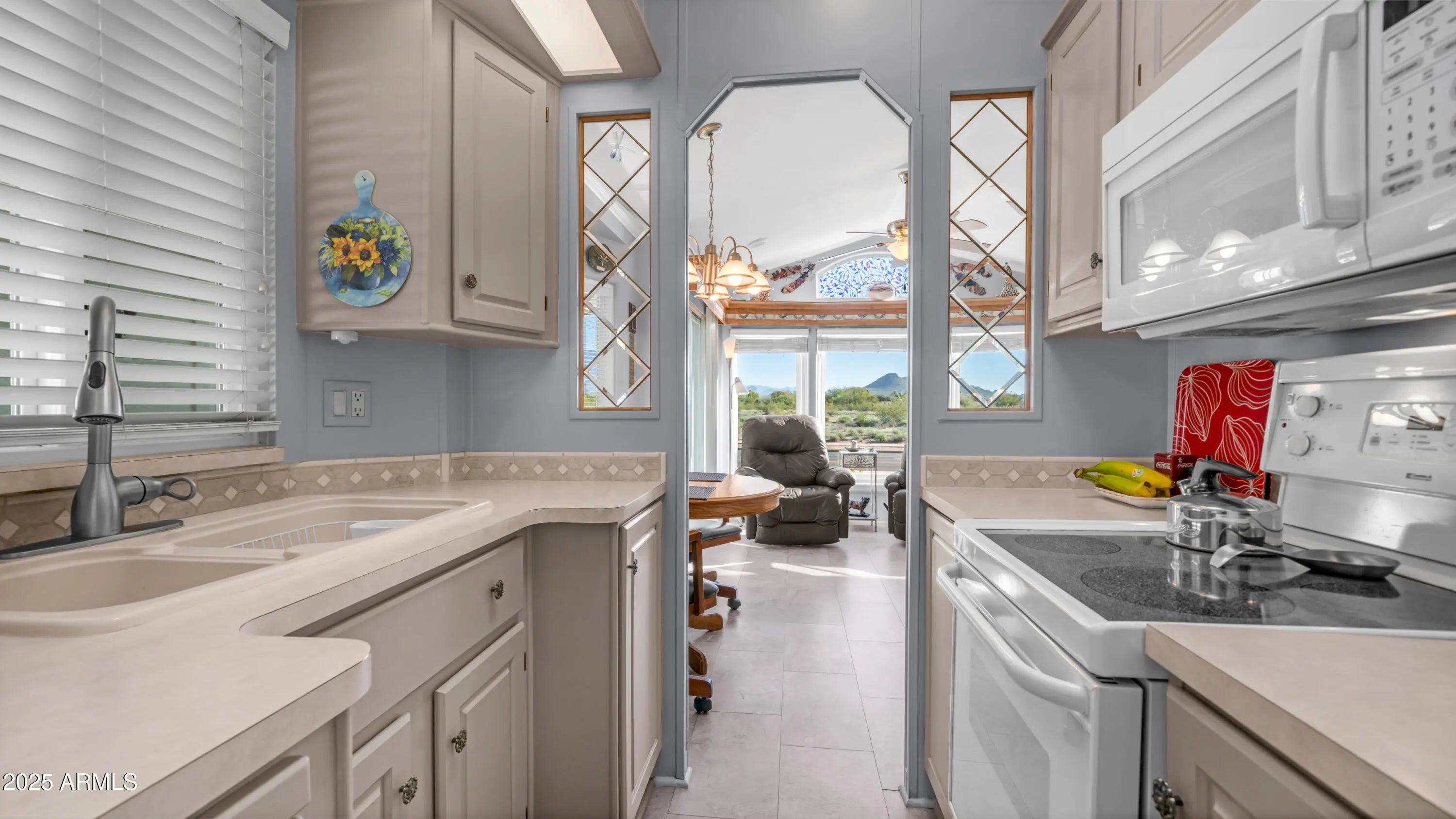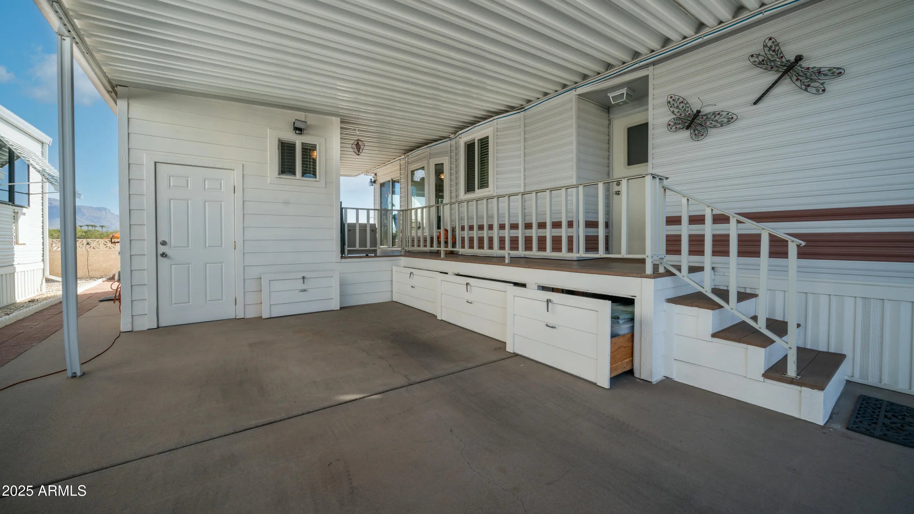 Mountains galore! Wake up every day to breathtaking, unobstructed Superstition Mountain views that truly set this home apart. From glowing sunrises to peaceful sunsets, the ever-changing scenery creates a serene and picturesque backdrop you'll never tire of. The expansive tiled deck is perfect for morning coffee, evening relaxation, or entertaining guests while soaking in the fresh air and sweeping views. An enclosed back patio offers exceptional privacy with no backyard neighbors, creating a tranquil outdoor retreat that feels both secluded and inviting. A finished, raised bonus room adds outstanding versatility and functions as a seamless extension of the home. Complete with a stacked washer and dryer and an additional sink, this flexible space is ideal for hobbies, a craft room, a home office, or additional living area tailored to your lifestyle. Storage is abundant with an extra storage shed and large pull-out storage drawers rare and highly sought-after features that make organization effortless. Inside, vaulted ceilings enhance the open and airy ambiance, complemented by durable solid-surface flooring and updated double-paned windows that improve energy efficiency, comfort, and natural light. The spacious living room is bright and welcoming, framed by even more stunning mountain views. The kitchen features updated white appliances and serves as the heart of the home, perfect for cooking, hosting, and gathering, while the bathroom offers generous counter space and ample storage for everyday convenience. The bedroom includes built-in storage, maximizing functionality without sacrificing comfort. Additional highlights include a double filtered water system that services the entire home, modern exterior paint that enhances curb appeal, and a newer A/C unit for year-round comfort and peace of mind. If you are in need of a golf cart this home is for you because the golf cart is included! Blending comfort, functionality, privacy, and unforgettable scenery, this home presents an exceptional opportunity to enjoy relaxed living in a truly scenic setting. All located in Golden Vista! Offering a sunny winter climate & activities every day of the week. Opportunities to further your current interest with woodworking, ceramics, billiards and so much more. There is something for everyone. The small-town atmosphere provides a sense of community where you can make lasting friendships. Don't miss your chance to own a piece of paradise in this unique resort!