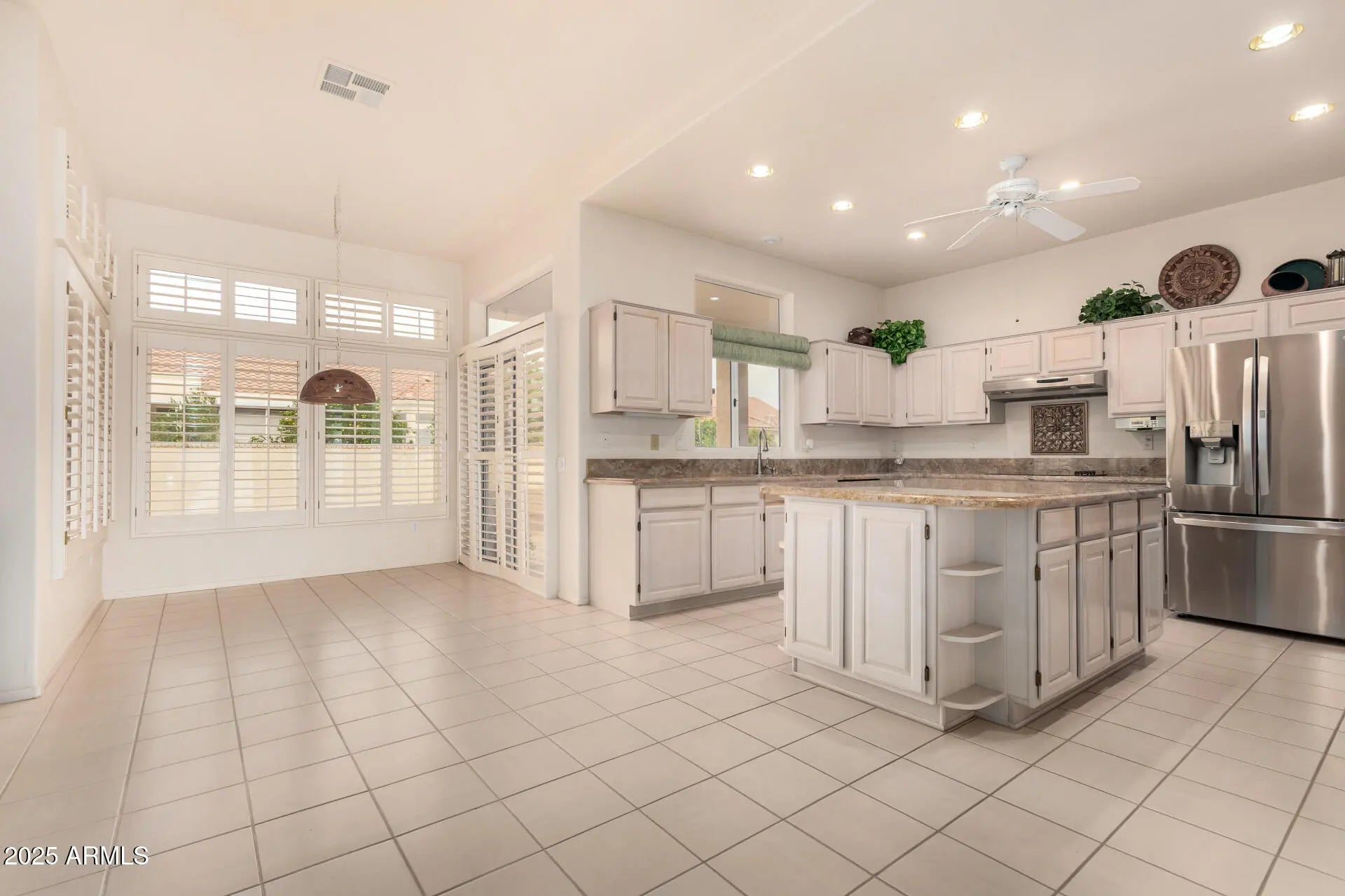 Beautiful Cottonwood model offering 2,164 sq ft with 2 bedrooms and 2.5 baths. Bright, open living and dining areas are perfect for everyday comfort and entertaining. Features include plantation shutters, tall ceilings, tile and carpet flooring, skylights, and a cozy fireplace. The spacious kitchen offers GE Profile stainless appliances, granite counters, a center island, and a sunny breakfast nook. The primary suite includes double doors, a walk-in closet, and dual vanities. Guest bedroom has its own en-suite. Laundry with ample cabinetry in the garage. Relax outdoors on the private covered patio with brick wall enclosure. Conveniently located near golf and Loop 303.