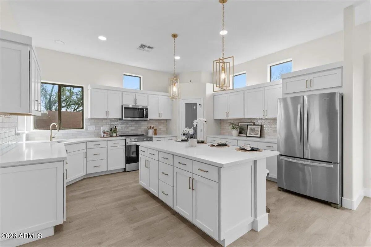 Thoughtfully redesigned with high-end finishes and exceptional craftsmanship, this fully remodeled residence offers volume, quality, and refined design at every turn. Meticulously remodeled by Lake View Homes, this expansive home showcases a dramatic double-door entry and open-concept living spaces designed for both everyday comfort and entertaining. The kitchen offers extensive cabinetry finished with timeless shaker style doors and champagne bronze hardware, along with a large walk-in pantry and seamless flow into the main living areas. A brand-new patio door opens to a newly turfed backyard, creating an easy indoor-outdoor connection ideal for Arizona evenings. The primary suite is a true retreat, complete with a soaking tub, dual vanities, and a spa-style shower with carefully selected finishes throughout. Located on a cul-de-sac, the property also includes a spacious three-car garage with built-in cabinetry for added storage. Crafted with attention to detail and quality materials by one of Scottsdale's premier remodeling firms. Welcome to your home in Cave Creek!
