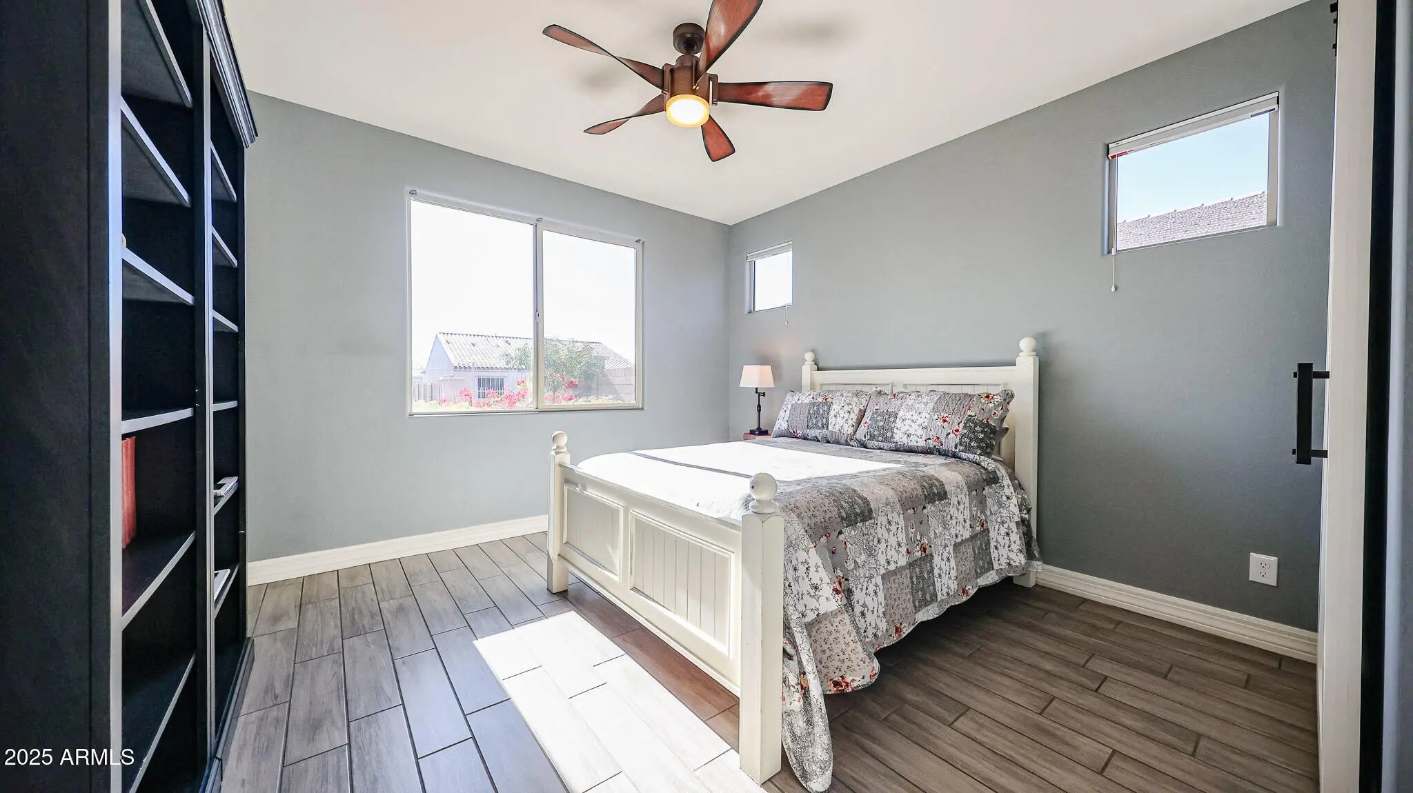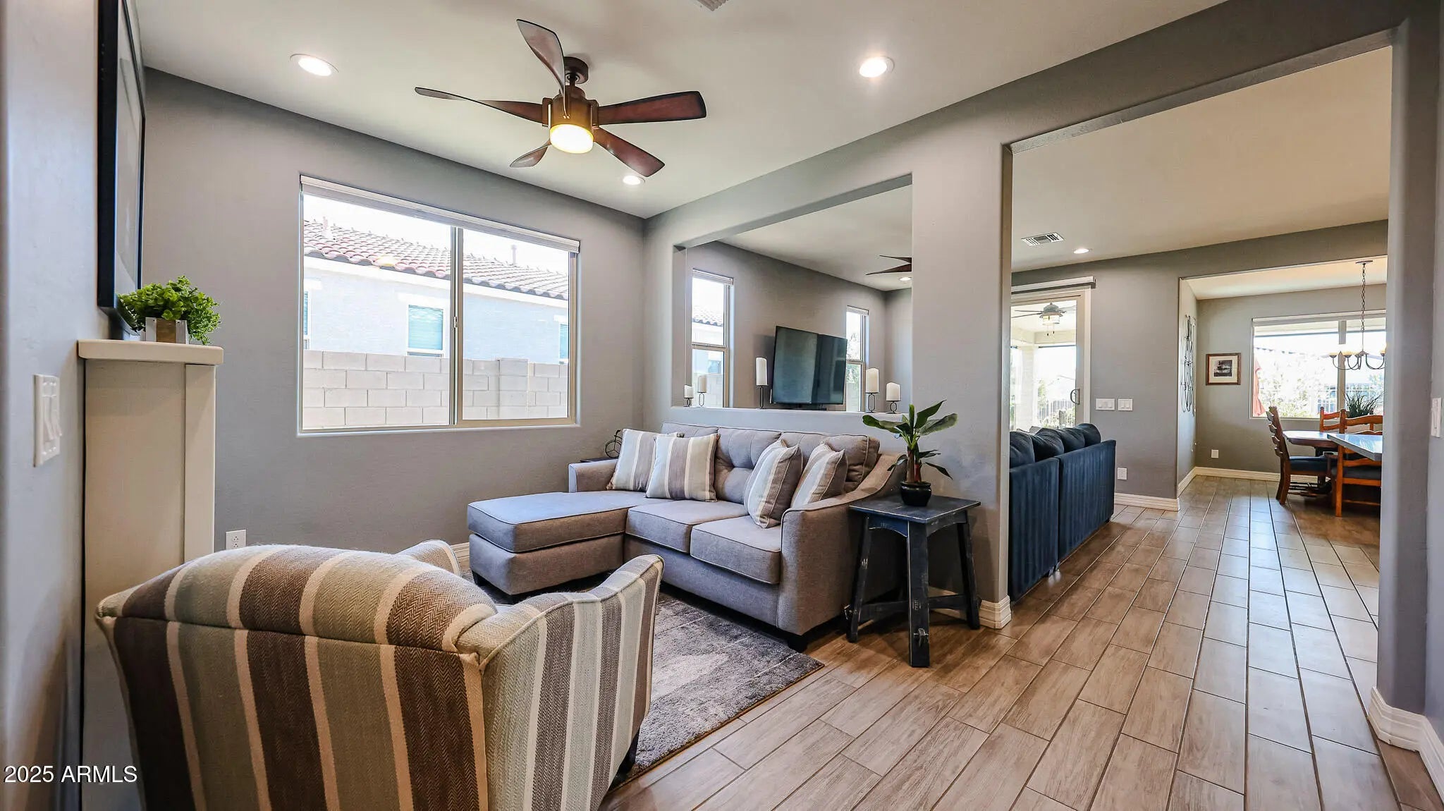 Welcome home to this beautifully designed 2-bedroom, 2-bath retreat where comfort, style, and lifestyle come together seamlessly. From the moment you arrive, the welcoming front porch and charming brick-accented exterior set the tone - inviting you to slow down, relax, and enjoy the good life. Inside, wood-look tile flows throughout the entire home (no carpet), creating a clean, modern feel with effortless maintenance. The thoughtfully designed living space includes a cozy sitting area or flex space featuring an electric fireplace - perfect for curling up with a good book, enjoying morning tea, or unwinding at the end of the day. The bright, open kitchen is a true standout, offering crisp white cabinetry, a stylish tile backsplash, quartz countertops, stainless steel appliances, pull-out shelves, and a gas stove for those who love to cook. It opens seamlessly to a spacious dining area and comfortable family room, making it ideal for everyday living and easy entertaining. The sunny primary suite is a peaceful escape, complete with dual sinks, a large walk-in shower, and a generous walk-in closet with direct access to the laundry room for added convenience. Guests will appreciate the thoughtfully designed secondary bedroom and bath, privately tucked away behind barn doors to create a comfortable guest suite with extra privacy. Step outside and discover a backyard designed for relaxation and enjoyment. The oversized covered patio features mechanical sun shades that fully enclose the space, creating a perfect year-round outdoor living area. Enjoy the soothing sounds of a tranquil water feature, mature greenery, low-maintenance artificial turf, and the added privacy of common space behind the home - no neighbors directly behind you for a more open, serene feel. All of this is located within the award-winning, 55+ resort-style community of CantaMia, where every day feels like a vacation. Residents enjoy indoor and outdoor pools, a state-of-the-art fitness center, pickleball and tennis courts, scenic walking trails, creative arts studios, on-site dining, and a vibrant calendar of clubs and social activities. This is more than a home - it's a lifestyle filled with comfort, connection, and endless opportunities to enjoy each day to the fullest.