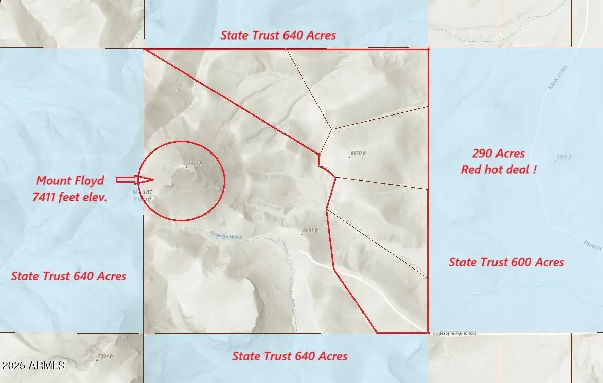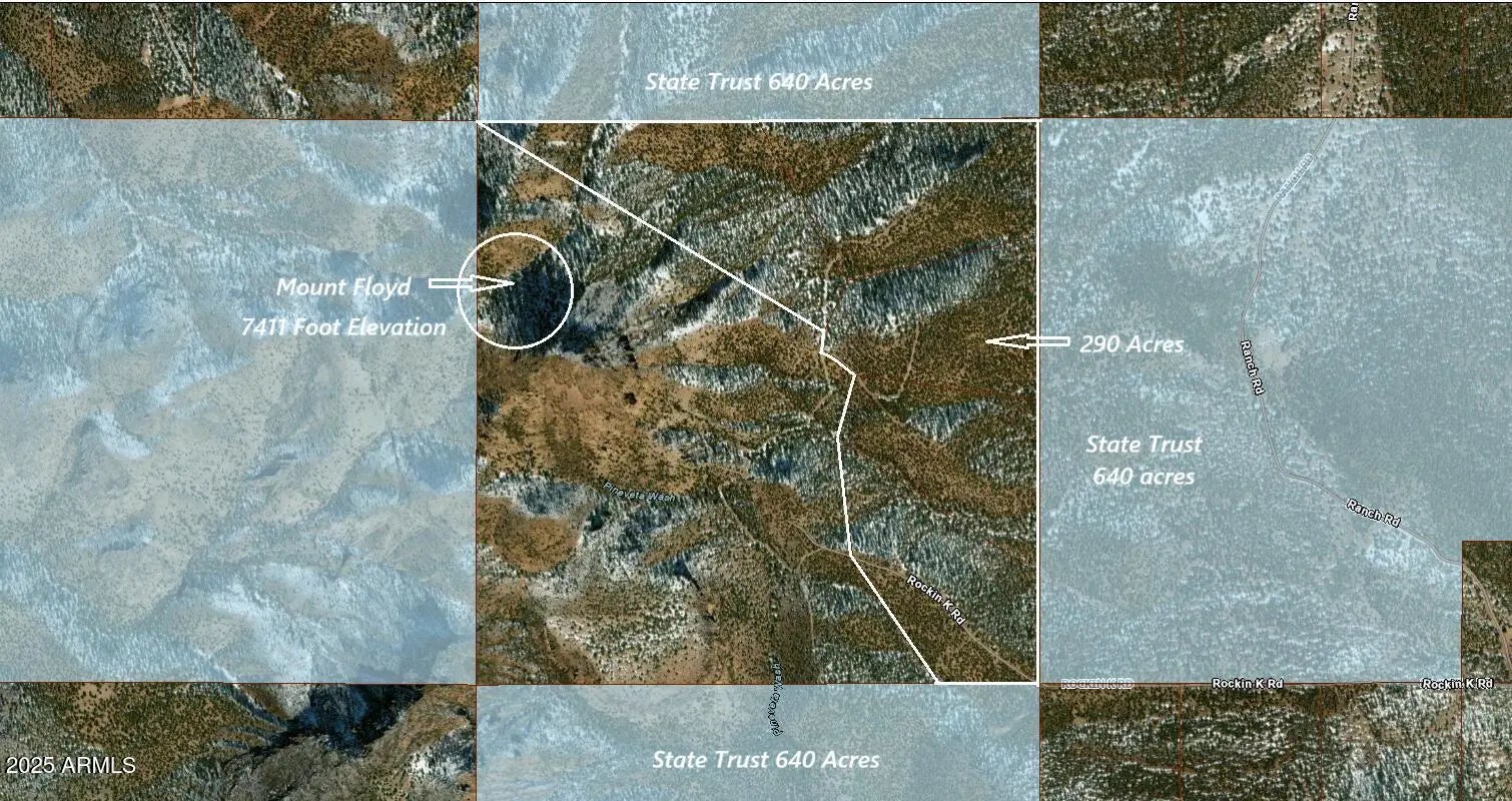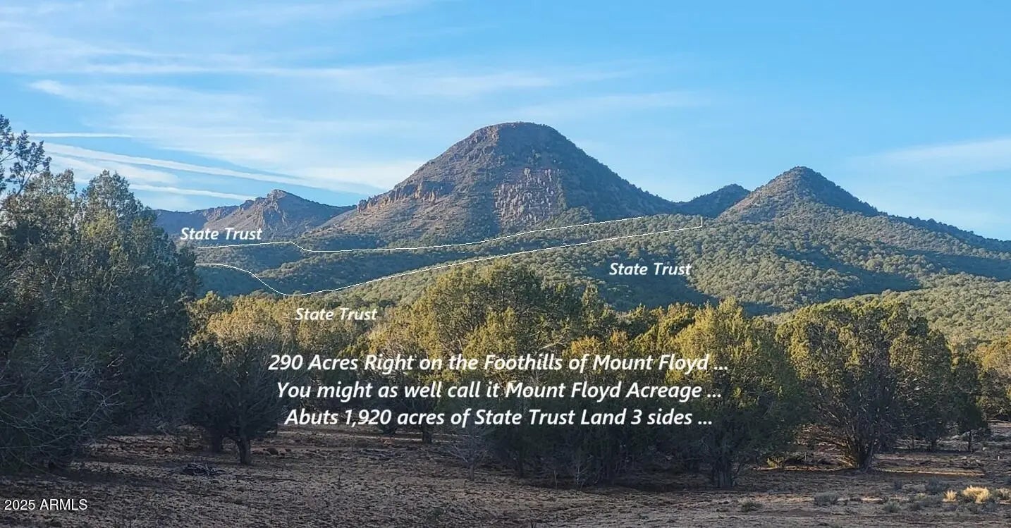 Mount Floyd property, 5 Lots selling as a whole 290.86 acres. With 6 canyons and six ridges there is no shortage of Spectacular building areas with Awesome Views ! Zoned General 10 acre minimum. You don't have to live in Alaska, Montana or Idaho to enjoy living among the clouds. Right here in Arizona with average summer temps at 85 degrees and mild winters. Elk and Deer Country smack dab in the middle of hunt unit 10. Build that dream Hunt Lodge or Cabin. Dedicated Roads will get you to most the property. Currently 4x4 recommended. The roads are in but could use some maintenance. There is a Road Association but no HOAs. Surrounded by 3 square miles of State Trust land for additional privacy. All pictures are from property except cover photo taken from my front porch. And wildlife.