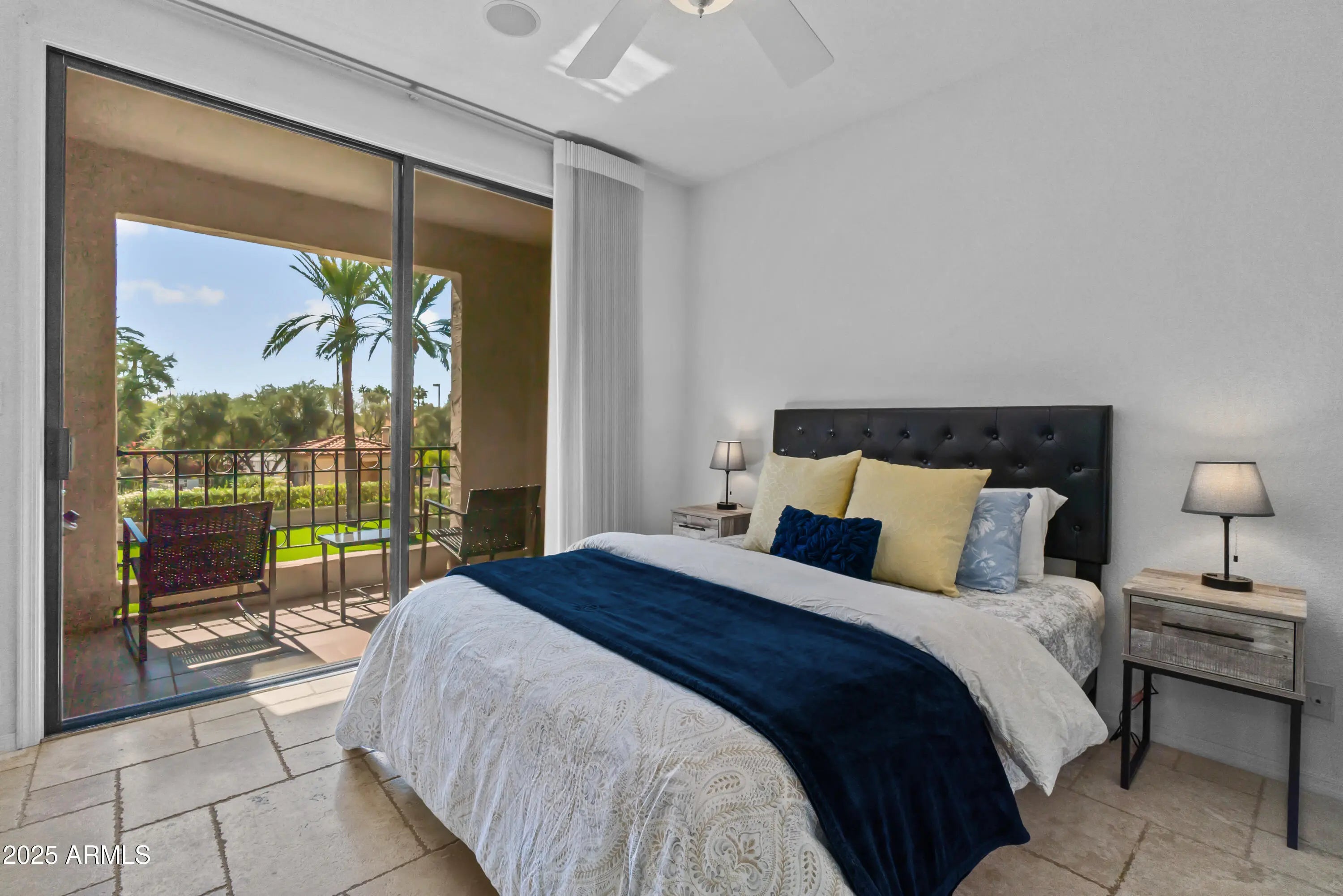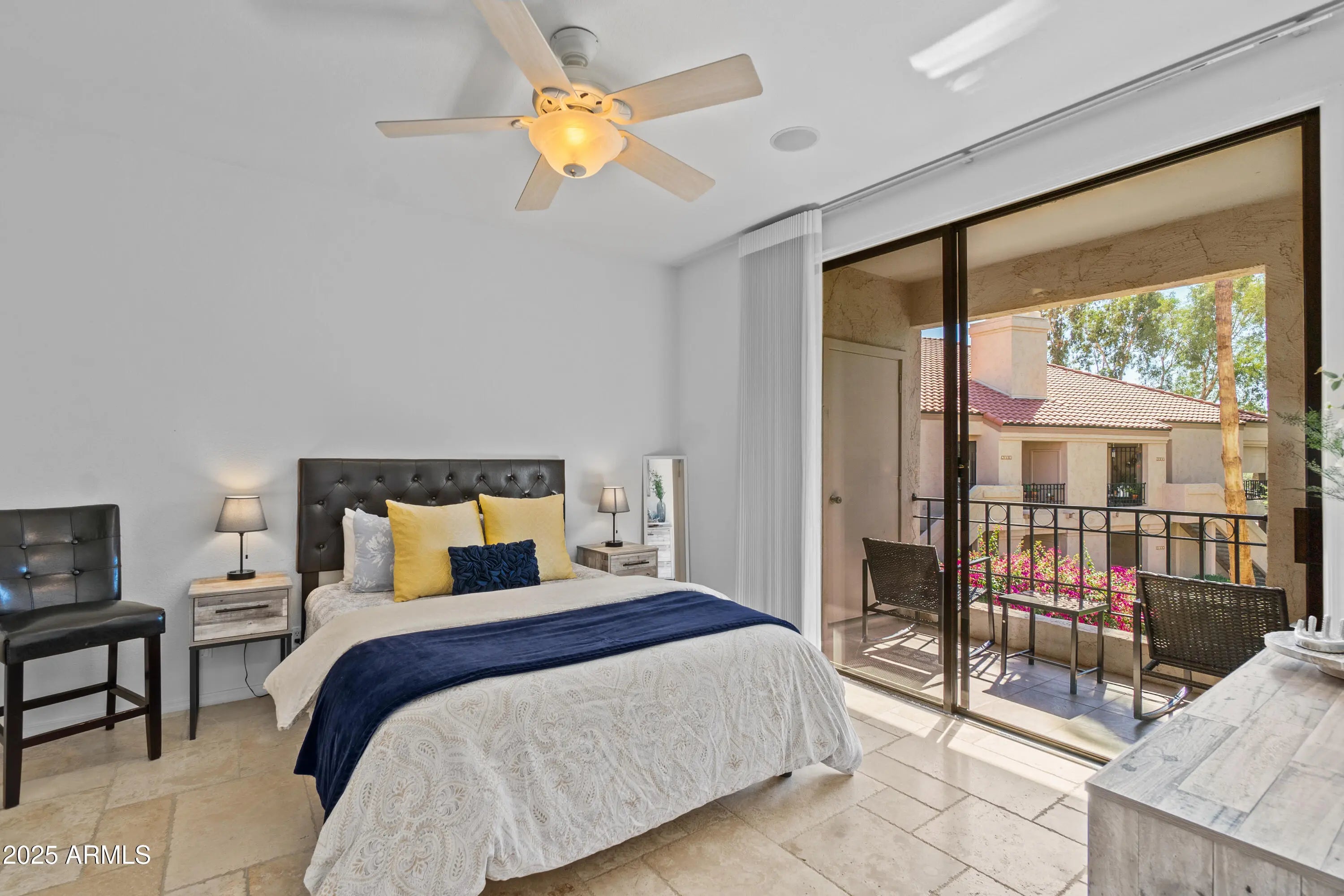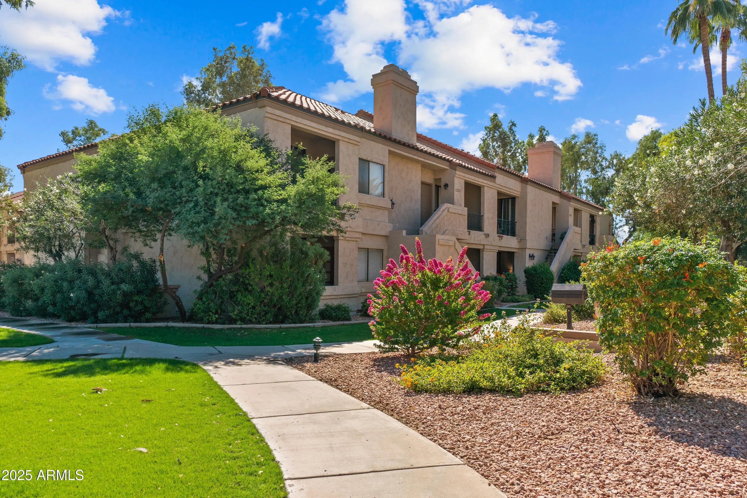 Move-in ready, this 2-bedroom, 2-bathroom condo offers effortless living in a light and bright space. Includes access to the lake at Scottsdale ranch. The very unique, oversized kitchen—like no other in this complex—is an entertainer's delight, featuring stainless steel appliances, granite countertops, and ample cabinetry. Island table is movable and tiled underneath if you would like a different table option. Each bedroom has its own private patio, perfect for relaxing outdoors. Neutral paint throughout enhances the open feel creating a welcoming atmosphere. Enjoy modern comfort with included appliances-a true turn-key gem! Unit is currently vacant and cleared of furniture and furnishings. Pictures show how the unit looked furnished.