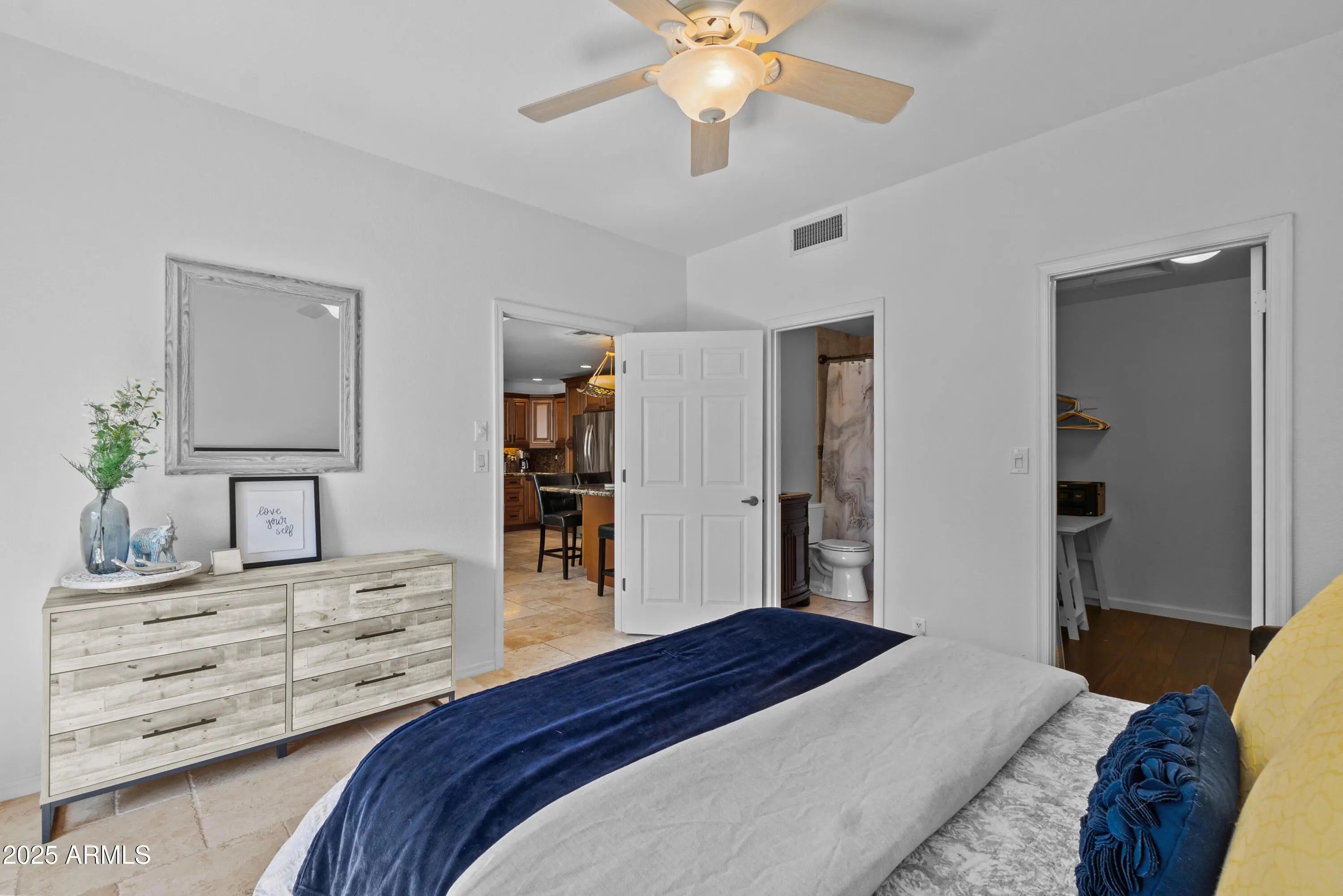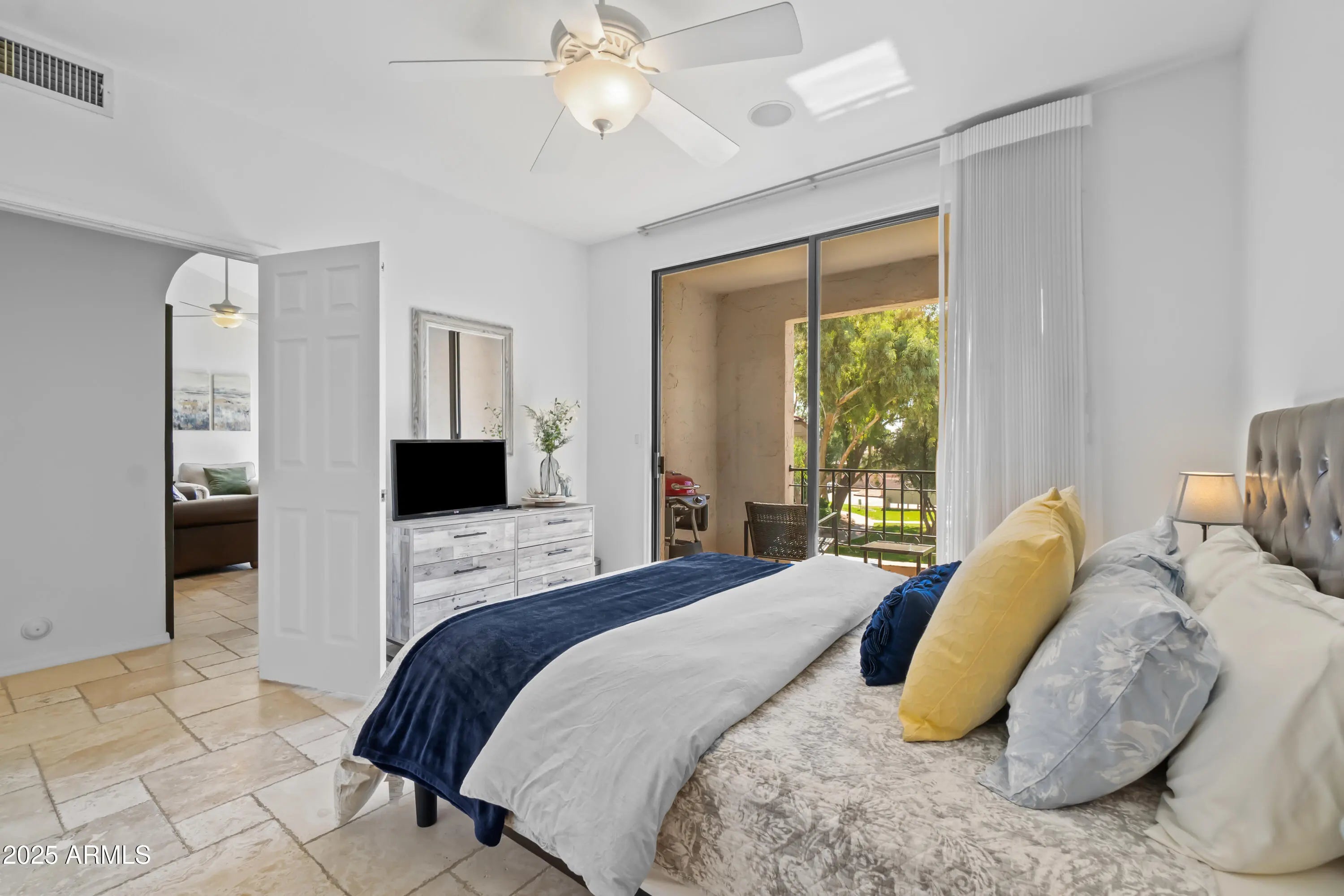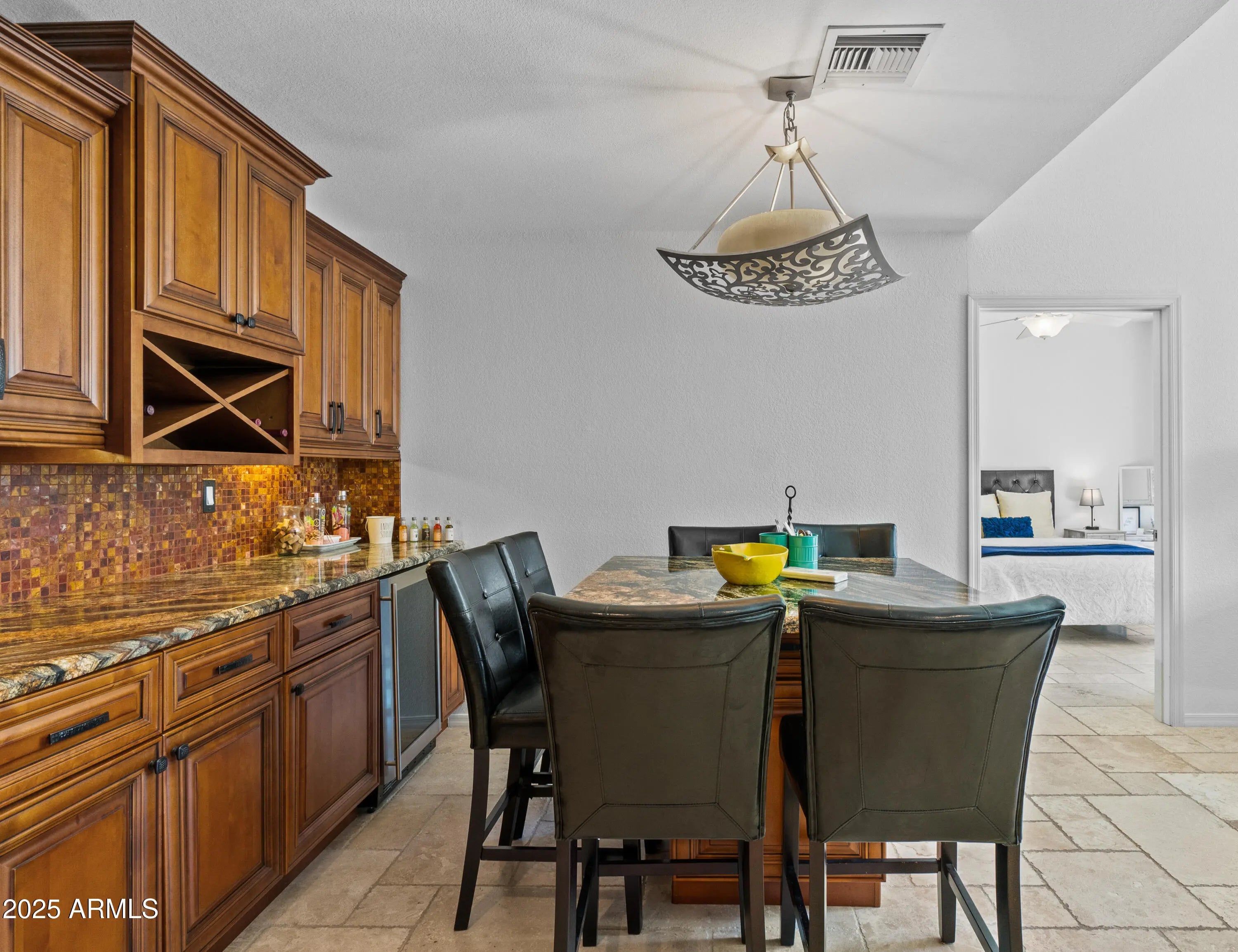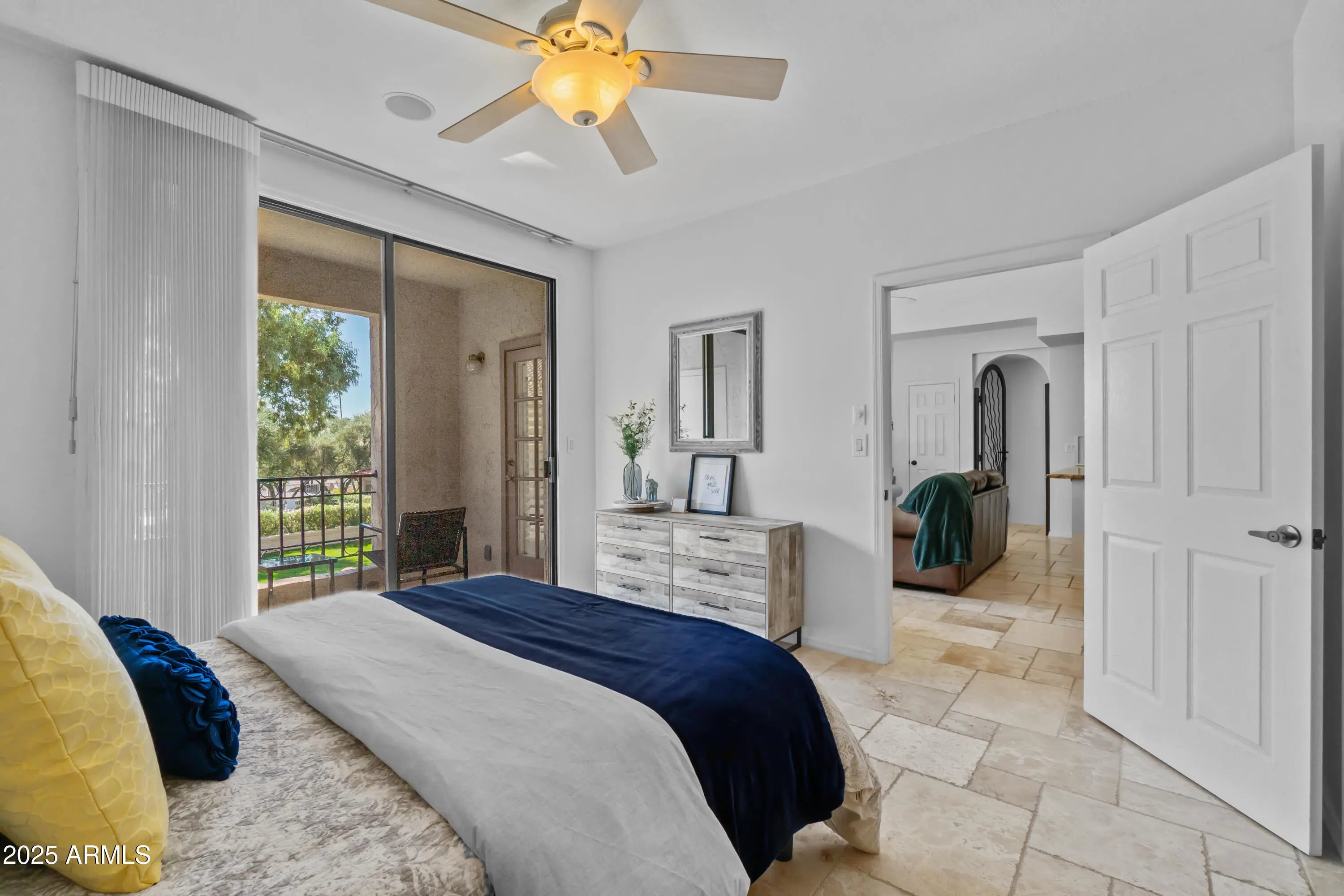 Move-in ready, this 2-bedroom, 2-bathroom condo offers effortless living in a light and bright space. Includes access to the lake at Scottsdale ranch. The very unique, oversized kitchen—like no other in this complex—is an entertainer's delight, featuring stainless steel appliances, granite countertops, and ample cabinetry. Island table is movable and tiled underneath if you would like a different table option. Each bedroom has its own private patio, perfect for relaxing outdoors. Neutral paint throughout enhances the open feel creating a welcoming atmosphere. Enjoy modern comfort with included appliances-a true turn-key gem! Unit is currently vacant and cleared of furniture and furnishings. Pictures show how the unit looked furnished.