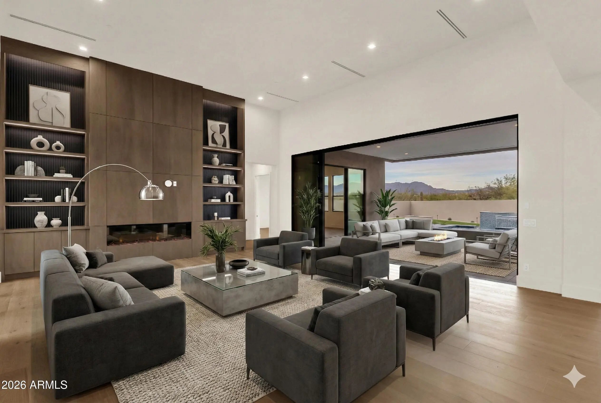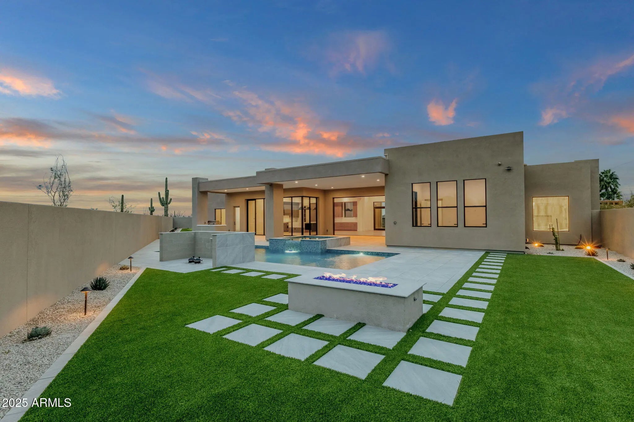 BRAND NEW LUXURY CONSTRUCTION! Completed in 2025, this striking modern desert style, single-level custom residence offers 4 bedrooms, 4 1/2 baths, with a thoughtfully designed split floor plan and expansive indoor-outdoor living located at the end of a cul-de-sac on a private desert lot. Modern style accents along with large panels of glass and natural light accentuate this gorgeous custom home. Large pocket-style sliding glass doors fully retract to open the interior to the covered patio, creating true indoor-outdoor living. A circular driveway creates a grand arrival experience and provides additional parking, framed by low-maintenance desert landscaping and open natural surroundings. The open great room is anchored by a custom floor-to-ceiling fireplace wall with built-in shelving, while the kitchen features a large waterfall island, custom cabinetry, premium appliances, walk-in pantry, and statement pendant lighting, all positioned to connect seamlessly with the main living and dining areas. The outdoor living area features a built-in BBQ with stainless steel grill, prep counters, storage, and sink, making it ideal for outdoor cooking and entertaining. The backyard is designed as a private resort-style retreat. Outdoor amenities include a custom pool and spa with a waterfall feature, expansive stone decking, and multiple seating and lounging areas. A custom putting green is integrated into the landscape, along with turf lawn areas and thoughtfully designed desert landscaping for low maintenance. The outdoor spaces capture open desert scenery and mountain views, with west-facing exposure offering dramatic sunset skies. The primary suite provides direct access to the outdoor living space and includes a spa-style bath with dual floating vanities, a soaking tub and walk-in shower. The custom walk-in closet is outfitted with floor-to-ceiling built-ins, glass-front cabinetry, integrated lighting, and tailored storage that rivals a luxury boutique setting. Secondary en-suite bedrooms are generously sized offering flexibility for guests or additional living needs. The property offers a sense of privacy, open views, and connection to the surrounding desert environment. Located approximately 6.2 miles from Brown's Ranch Trailhead and 6.8 miles from Fraesfield Trailhead within the McDowell Sonoran Preserve, the property offers access to miles of hiking, biking, and equestrian trails. Granite Mountain Trailhead is approx. 7.4 miles, and Pinnacle Peak Park is approx. 8.9 miles. The Scottsdale Road corridor (~7.2 mi). Loop 101 freeway access is approx. 6.9 miles. This residence combines custom modern architecture, true indoor-outdoor living and resort-style outdoor amenities.