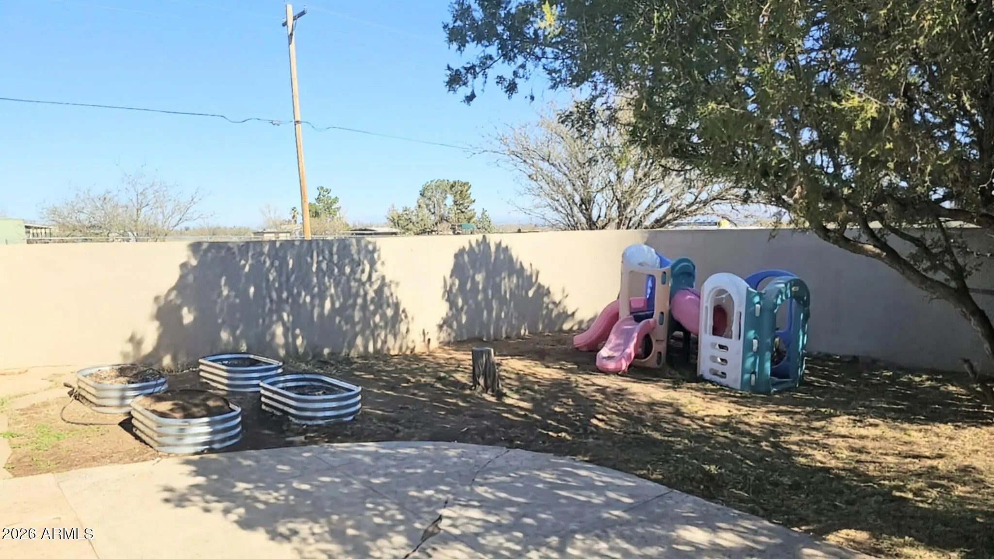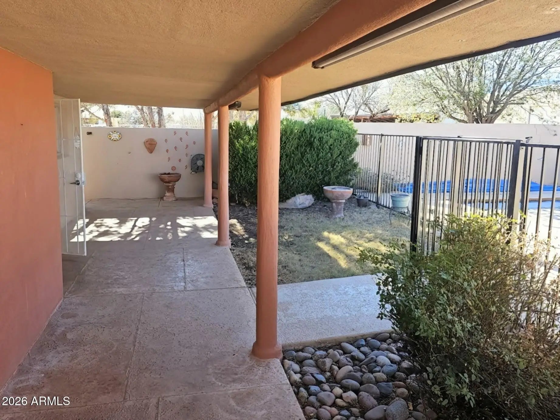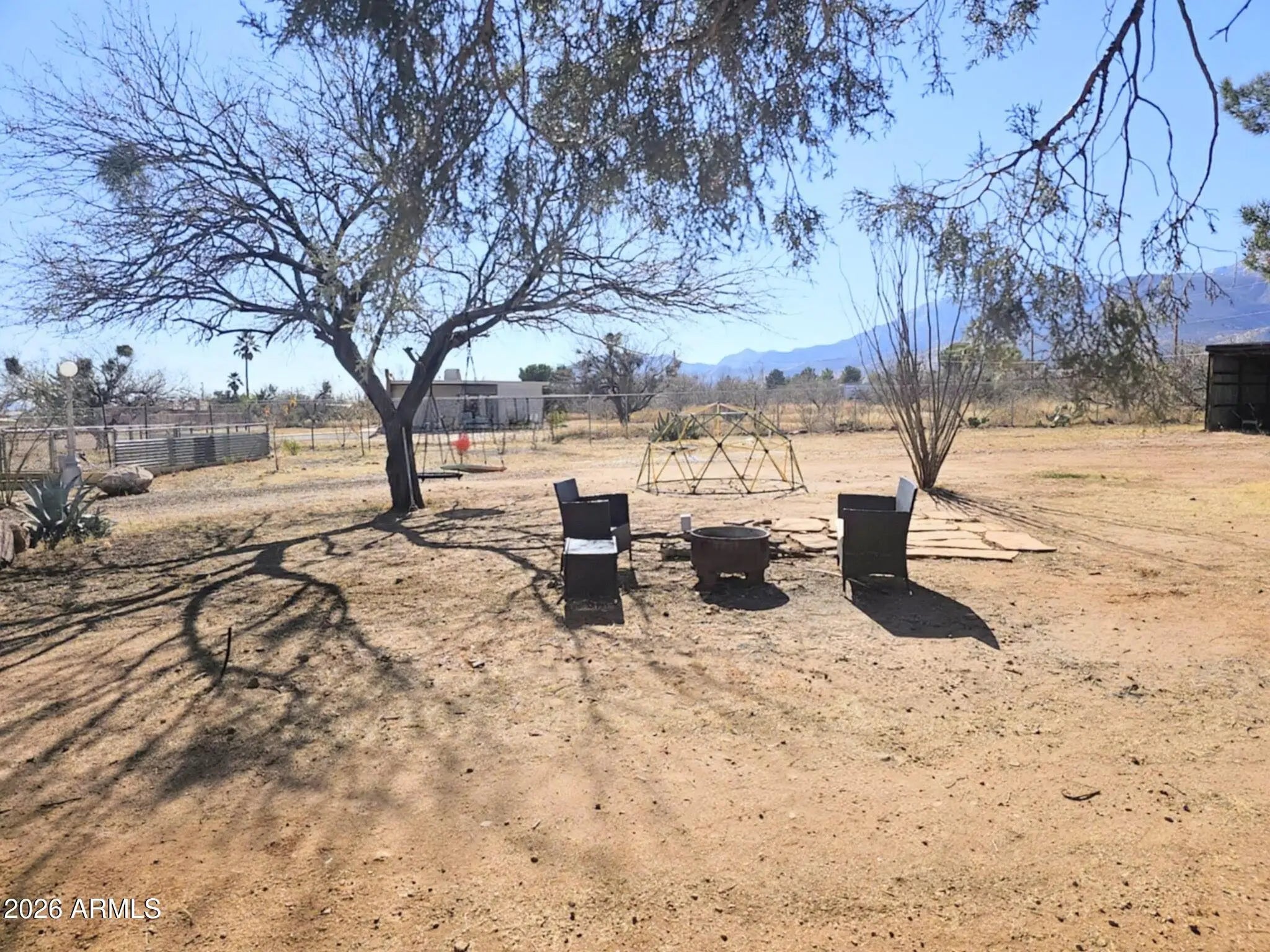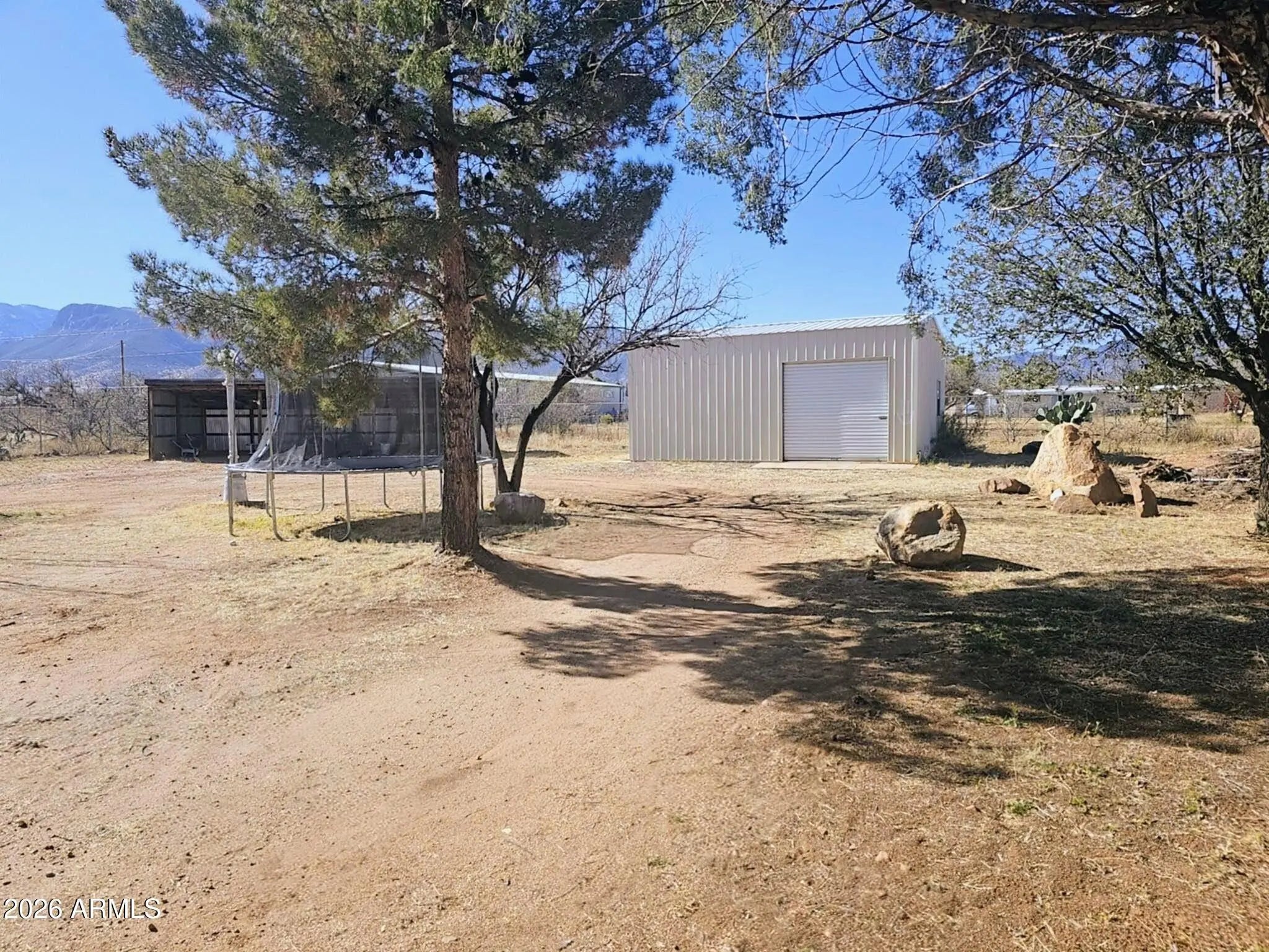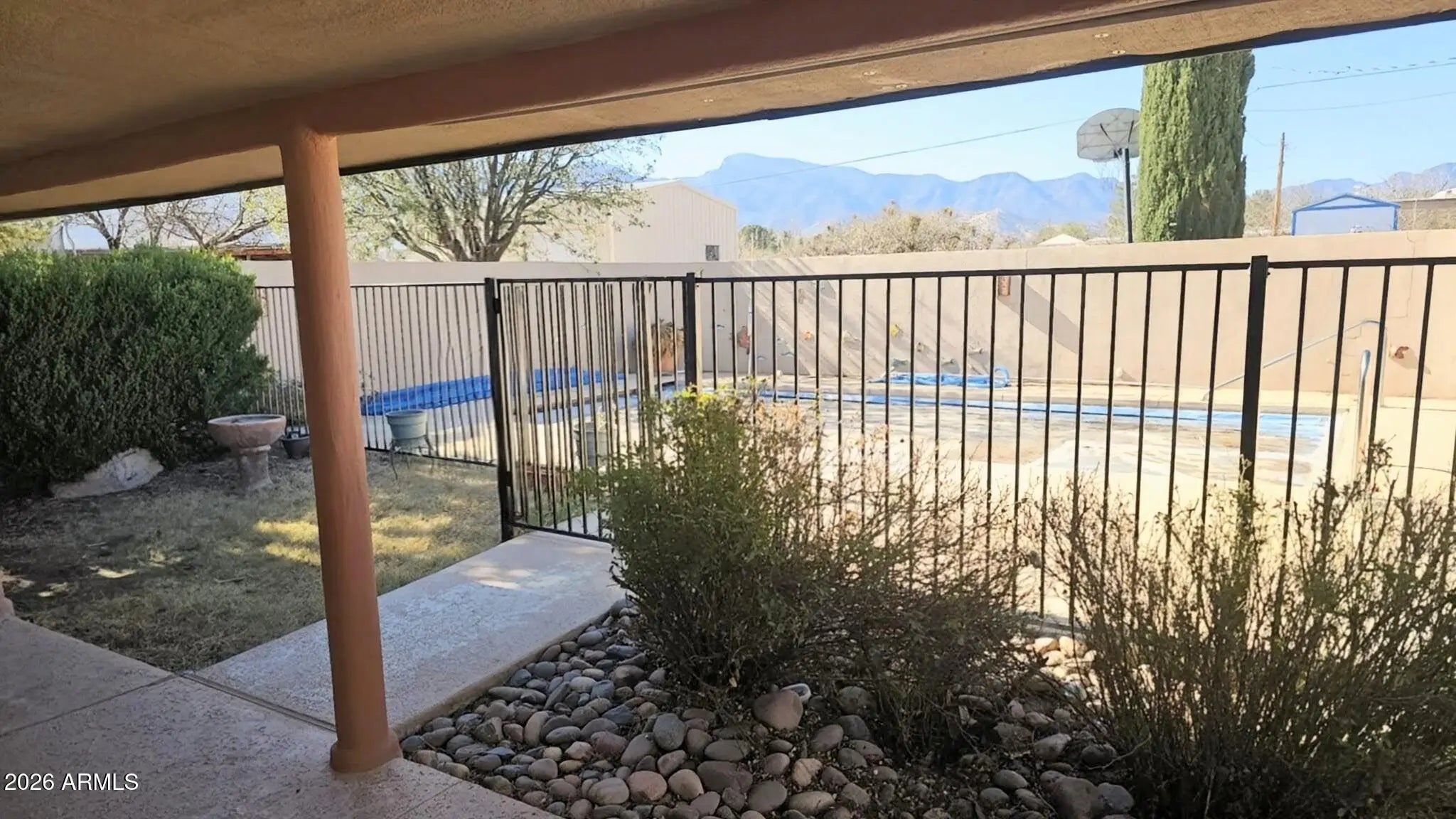 Situated on over an acre and fully fenced, this East/West-facing property offers stunning mountain views and exceptional privacy. The cozy, well-maintained 3 bed, 2 bath home features a fireplace, dedicated office space, new carpet, and inviting living areas throughout. Enjoy outdoor living w/ a private front courtyard and a backyard designed for relaxation; complete w/ a covered patio, built-in pool and spa, and a private block wall enclosure. A 21x26 fenced garden area is perfect for growing your own produce, while an additional fenced space is ideal for horses, dogs or chickens. New $30k septic system installed. Property includes excellent utility and storage options, including a 24x20 metal shed w/ a concrete floor and roll-up door, plus a 36x13 open-front covered parking/storage.