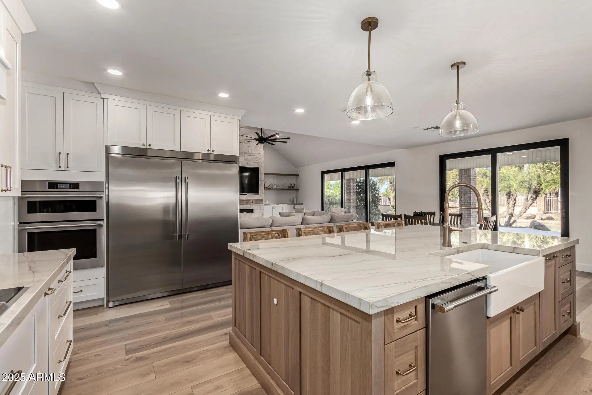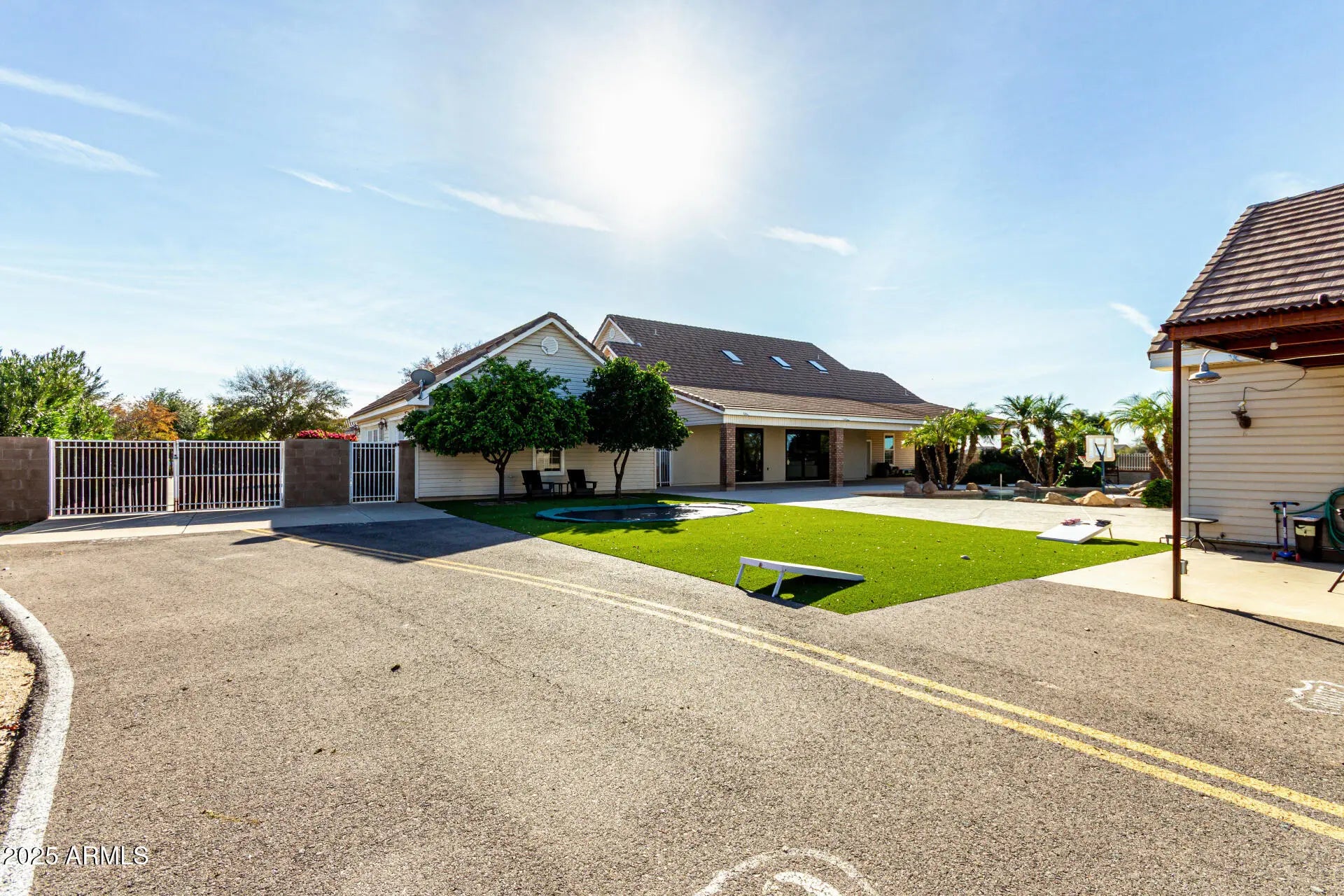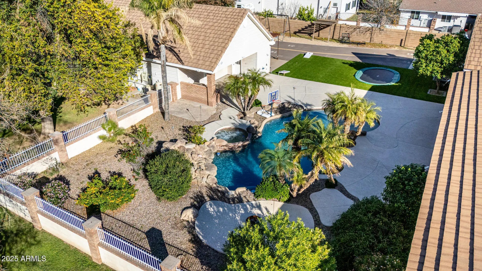 Charming from the moment you drive up. Awesome neighborhood, N/S cul-de-sac lot, 4 bedroom, 4 bath w den, split floor plan featuring ground level primary bedroom en suite. Newly remodeled throughout; 12 ft and 8 ft sliders w openings on both sides, luxury laminate floor, carpet, new roof, water heaters & garage doors, gorgeous fireplace,full kitchen remodel w dual sink, cabinets, countertops, appliances, wine bar. Car enthusiasts will love dual garages situated on east side of home. Over sized 3 car garage detached from home for superior safety & another temperature controlled 4 car garage w/ a full bathroom & two attached patios; could also easily convert to a casita/pool house. Backyard oasis is an entertainers dream; pool & hot tub, irrigated grass,built in bbq & trampoline. See list