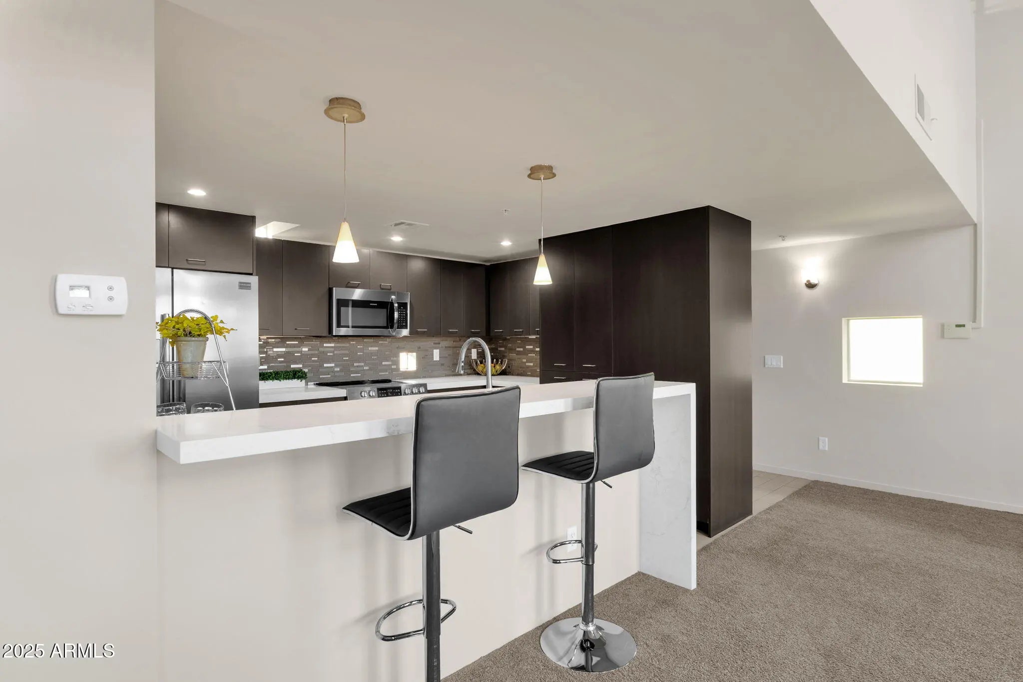 Penthouse Living in Downtown Tempe! Welcome to this stunning 3rd-floor penthouse condominium at The Vale, one of downtown Tempe's most iconic residential communities designed by renowned architect Will Bruder. Offering 3 bedrooms, 3 bathrooms, and 2,257 square feet, this modern residence blends architectural drama with everyday comfort. The expansive great room immediately impresses with its soaring 22-foot vaulted ceilings and a north-facing wall of windows showcasing breathtaking views of Camelback Mountain and Tempe. Upstairs, additional south-facing windows capture scenic vistas of Diablo Mountain and South Tempe, filling the home with natural light throughout the day. The open-concept kitchen is designed for both function and style, featuring quartz countertops, modern cabinetry, a breakfast bar, pantry storage, and stainless steel appliances, including a side-by-side counter-depth refrigerator. Porcelain tile flows through the kitchen, laundry, and bathrooms, while neutral carpeting adds warmth to the living areas and bedrooms. All 3 bedrooms include walk-in closets, with the primary suite offering a spa-like retreat complete with a walk-in shower, soaking tub, and dual sinks. A spacious loft provides flexible space ideal for a home office, media room, or creative studio, enhanced by adjustable cable lighting. This home has been thoughtfully updated with a full remodel in 2020 and fresh interior paint in 2025, along with a new HVAC system (2023). Additional features include double-pane windows, a fire sprinkler system, an alarm system with motion and door sensors, pendant lighting, wall sconces, and ceiling fans with lights throughout. The community itself has seen significant recent improvements, including exterior painting, new landscaping, pool and hot tub resurfacing, and updated entry gate hardware (2024-2025). Residents enjoy a heated pool and spa, fitness center, gated access, and pet-friendly green space. Parking is a breeze with a spacious 2-car detached garage plus underground parking, offering ample storage. Perfectly located just one mile from ASU, with the Tempe Orbit shuttle stop right outside the gate, this highly walkable and bike-friendly neighborhood places you minutes from restaurants, shopping, Tempe Lake Park, the Center for the Arts, and Sky Harbor International Airport. This is penthouse living at its finest: modern, architectural, and perfectly positioned in the heart of it all.