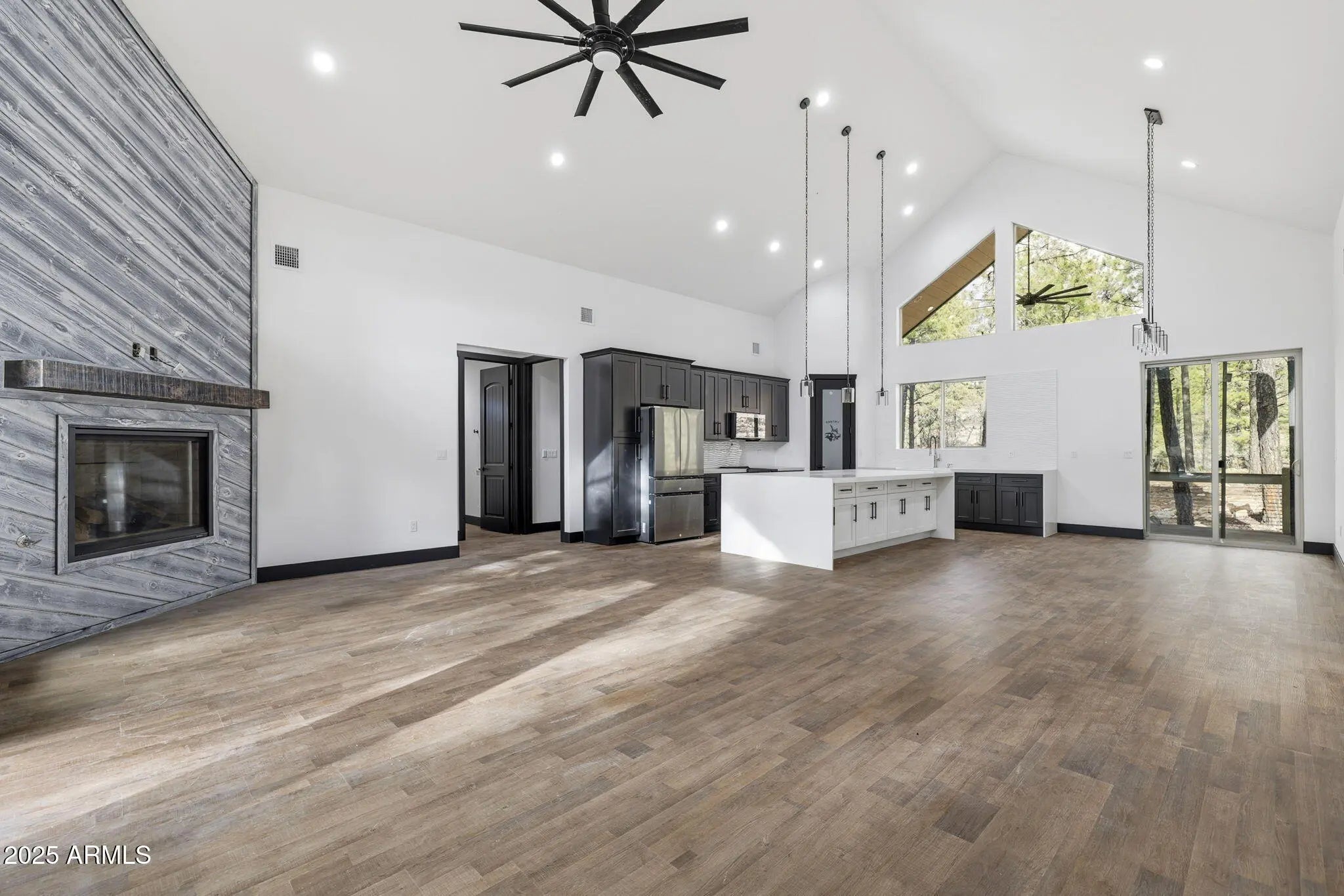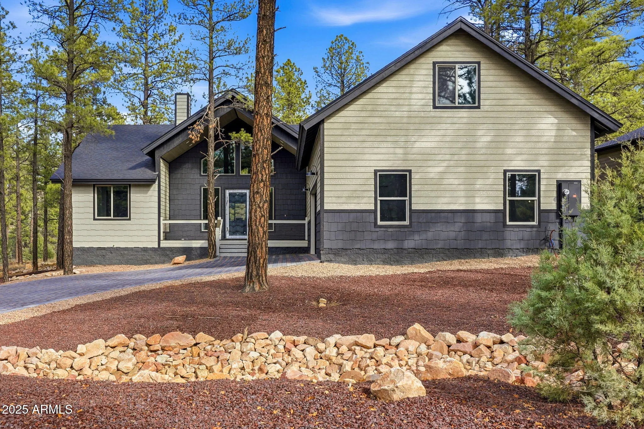Welcome to this beautifully crafted new construction home offering 2,867 square feet of thoughtfully designed living space on a meticulously landscaped lot. A paver driveway and covered front porch create inviting curb appeal, while the open-concept interior is enhanced by soaring vaulted ceilings and abundant natural light. The spacious living room serves as the heart of the home, featuring a dramatic floor-to-ceiling fireplace. The modern kitchen is a showstopper with a large waterfall-edge center island offering ample storage, stainless steel appliances, and a classic apron-front sink - perfect for both everyday living and entertaining. The split-bedroom floor plan provides privacy and comfort. The primary suite is a true retreat, complete with a walk-in closet, dual vanities, a.... walk-in shower, and a separate soaking tub. Two additional bedrooms and well-appointed bathrooms offer flexibility for family or guests. A large bonus room above the garage includes its own bathroom with a walk-in shower, making it an ideal fourth bedroom, guest suite, or private office. The laundry room is both functional and stylish with built-in cabinetry and an apron-front sink. Enjoy peaceful outdoor living on the covered back deck overlooking serene forest views. With high-end finishes, modern design, and exceptional attention to detail throughout, this home perfectly blends comfort, style, and functionality.