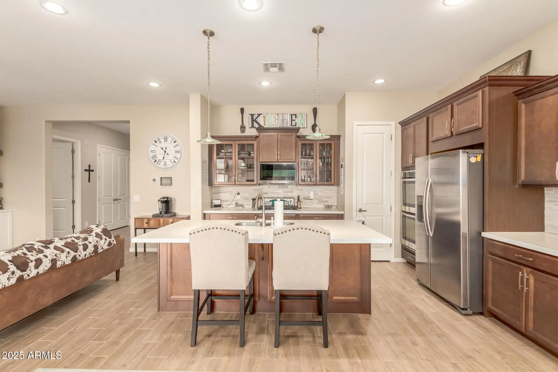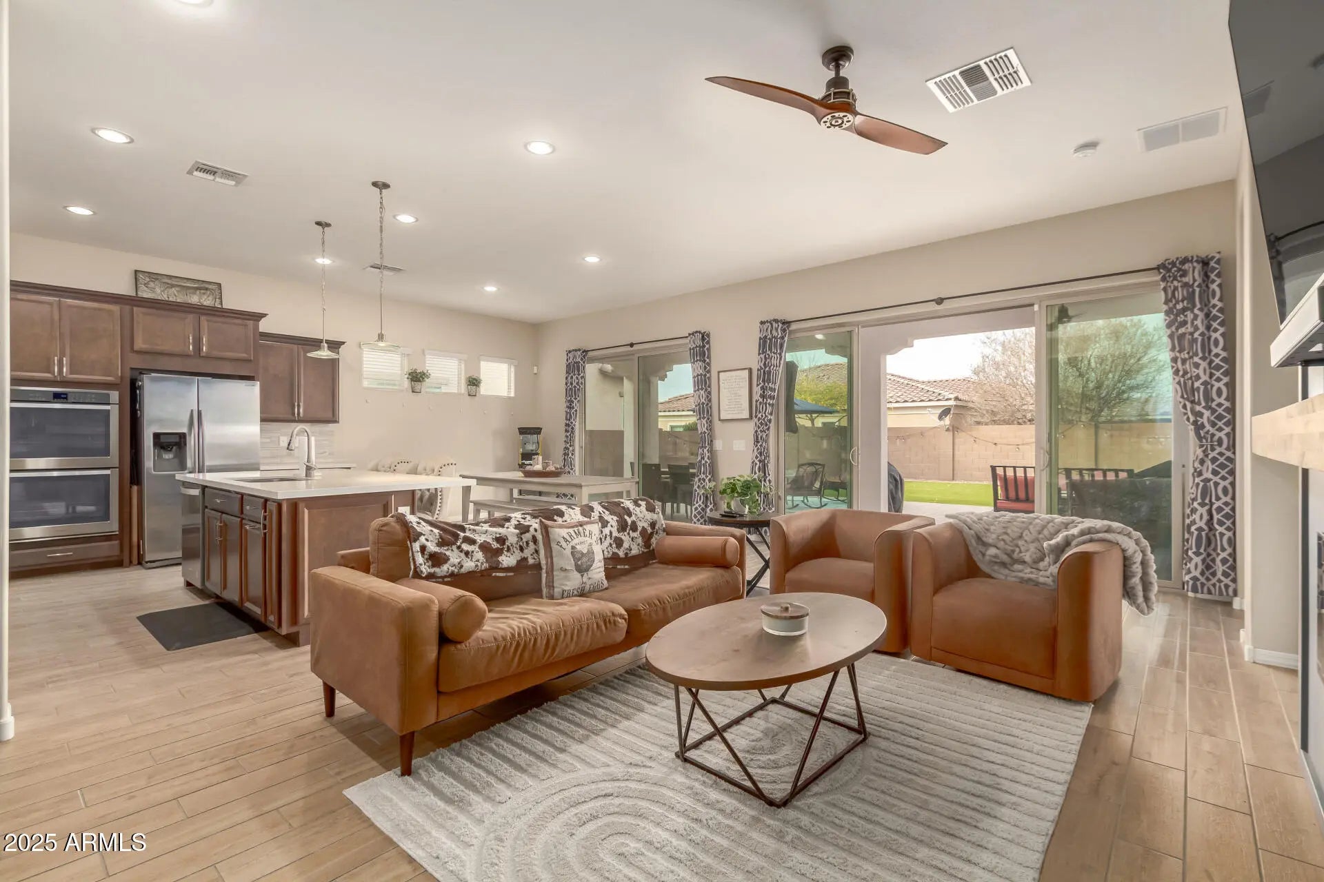 Gorgeous 4 bed/2 bath property in Eastmark! This 2018 Cal Atlantic build has been beautifully upgraded by the owners. This home has it all-12ft ceilings and 9ft doors, fireplace, wood-look plank tile throughout, a bright and open feel with both a single and double slider that open to a huge covered patio. The kitchen has staggered glass front cabinets, a gas cooktop, gas double ovens, and a huge island. The back yard is perfect for AZ weather and enjoying the fire pit and hot tub. Easy maintenance with pavers and turf. Tons of room in the laundry/mud room and tandem garage. Outside the home, Eastmark offers true resort-style living! The community is centered the expansive Great Park with a scenic lake, splash pad, event pavilion, playgrounds, and miles of walking and biking trails. Enjoy the heated pool, fitness areas, sports courts, and a lively community center, along with the unique Diner for casual dining and a community library that adds to Eastmark's small-town charm. With over 75 neighborhood parks, frequent community events, top-rated schools, and nearby shopping and dining, Eastmark is designed for connection, convenience, and active living.