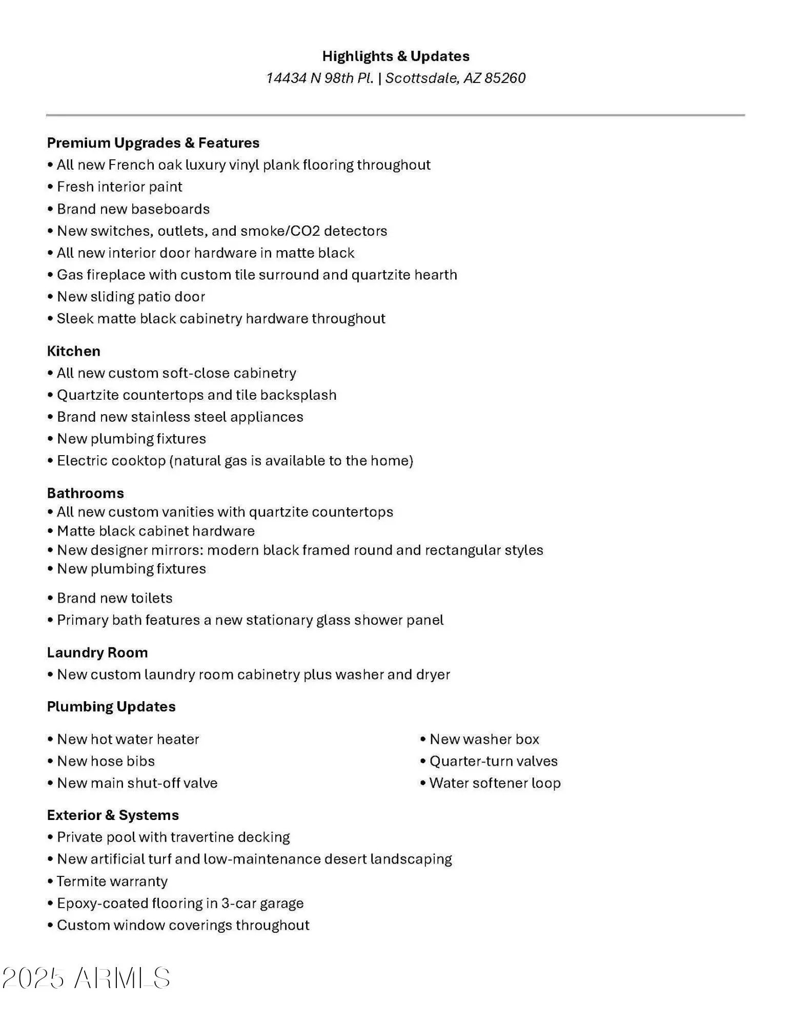 This 2,370 SF 3-car garage, 4 beds, 3 baths Scottsdale stunner is the one you've been waiting for—fully remodeled with elevated finishes. French oak luxury vinyl plank flooring flows through the open layout, complemented by a sleek fireplace and designer lighting throughout. The kitchen is a total showstopper with quartzite counters, soft-close cabinetry, and brand-new stainless steel appliances (Natural gas is available to the home). Bathrooms have raised custom vanities and custom tile. Outdoors enjoy a private pool with travertine decking, new turf, and easy-care landscaping on an oversized lot. Epoxy-coated garage floors add extra polish. Zoned for top-rated A+ schools, including Desert Mountain, and perfectly positioned minutes from the McDowell Mountains, the 101, Scottsdale Quarter, Kierland Commons, and all the best dining, shopping, and sunshine Scottsdale has to offer. One AC unit was replaced in 2025 and the other in 2019.