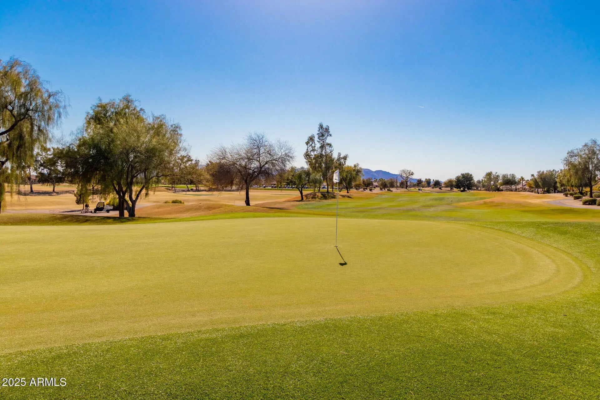 Premium golf course lot with sweeping 180° views, showcased through a custom addition thoughtfully designed to maximize golf course visibility while flooding the home with natural light. A new roof to be installed in January, along with recent interior and exterior paint, luxury vinyl plank flooring, 5'' baseboards, and updated fixtures, lighting, and hardware. The 3-car garage leads through an expansive laundry area into a bright, open living space featuring wood-look flooring and a living room centered around a modern gas fireplace with a curved hearth. The stylish kitchen offers matching appliances, wall ovens, granite countertops, neutral cabinetry, and a center island with breakfast bar. The primary BR is complete with a bay window overlooking golf course. and the generous laundry room provides plenty of room for extra storage. Soak in the majestic sunset views and enjoy resort-style amenities, including a pool, spa, golf course, and more. This is Sun City West living at its finest. Come experience it for yourself!