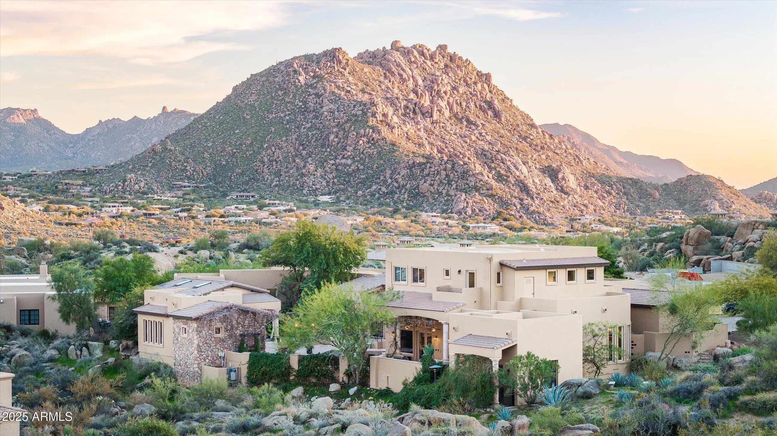 Set against the dramatic boulder landscape of Troon North, this private desert retreat captures the lifestyle buyers are searching for-sweeping mountain views, glowing sunsets, and seamless indoor-outdoor living. Designed for both elevated entertaining and everyday comfort, the home features soaring ceilings, expansive windows, and open living spaces that flow effortlessly to a resort-style backyard with pool, spa, fire pit, and multiple patios designed for evenings under the desert sky. The main level includes a spacious primary suite and four guest suites, while an upper-level retreat offers flexible space for a studio, office, or gym. With its setting, layout, and lifestyle appeal, this is one of the most compelling opportunities in Troon North-just minutes from golf, hiking, and dining