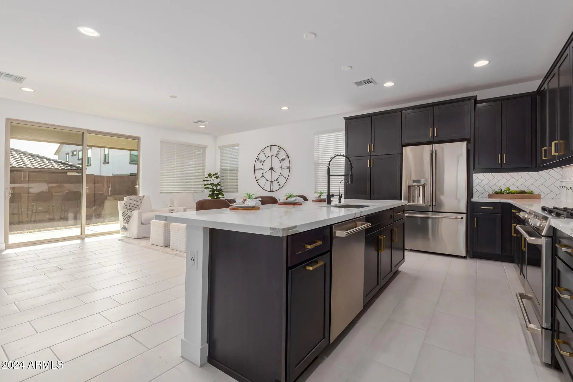 This four bedroom three bathroom home offers 2,200 square feet with a practical open layout. The kitchen anchors the main living space and features a large island, stainless steel appliances, and breakfast bar, with a separate dining area nearby. Living and kitchen areas overlook the backyard for added natural light. The primary suite includes a double sink vanity and walk in closet. Bedrooms are carpeted while main living areas offer easy care flooring. Laundry includes washer and dryer. The backyard features a covered patio that provides shaded outdoor space. Two car garage. Pets allowed.
