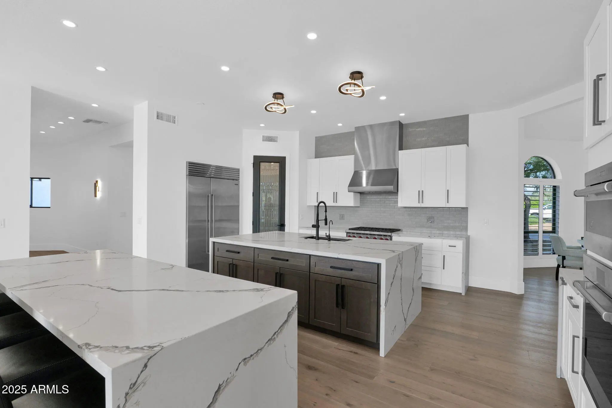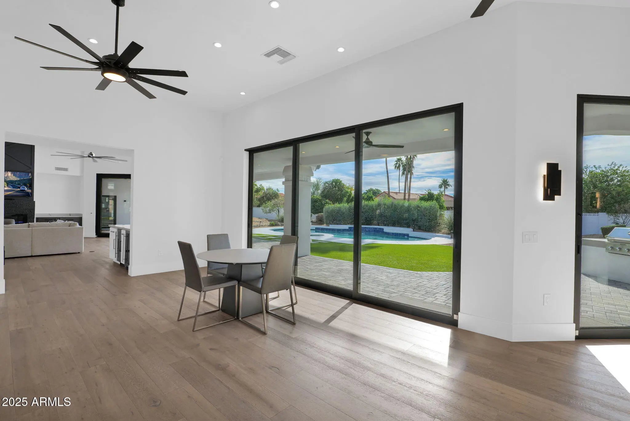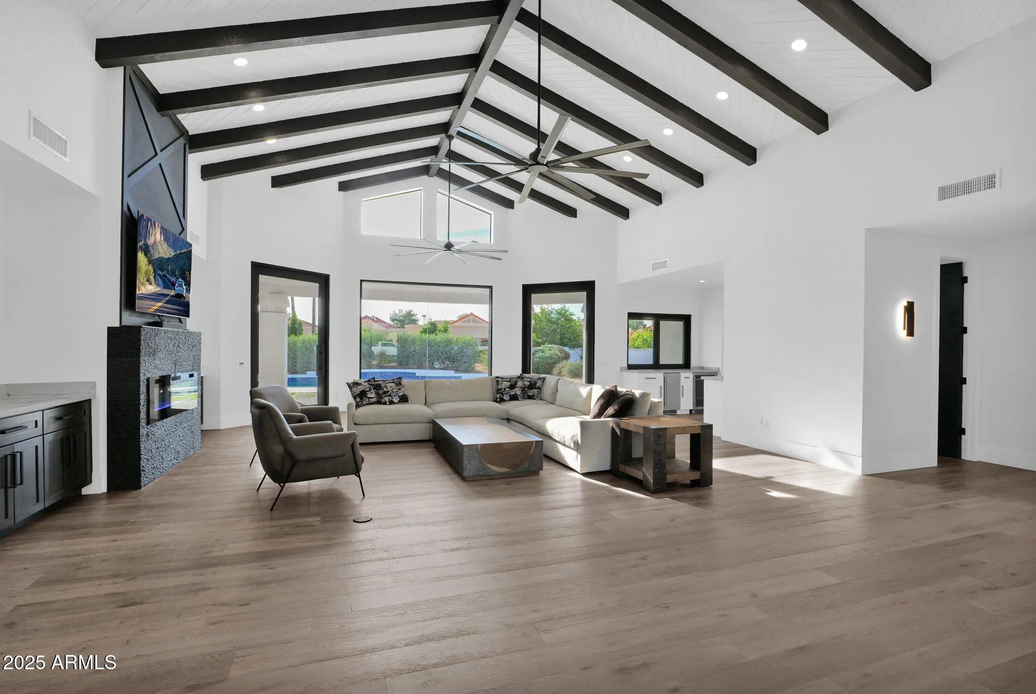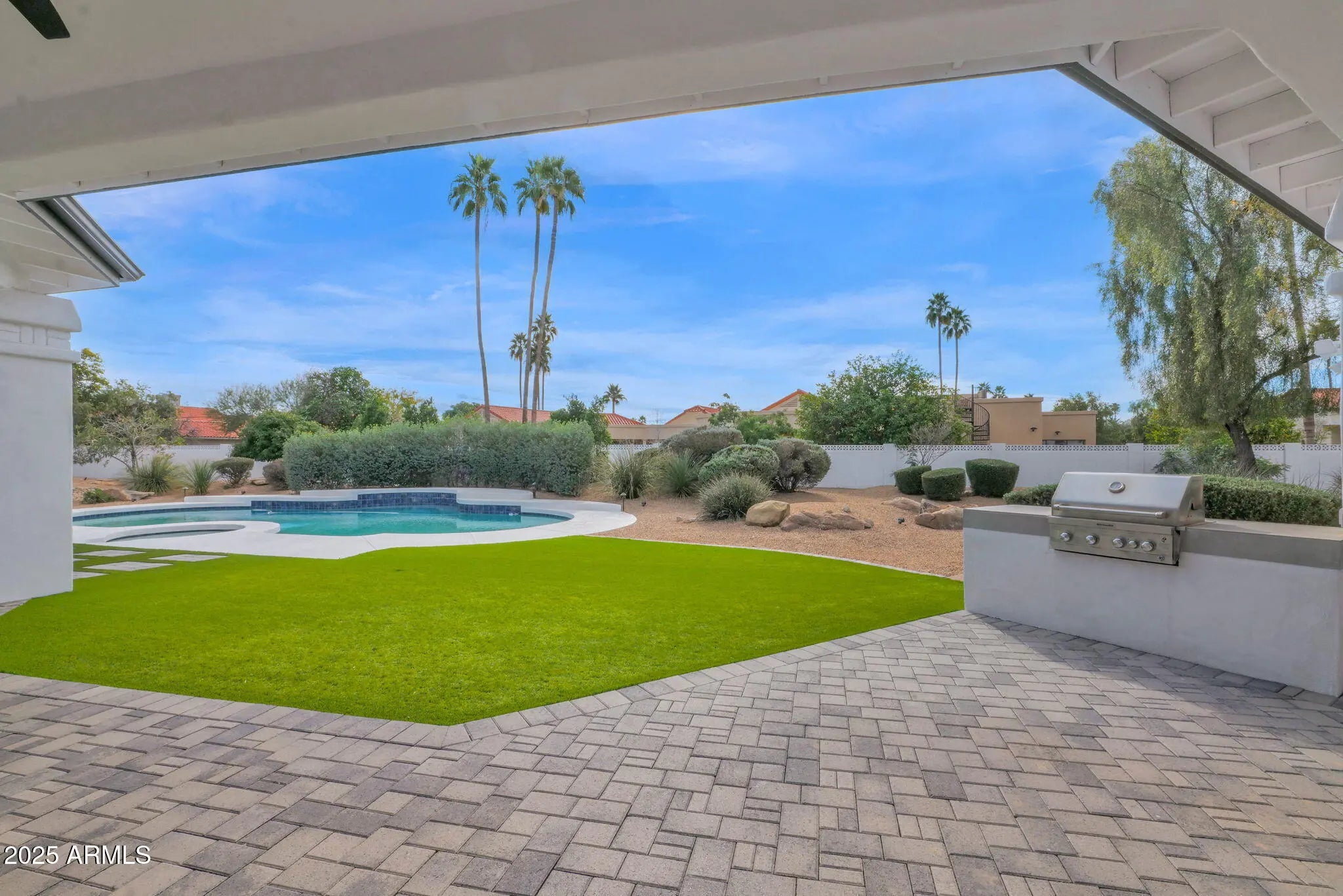 Experience elevated luxury living on nearly an acre with no HOA. This 5,822 sq ft Spanish contemporary masterpiece has been reimagined with timeless finishes, warmth, and modern livability. Real wood plank floors, vaulted beam ceilings, and commercial style windows and doors bring natural light and the outdoors in. The chef's kitchen flows into a custom wine wall and butler bar perfect for gatherings and entertaining. The primary suite features a hidden private exercise room, spa-style bath, and massive closets. Step outside to a south facing resort-inspired oasis with an expansive covered patio, sparkling pool & spa, water features, and inviting spaces to dine, lounge, and enjoy beautiful Arizona evenings. Newer roof, newer AC's meaning this is truly a move in ready home.
