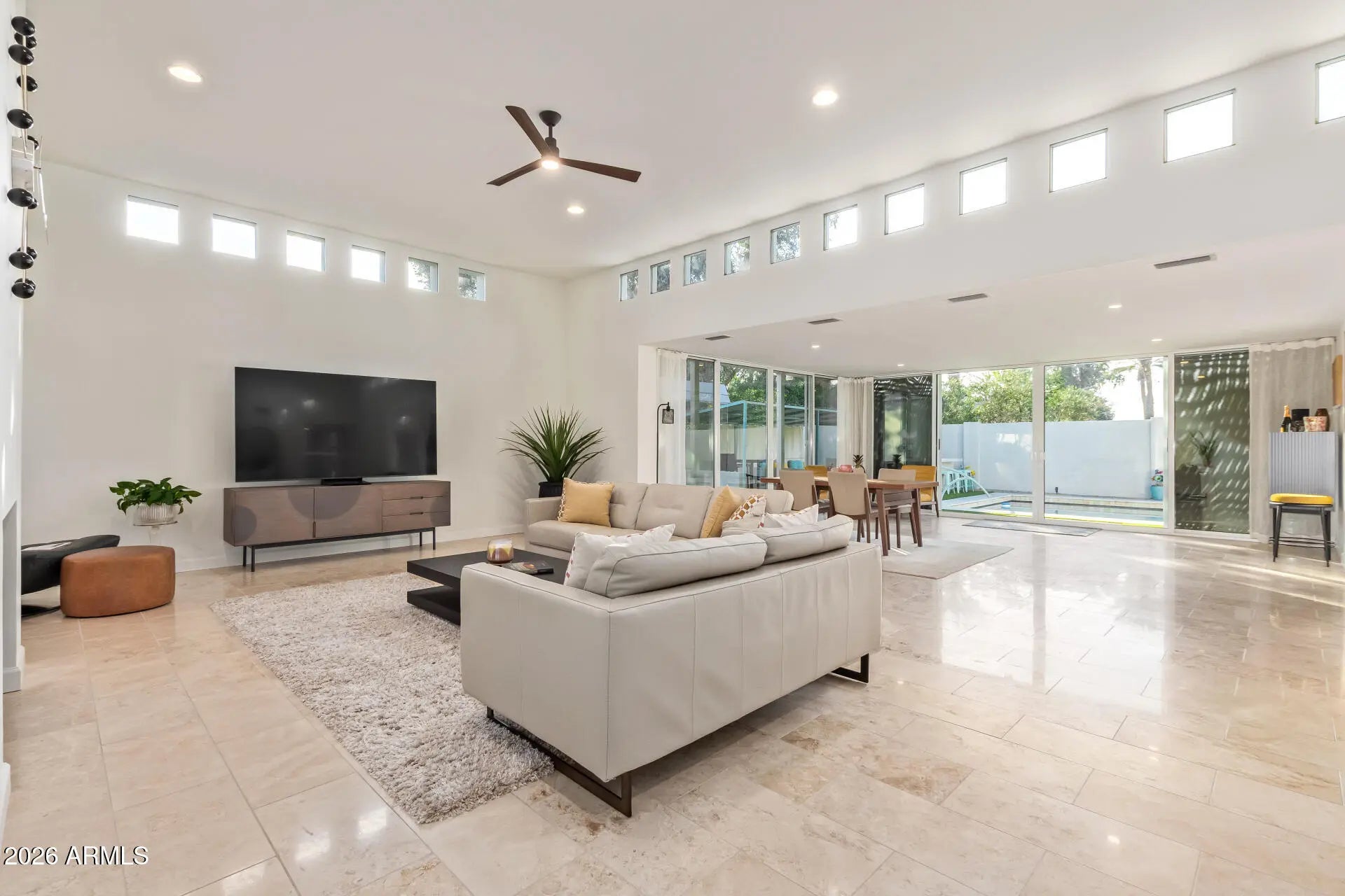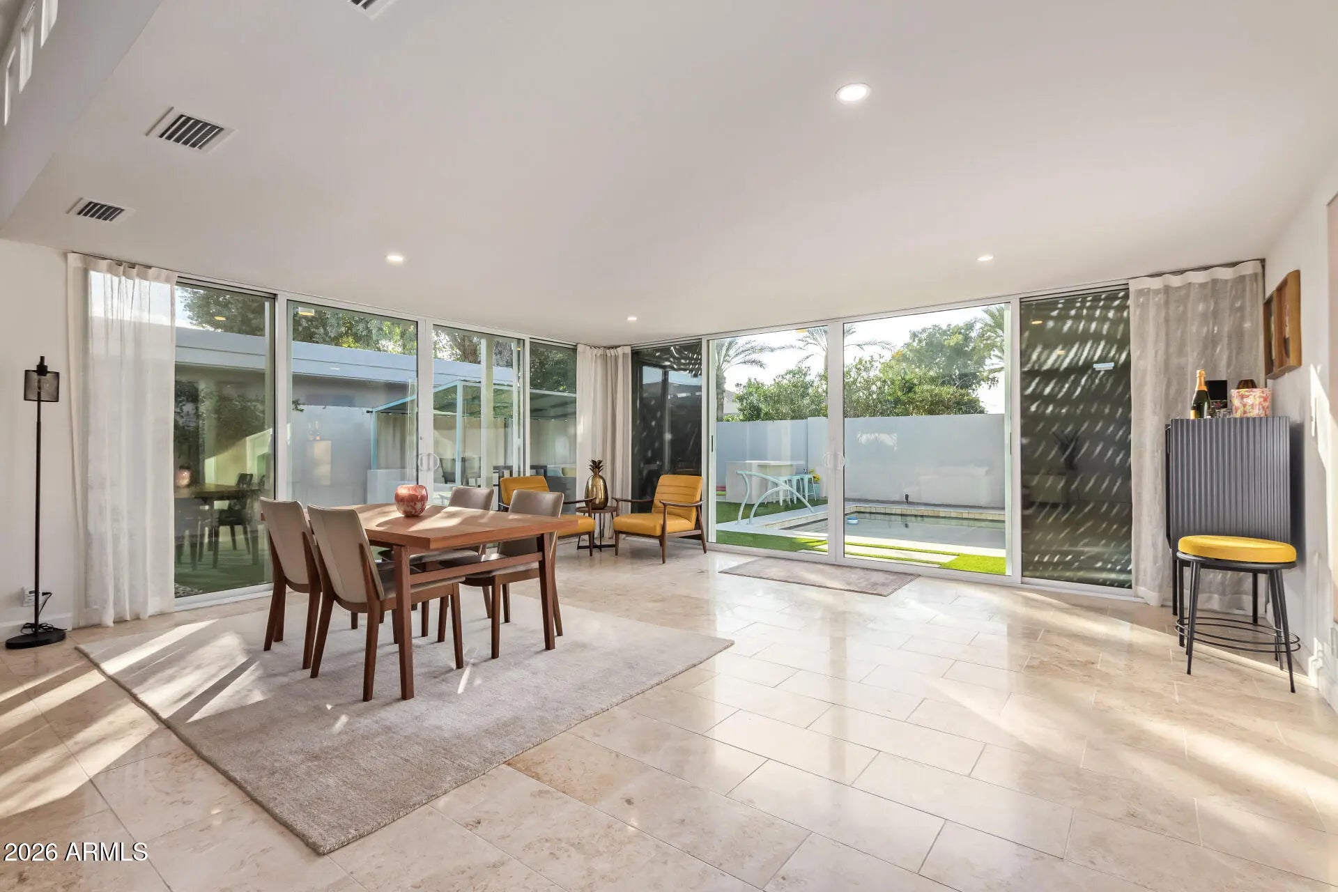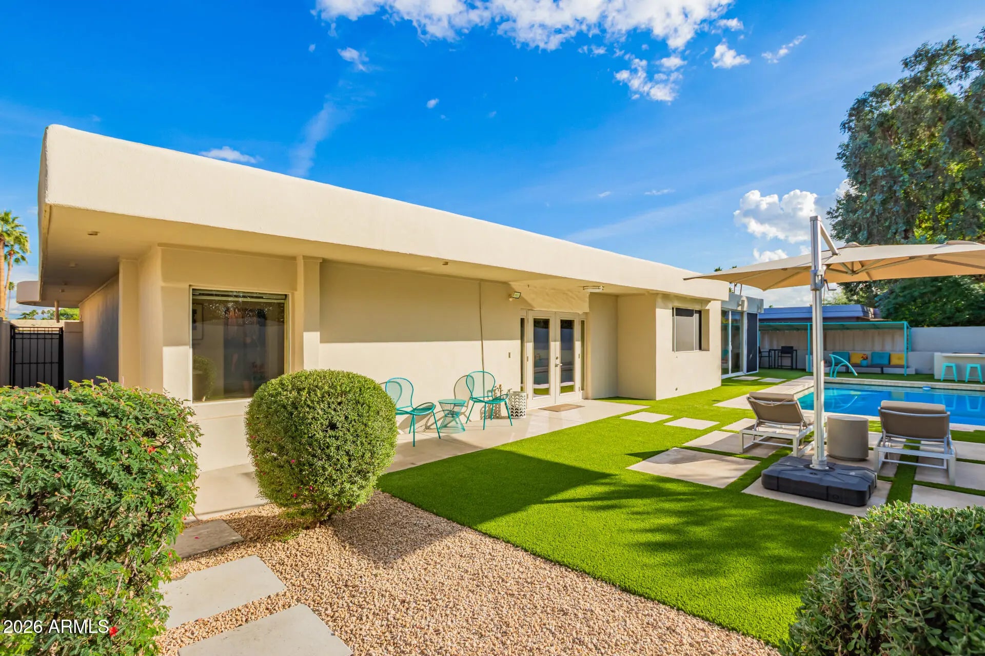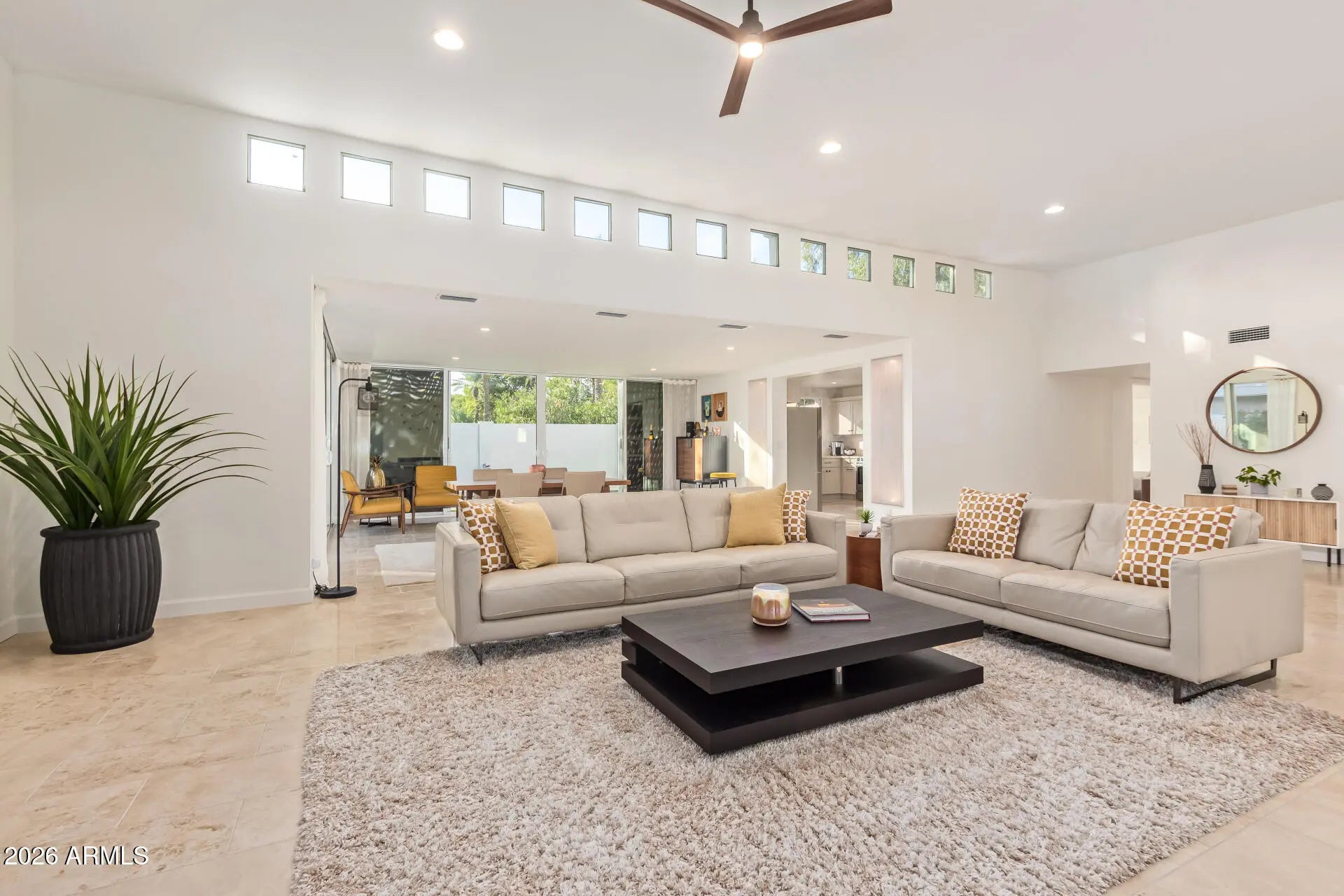 An architectural mid-century modern gem in Mountain View East at the heart of McCormick Ranch, this exceptional residence was designed by famed Taliesin architect and Frank Lloyd Wright colleague, John Rattenbury. Meticulously maintained and fully updated in 2023, this home is designed to be timeless, showcasing soaring 11-foot ceilings and clerestory windows that flood the space with natural light. The thoughtfully designed floor plan offers dual primary suites, each with private outdoor access, walk-in closets, and spa-inspired bathrooms. The updated kitchen features Caesarstone countertops and Bosch stainless steel appliances. A generous great room opens through expansive glass sliders to a resort-style backyard and sparkling pool. Modern convenience and architectural history! The home features contemporary furnishings that showcase the home's mid-century modern design and are available for purchase.
