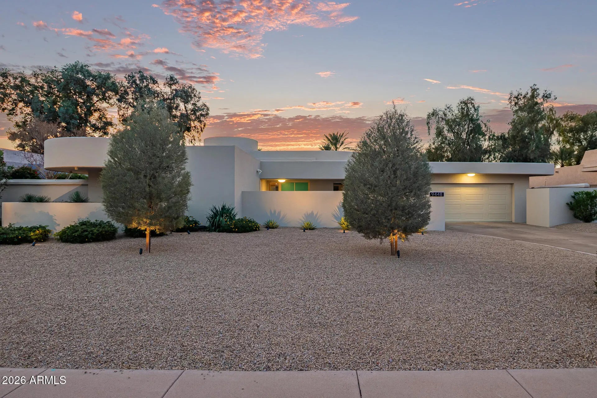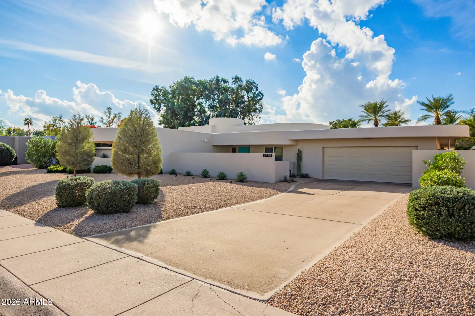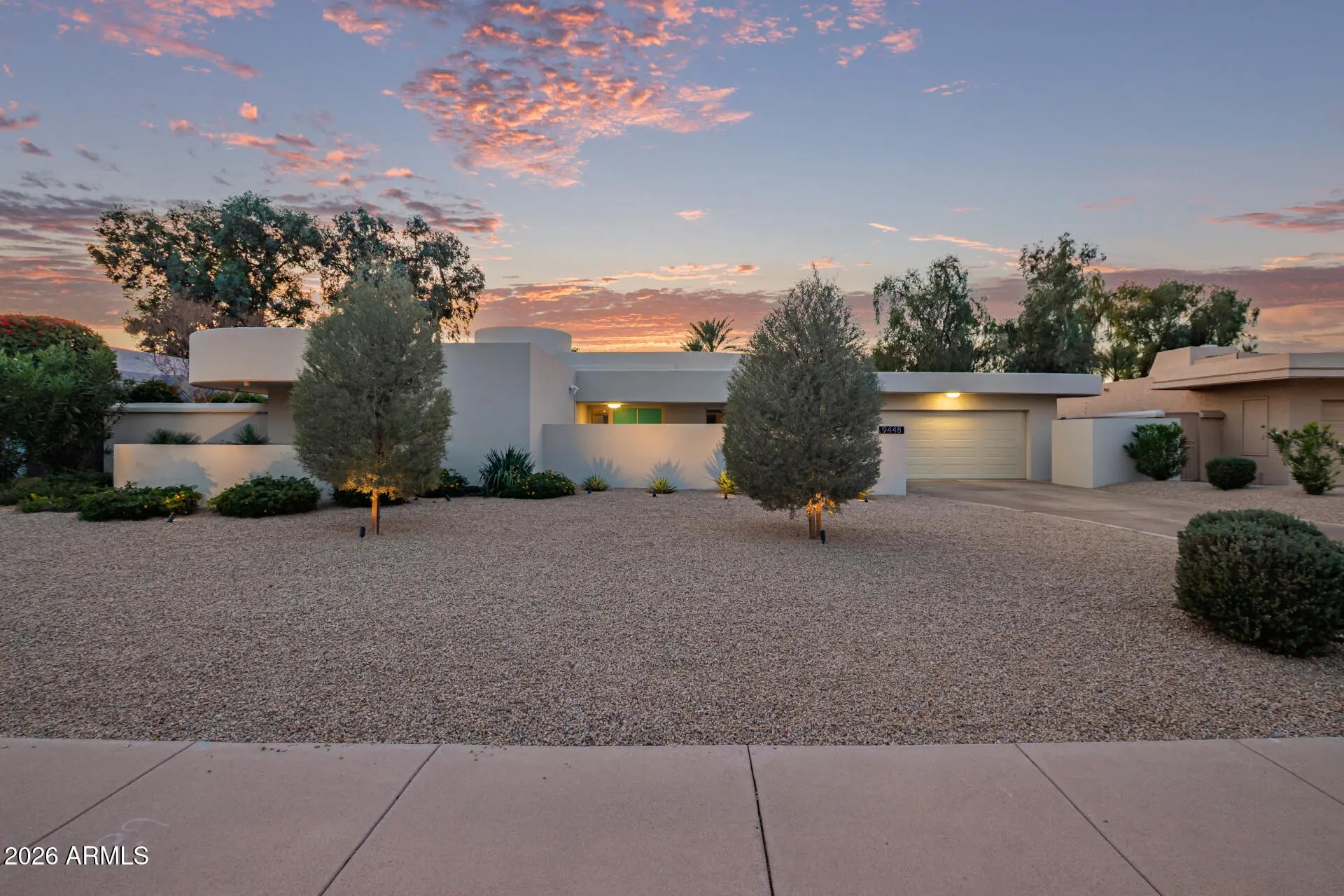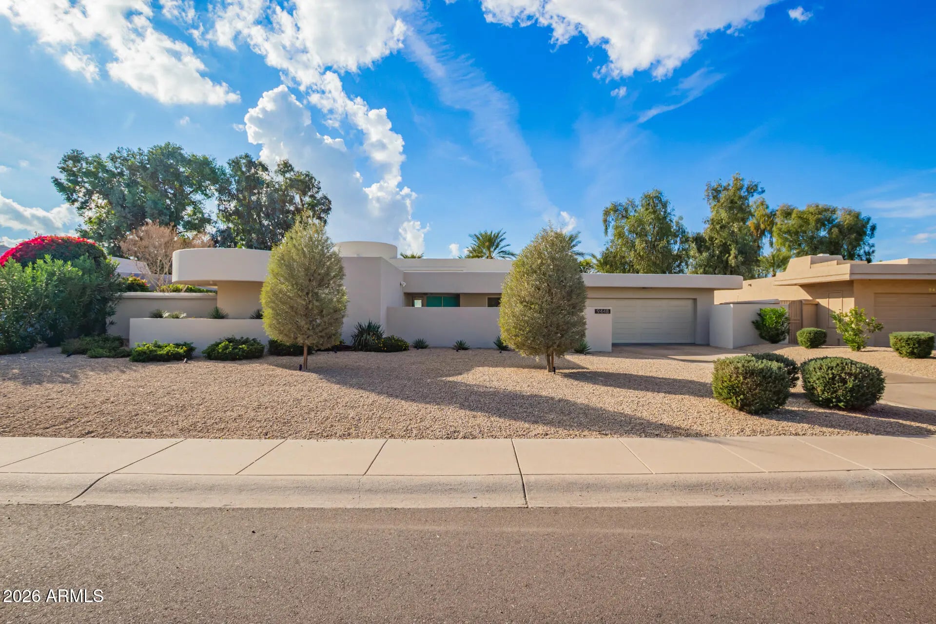 An architectural mid-century modern gem in Mountain View East at the heart of McCormick Ranch, this exceptional residence was designed by famed Taliesin architect and Frank Lloyd Wright colleague, John Rattenbury. Meticulously maintained and fully updated in 2023, this home is designed to be timeless, showcasing soaring 11-foot ceilings and clerestory windows that flood the space with natural light. The thoughtfully designed floor plan offers dual primary suites, each with private outdoor access, walk-in closets, and spa-inspired bathrooms. The updated kitchen features Caesarstone countertops and Bosch stainless steel appliances. A generous great room opens through expansive glass sliders to a resort-style backyard and sparkling pool. Modern convenience and architectural history! The home features contemporary furnishings that showcase the home's mid-century modern design and are available for purchase.