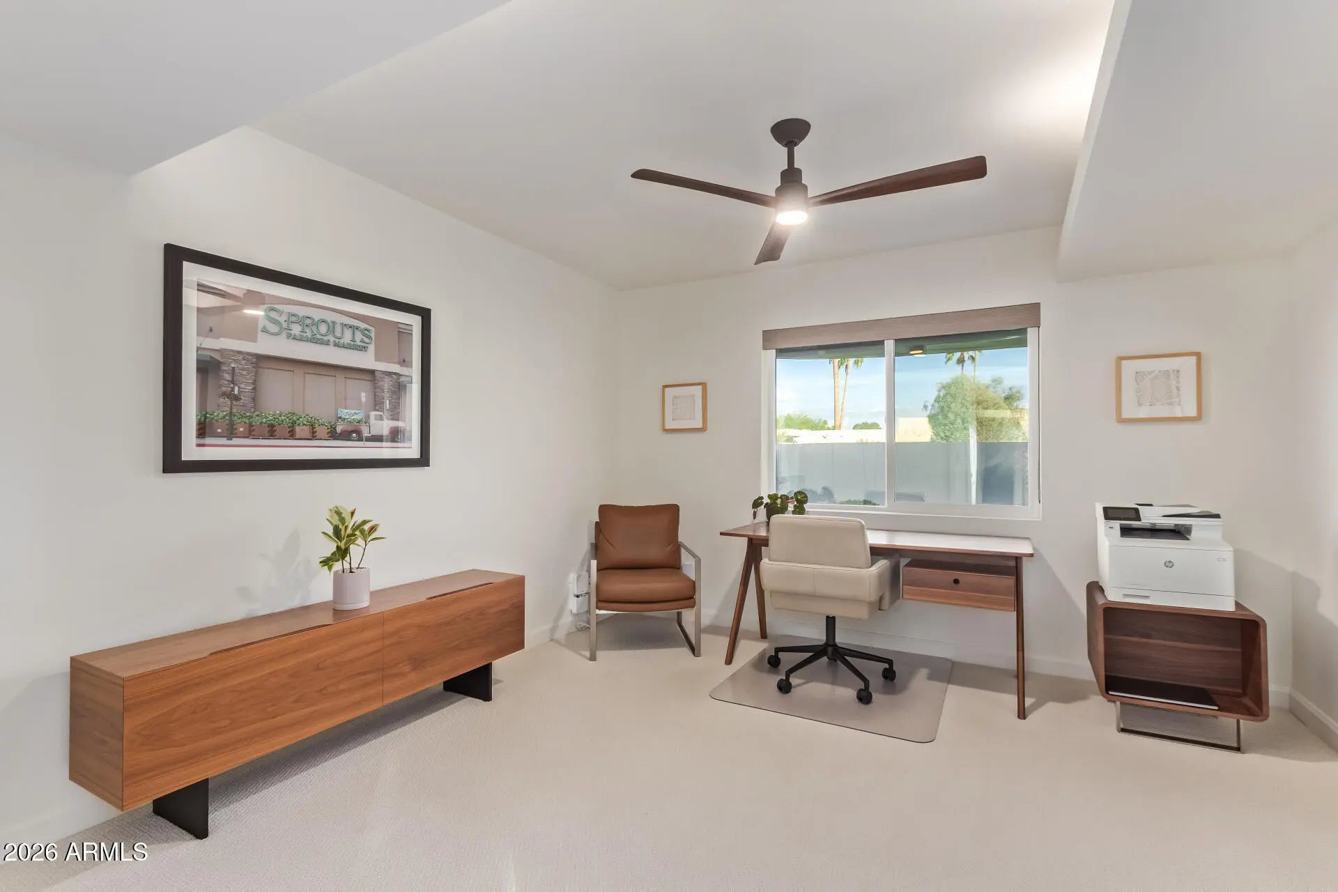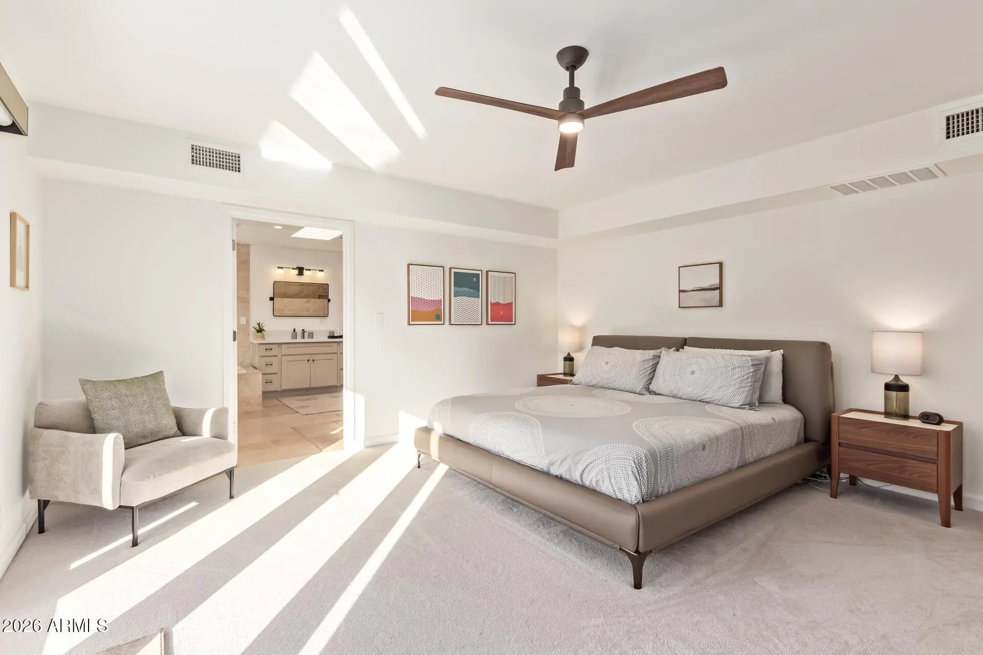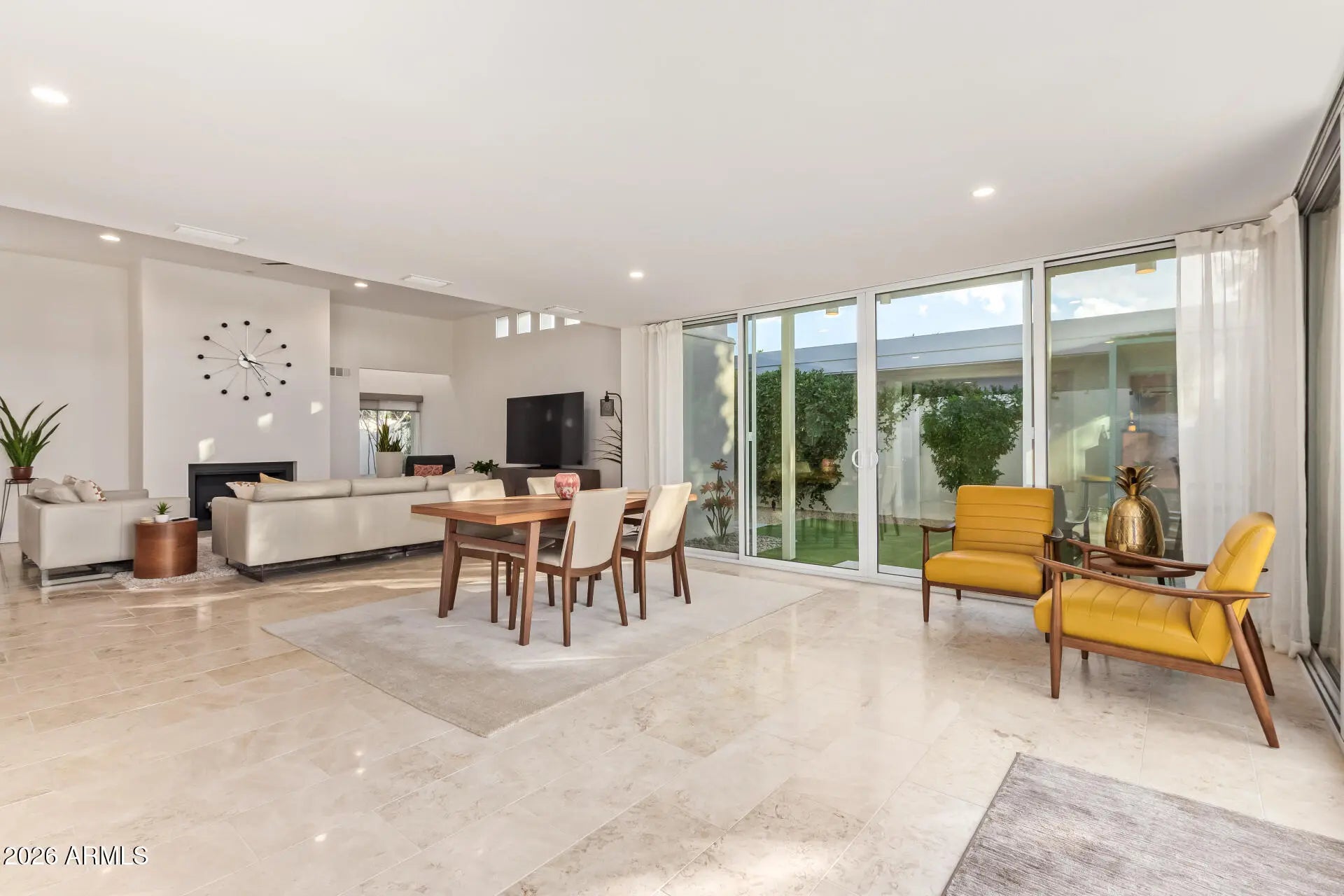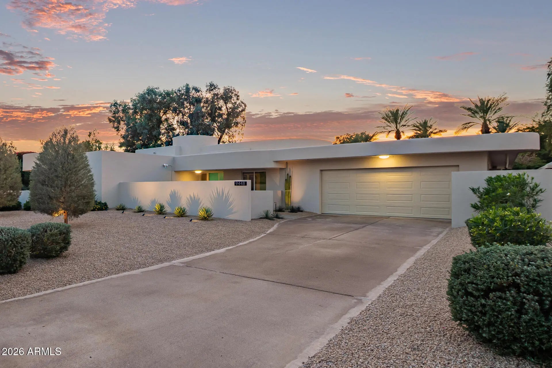 An architectural mid-century modern gem in Mountain View East at the heart of McCormick Ranch, this exceptional residence was designed by famed Taliesin architect and Frank Lloyd Wright colleague, John Rattenbury. Meticulously maintained and fully updated in 2023, this home is designed to be timeless, showcasing soaring 11-foot ceilings and clerestory windows that flood the space with natural light. The thoughtfully designed floor plan offers dual primary suites, each with private outdoor access, walk-in closets, and spa-inspired bathrooms. The updated kitchen features Caesarstone countertops and Bosch stainless steel appliances. A generous great room opens through expansive glass sliders to a resort-style backyard and sparkling pool. Modern convenience and architectural history! The home features contemporary furnishings that showcase the home's mid-century modern design and are available for purchase.