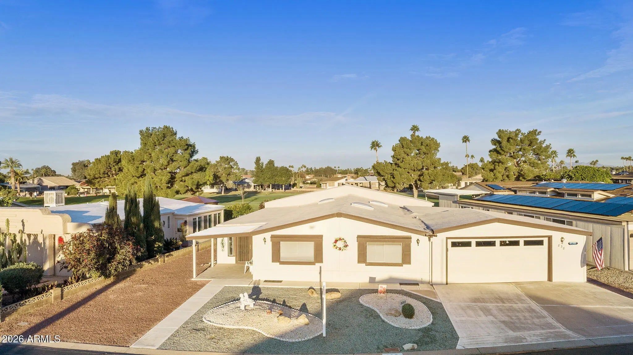 Welcome to this Beautiful Golf Course Home, Furnished, 3 Bedroom Plus Office, 2 Bathroom & 3 Car Garage w/ Storage Room & Workshop Areas, located on a quiet cul‑de‑sac within the highly desirable 55+ gated community of Fountain of the Sun, offering peaceful fairway views and added privacy. Large Open Kitchen Area, Large Formal Dining Room overlooking the Golf Course, Separate Office Area for Privacy, Large Primary Bedroom w/ Walk-In Closet, Primary Bath w/Updated Jacuzzi Shower (2024), 3 Skylights, Exterior Painted (Feb 2025), New Foam Roof (2023), Residents enjoy golf, community events, fitness facilities, and social clubs, all within a secure, gated environment. With nearby shopping, dining, and healthcare.