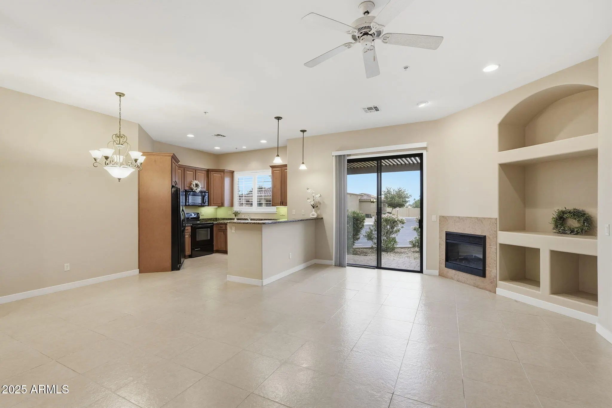 Beautifully maintained home featuring 2 spacious bedrooms and 2 bathrooms, 10ft ceilings, perfect for seasonal or full-time residents. The HOA maintains the exterior and landscaping, offering worry-free living. The kitchen boasts granite countertops, black appliances, and upgraded cabinetry. The open great room includes a cozy fireplace, ideal for cool winter evenings. Conveniently located with easy access to restaurants, shopping, and the 303 freeway. Don't miss this opportunity—all appliances are included, including the washer and dryer. Community pool located next to home.Come see it before it's gone!