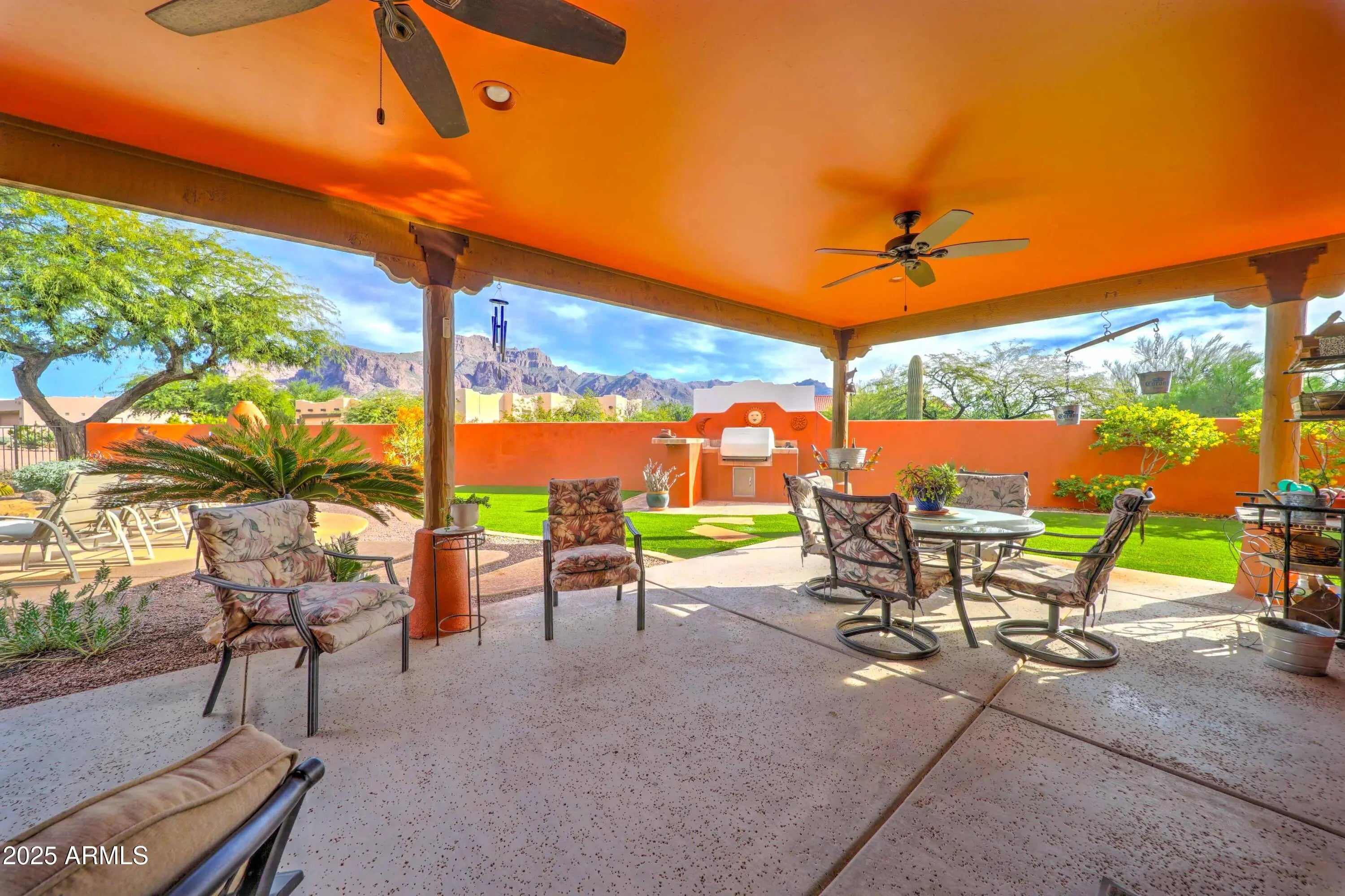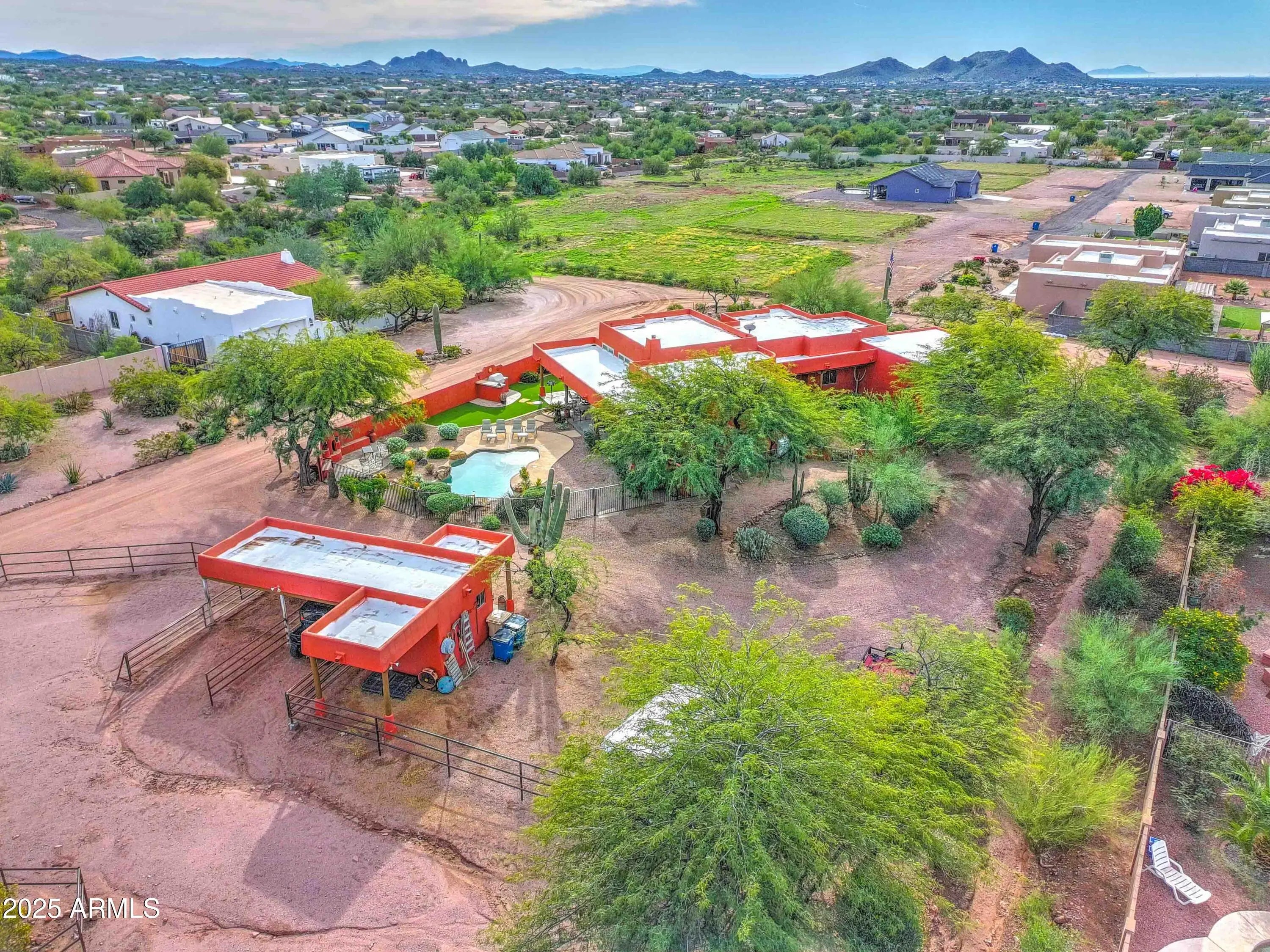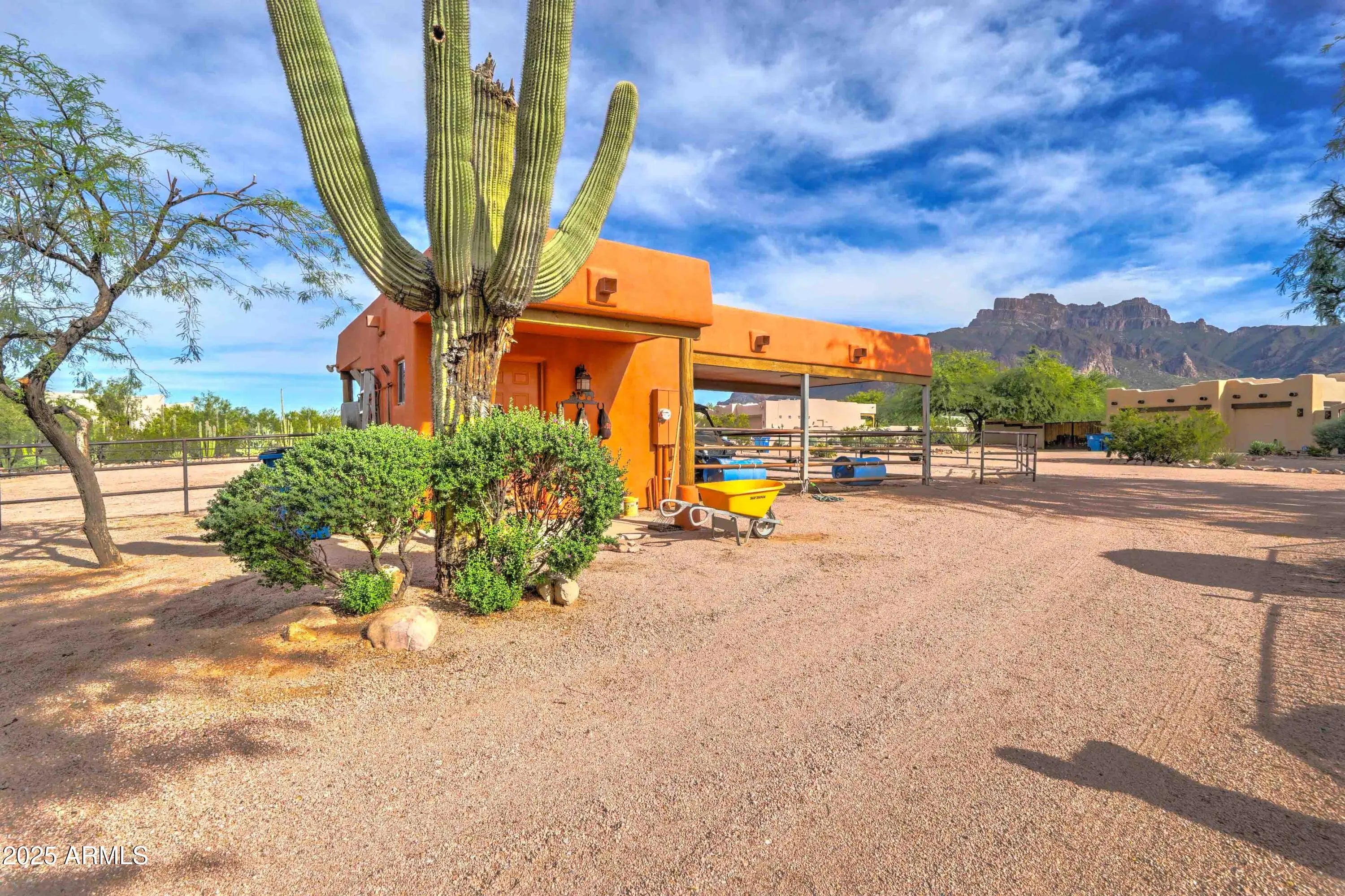 Welcome to this beautiful Santa Fe Style residence set on a private 1-acre lot with breathtaking views of the majestic Superstition Mountains. This 3-bedroom, 2-bath home features a light filled great room with open kitchen and dining area, ideal for everyday living and entertaining. The primary suite includes spacious bathroom, walk-in closet and convenient office nook. Natural light flows throughout while extended patios and private courtyards create indoor/outdoor living. Outside enjoy a saltwater pool and beehive FP. Horse lovers will appreciate the exceptional equestrian set up complete with stalls, tack room, hay storage and turn-out arena. This rare property combines privacy, comfort, and relaxed desert living with unmatched mountain views.