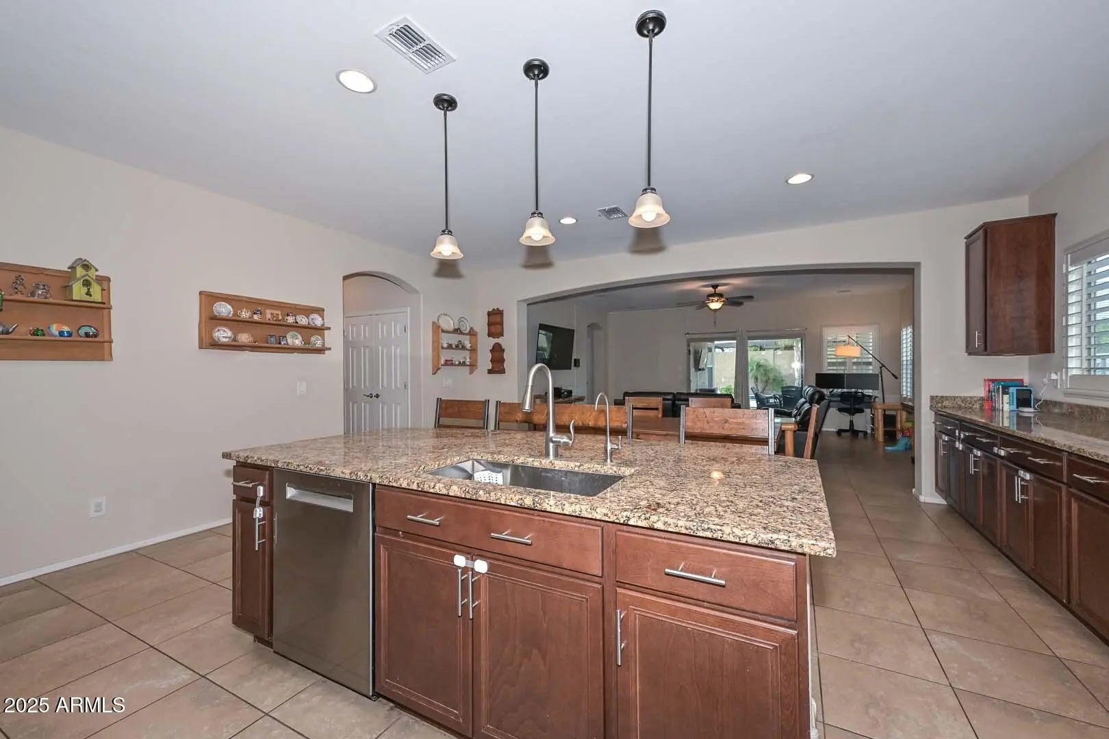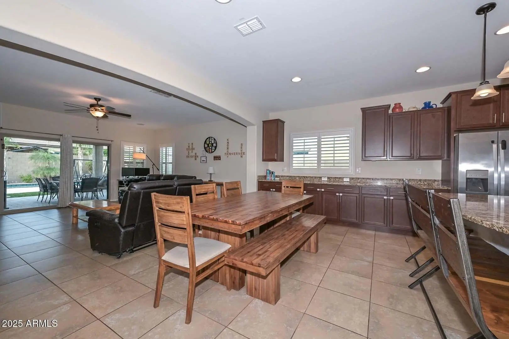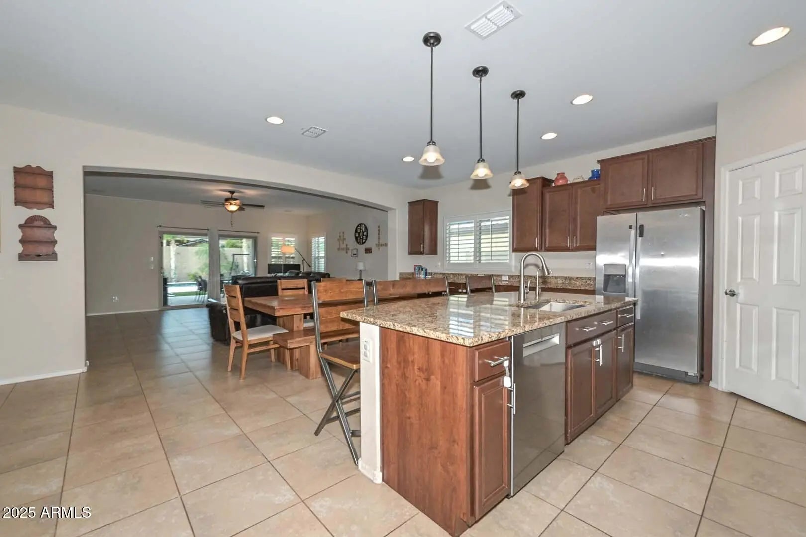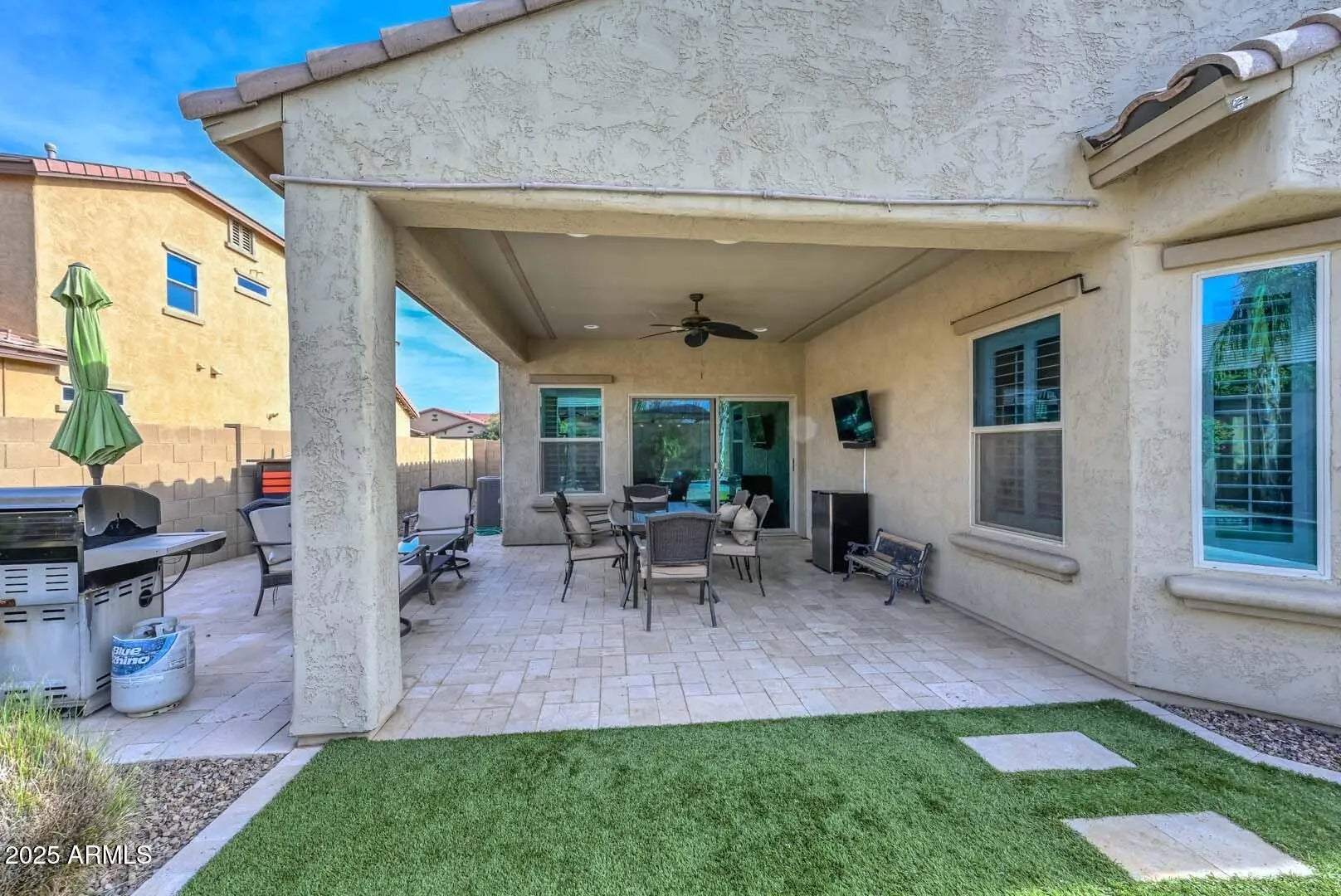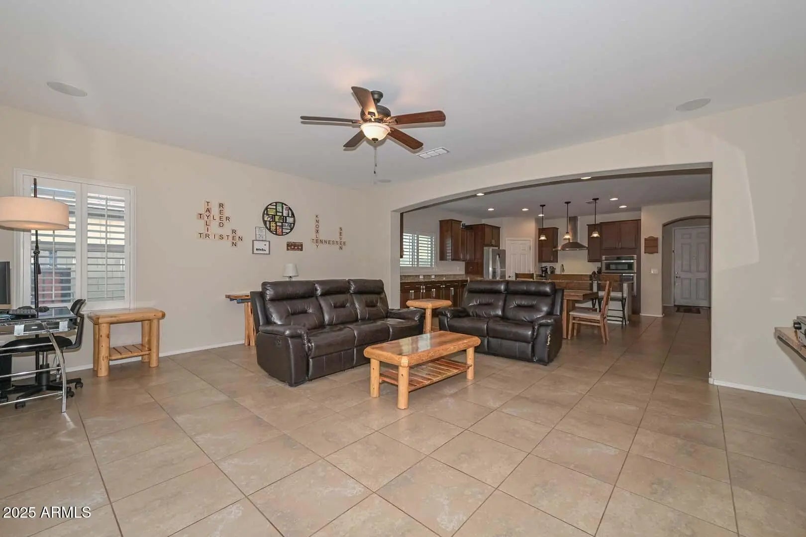 Welcome home to this beautifully appointed 3-bedroom plus den residence, thoughtfully designed for both comfort and entertaining. The gourmet kitchen is a chef's dream, featuring granite countertops, an oversized kitchen island, gas cooktop, and extended cabinetry, perfect for storage and style. The den makes a striking impression with a barn door and elegant double-door entry, ideal for a home office or flex space. Throughout the home you'll find ceiling fans, plantation shutters on all windows, surround sound, and two convenient linen closets adding to everyday functionality. The spacious primary suite offers a relaxing retreat with bay windows, while the luxurious primary bath boasts dual sinks and a walk-in closet. Step outside to your private back yard oasis? featuring a large covered patio with travertine tile, ceiling fans, and surround soundperfect for outdoor living. Enjoy the play pool with Baja step, low-maintenance turf lawn, gas BBQ hookup, and plenty of room to entertain. Additional highlights include an RV gate, extended concrete and stone driveway for extra parking, a 3-car tandem garage with storage shelves that convey, and a tankless water heater for energy efficiency. This home offers the perfect blend of style, functionality, and resort-style outdoor livingtruly a must-see! Located just a couple of blocks away from the Community Pool, Park, Splash Pad and Basketball courts.