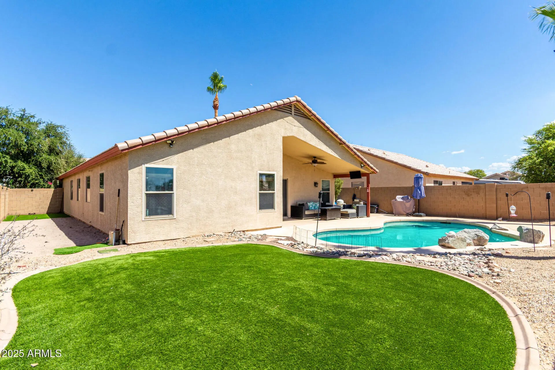 Borders Common Area, East/West Exposure, Desert Front, Gravel/Stone Back, Synthetic Grass Back