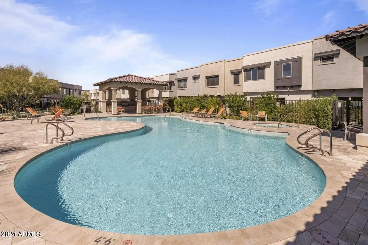 A rare opportunity for luxury, convenience, and lock-and-leave living. Bring your luggage and settle into effortless luxury in this fully furnished townhome located in the gated Pinnacle at Silverstone community. Ideally positioned on a premium interior lot backing to green space, the home is steps away from resort-style amenities including a heated community pool, spa, bbq, and fitness center. The 1st floor features a chef's kitchen w/ granite countertops, stainless steel appliances, and center island seamlessly flowing into the family and dining areas. A powder bath and direct access to the two-car garage complete the main level. Upstairs, the 2nd floor offers a spacious primary suite, open loft, two secondary bedrooms, full bathroom and separate laundry room. The 3rd floor rooftop deck is perfect for entertaining or unwinding in privacy while enjoying breathtaking sunsets, starry nights, or sun-soaked afternoons. Situated in a prime North Scottsdale location with easy access to the Loop 101, this home is minutes from top dining, shopping, and outdoor recreation.
