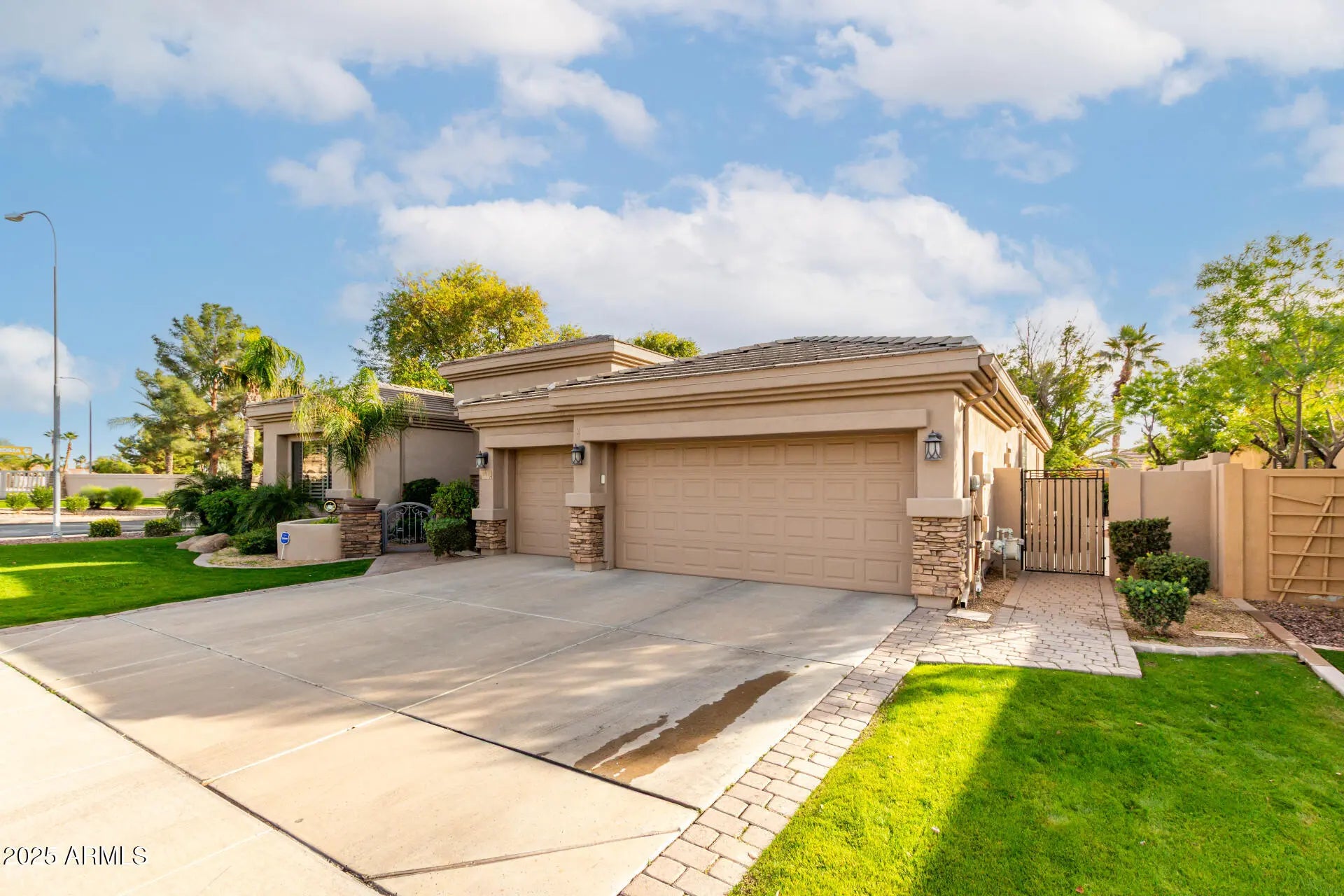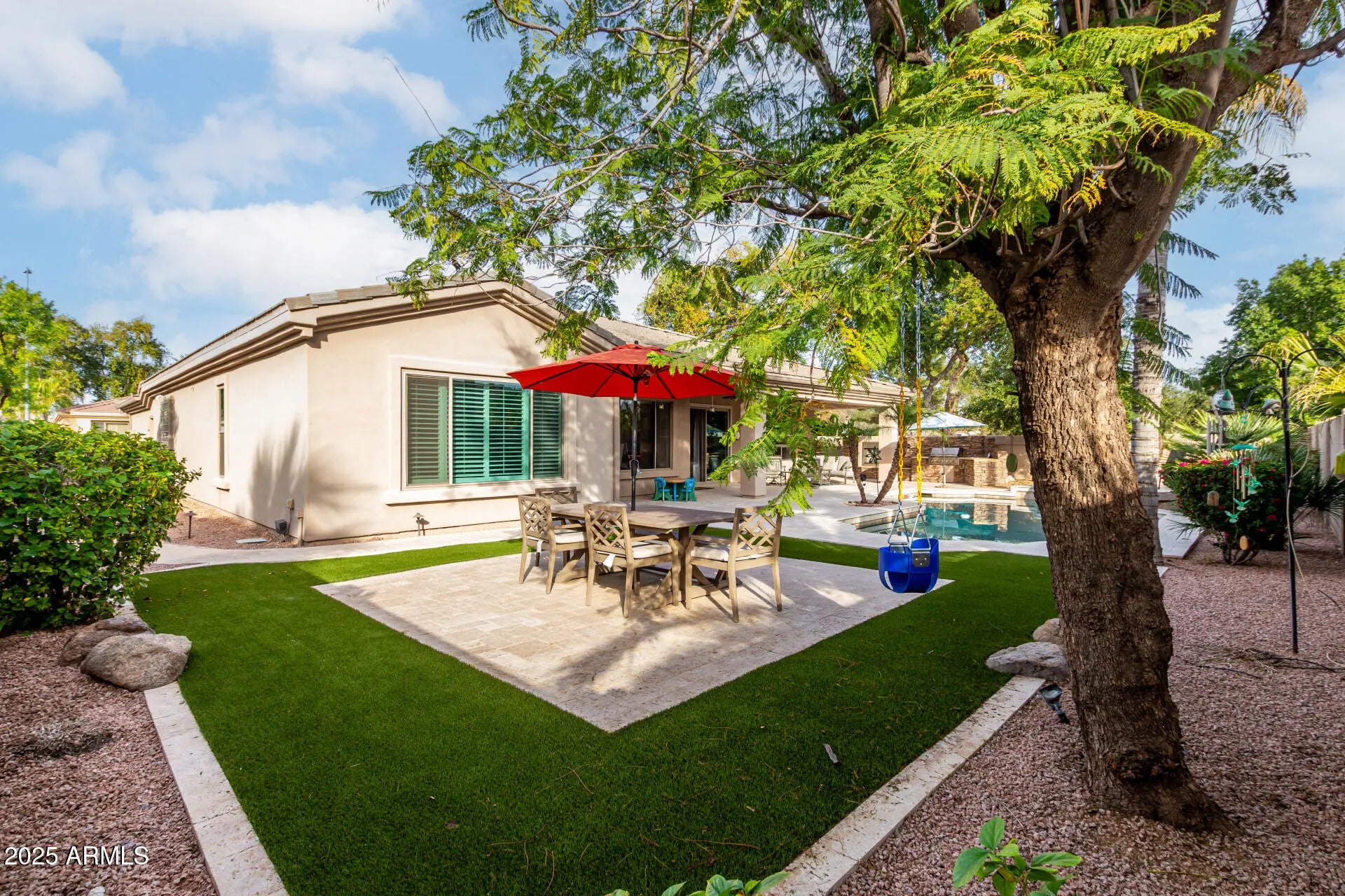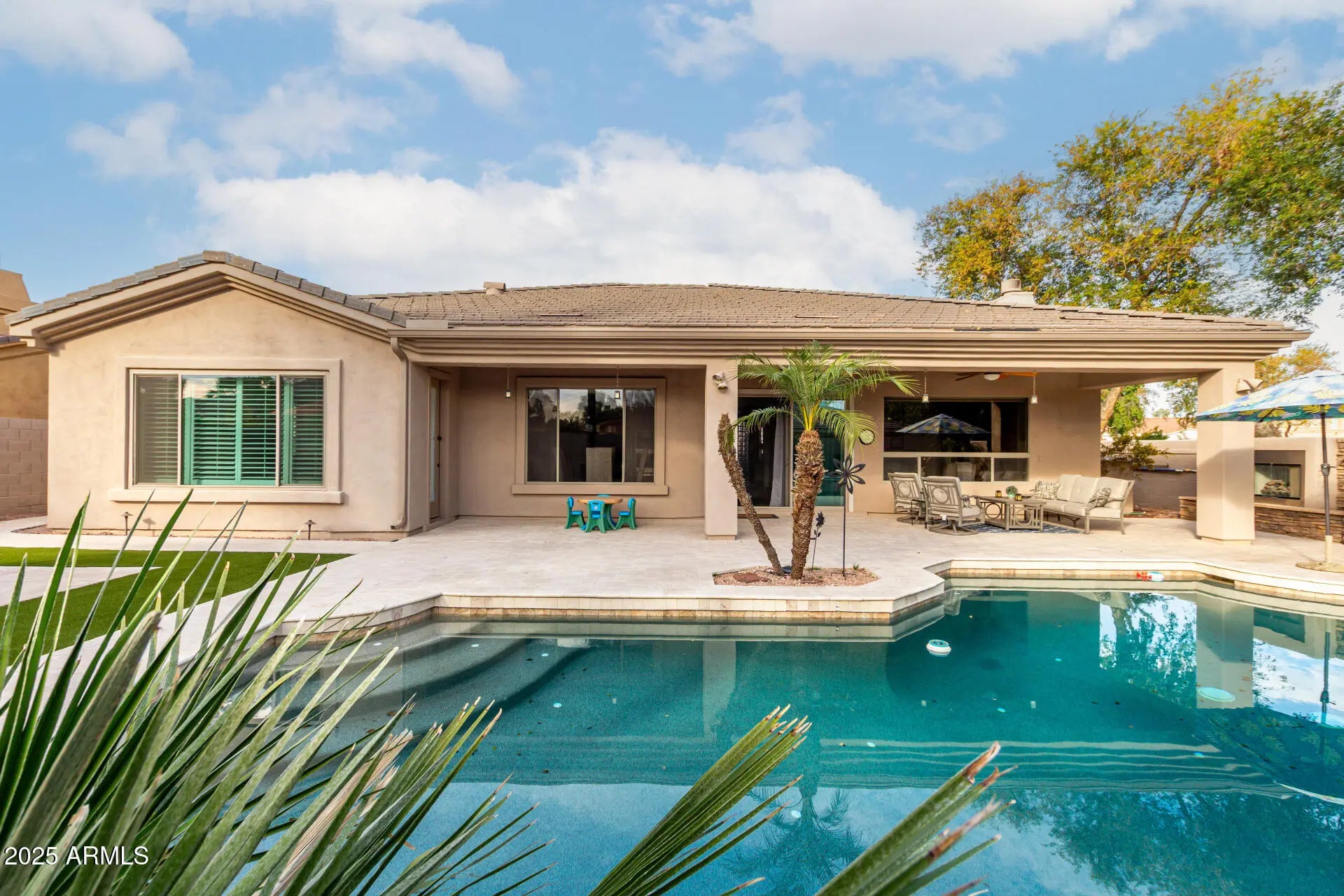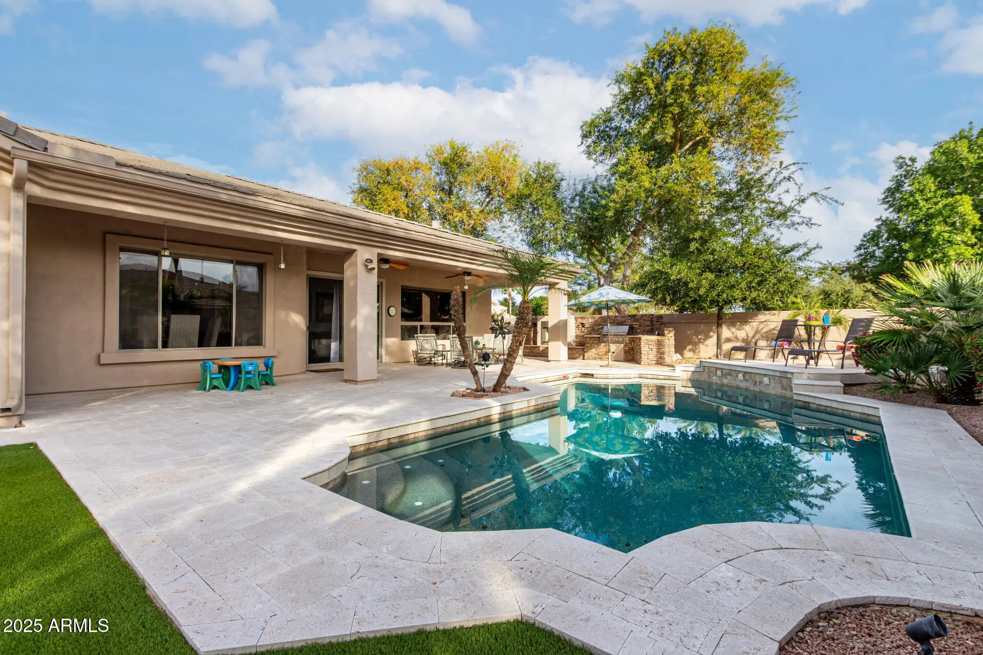 Discover this stunning, pool home on a corner lot in the gated community of Catalina Shores at Ocotillo. The open-concept layout was designed for both comfort and entertaining and features charming arched passageways, abundant natural light, and a floor-to-ceiling stone fireplace. The well-appointed kitchen offers ample cabinetry, tile backsplash, solid-surface countertops, built-in appliances, and a spacious island. The primary suite is a true retreat, highlighting a completely remodeled spa-style bathroom with modern finishes, dual vanities, and a separate soaking tub and shower. The suite also offers a private exit to the backyard and a custom walk-in closet. The versatile den provides the ideal space for a home office or quiet retreat. Step outside to your resort-style backyard oasis, featuring travertine pavers (2022), artificial grass pad, French drain, expansive covered patio, exterior fireplace, built-in BBQ, generous seating areas, and a sparkling pool - ideal for enjoying Arizona's sunny days. Additional upgrades include: tankless gas water heater (2024); irrigation system controller (2025); 20 cu.ft LG refrigerator in laundry room (2023); patio sliding door & screen in kitchen and windows and screens in primary bedroom (2022); complete remodel of primary bathroom with shower, clawfoot tub, cabinets, and tile flooring (2022); counters for kitchen and hall bathroom with new faucets (2020); Lennox 16 seer a/c 5 ton with split gas heater & R-19 fiber glass insulation in attic (2020); tile roof with 2 layers of underlayment (2020); tile flooring in kitchen, dining room, family room, laundry room, and bathrooms (2020); and new water softener, sink in kitchen, and R.O. in kitchen (2020). See attached list. Located within the master-planned Ocotillo community, residents enjoy access to scenic lakes, walking trails, golf, sports courts, clubhouse, and fitness center, all just minutes from dining, shopping, and freeway access.
