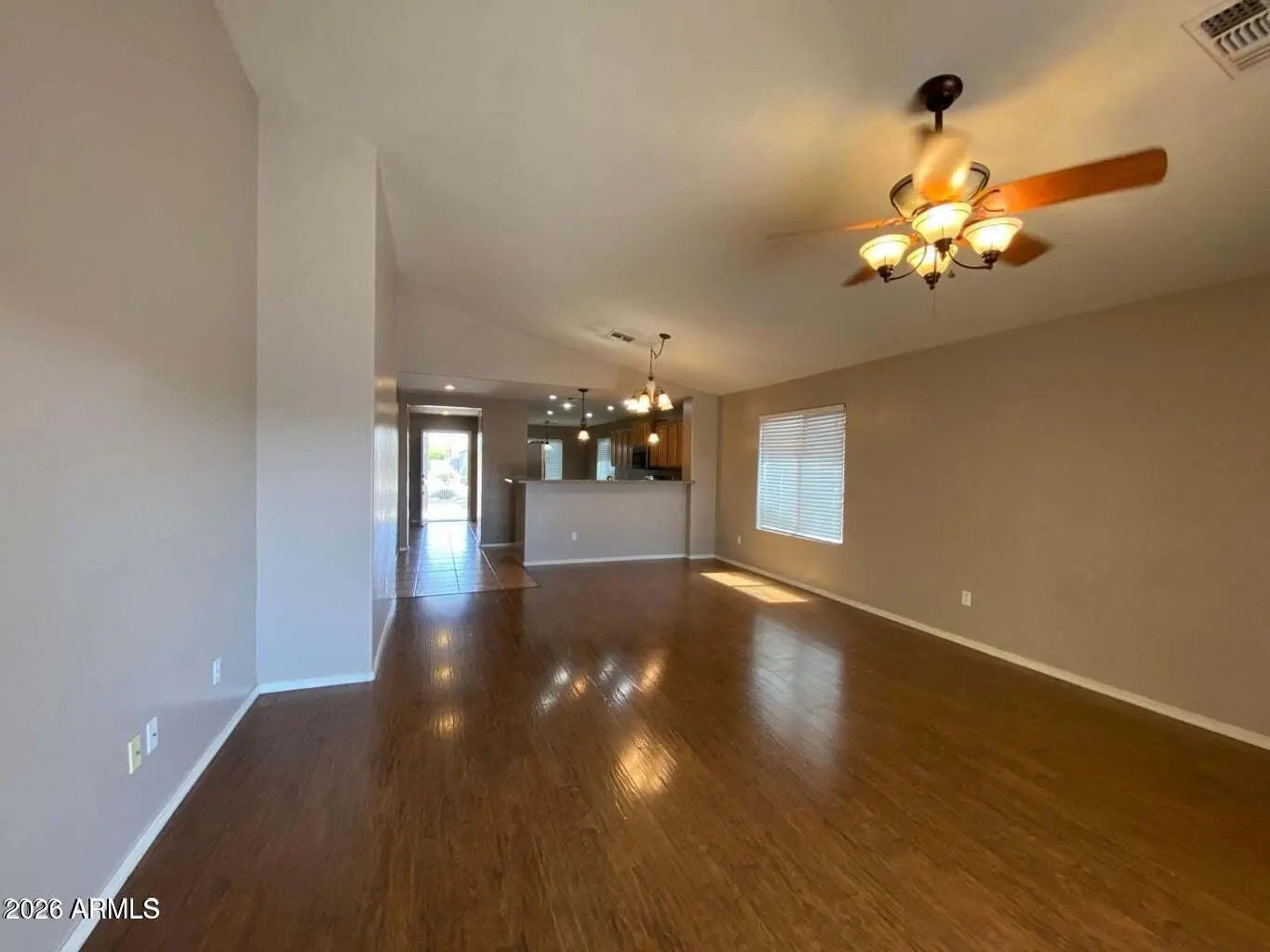 Single story four bedroom two bathroom home offering 1,679 square feet of functional living space. The layout opens into a large living area with vaulted ceilings and clear sightlines to the kitchen. The kitchen includes stainless steel appliances, ample cabinet space, and room for daily dining. Tile and wood style flooring run throughout the main areas, with carpet limited to the primary bedroom. The primary suite includes a walk in closet and private bathroom. Washer and dryer are present but not warranted. Refrigerator included. Covered patio and backyard with no neighbors directly behind. Convenient access to shopping, dining, parks, and commuter routes within approximately three miles.