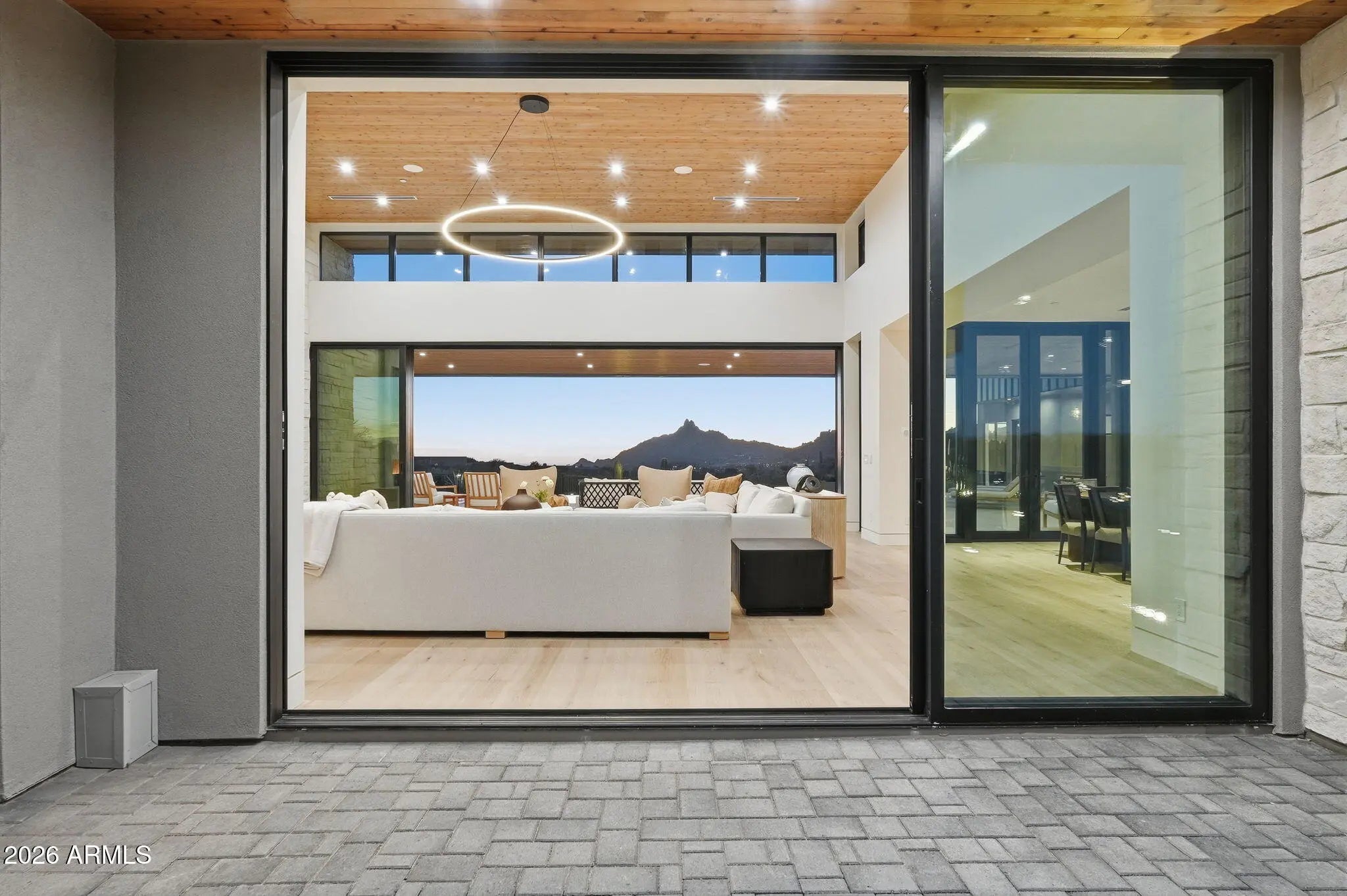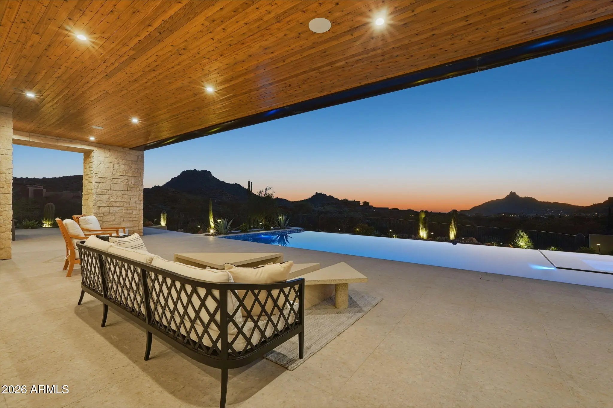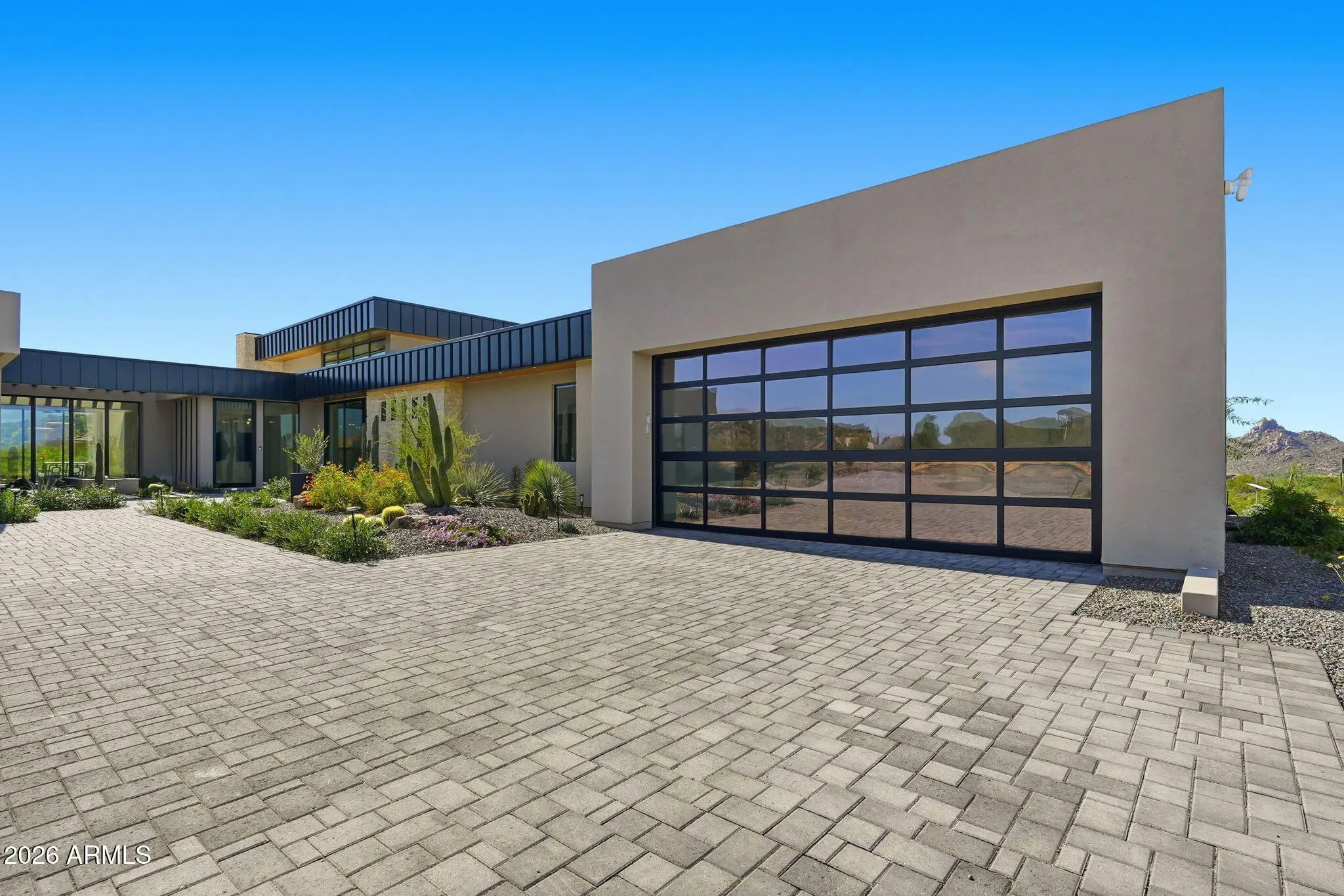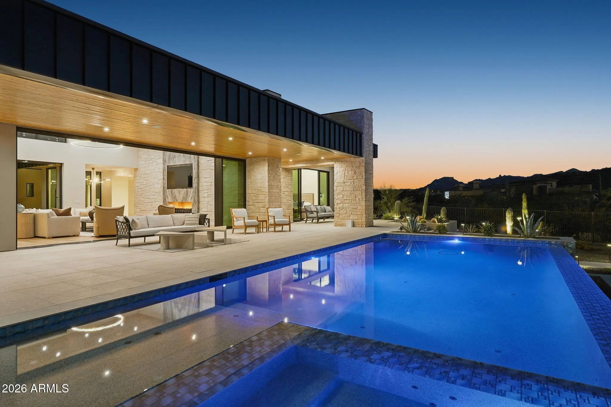 Perched at the end of a private cul-de-sac in the exclusive community of Pinnacle Vista, this newly constructed desert contemporary estate sits on a 3.71-acre elevated pad that captures commanding 360° views of the surrounding Sonoran Valley, Pinnacle Peak, and McDowell Mountains. Designed by ABL Design Studio and brought to life by Ridgeway Construction, this 5,511 sq. ft. livable masterpiece (8,663 sq. ft. under roof) represents the pinnacle of contemporary desert architecture — blending glass, steel, and stone with the natural contours of its landscape. Architectural Elegance This home's design celebrates seamless indoor-outdoor living through floor-to-ceiling glass walls, extended covered patios, and a fluid open-concept floor plan that connects every major space to panoramic desert views and Pinnacle Peak. The main residence offers approximately 4,964 sq. ft. of air-conditioned living, complemented by a 547 sq. ft. detached casita, perfect for guests or a private retreat. Every inch of this residence showcases clean lines, architectural symmetry, and precision detailing that exude modern refinement. Grand Great Room with 14' ceilings and automatic pocketing glass doors opening to a resort-style patio and pool as well as the entryway custom water feature. Designer kitchen with a massive island, top-tier panel ready Monogram appliances, and a butler's pantry crafted for entertaining. Owner's wing featuring a spa-style primary bath, dual vanities, soaking tub, private patio, fireplace, and boutique-style his and hers closet with stackable washer dryer. Dedicated office and fitness suite designed with architectural intention and natural light. 4 Car split executive garages and storage providing space for a luxury car collection or studio use. Outdoor Living Perfectly oriented for Arizona sunsets, the estate features an expansive negative-edge pool, fire features, and multiple lounge terraces that frame the sweeping desert backdrop. Thoughtful desert landscaping by Greey/Pickett preserves the native plant palette while accentuating the modern aesthetic. The site plan ensures maximum privacy, serenity, and harmony with the surrounding desert. From the great room the first visible home is over a city block away. Observing the Valley's best direct view of pinnacle peak" views are preserved as perimeter developments are fully improved. Lifestyle From its elevated position at the end of a cul-de-sac, this property offers rare tranquility and an immersive connection to the desert landscape. Minutes from Troon North, Pinnacle Peak, and Scottsdale's finest golf, dining, and hiking, this home redefines luxury desert living where architecture, craftsmanship, and nature exist in perfect balance.