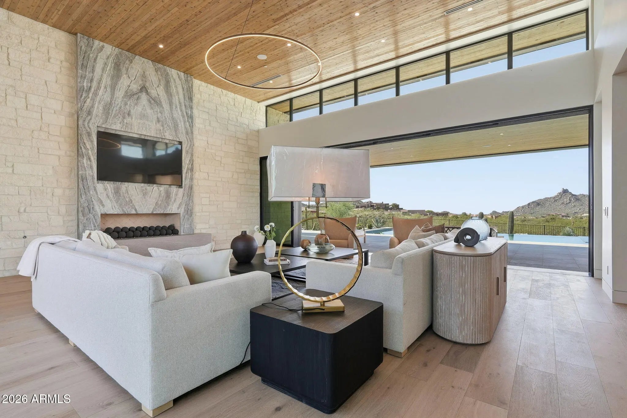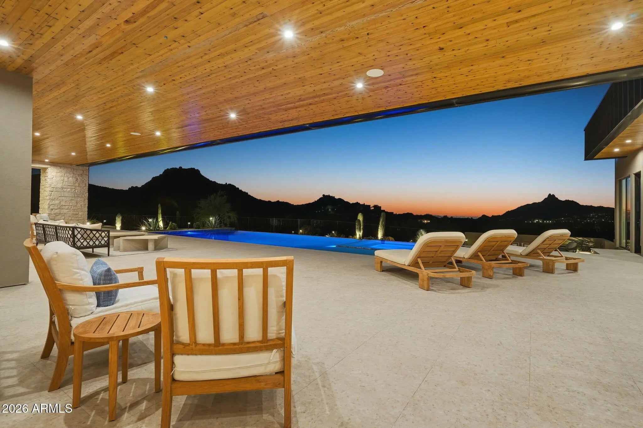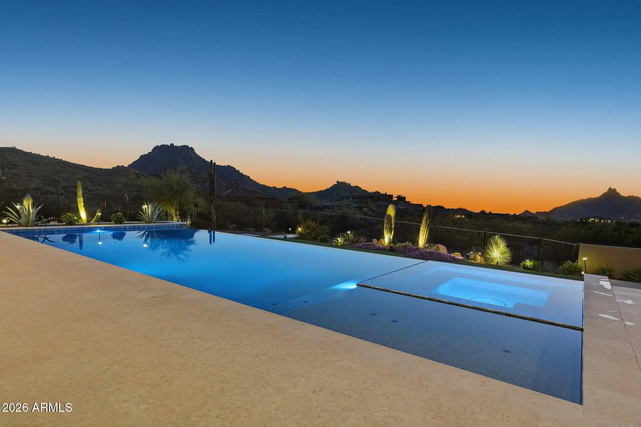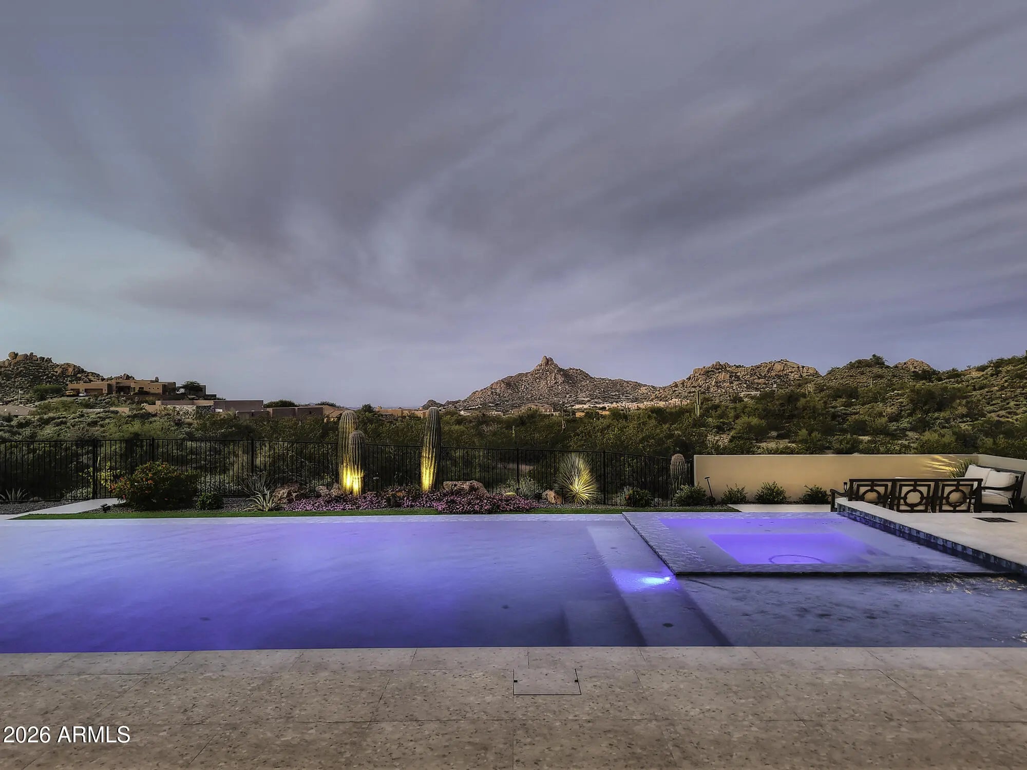 Perched at the end of a private cul-de-sac in the exclusive community of Pinnacle Vista, this newly constructed desert contemporary estate sits on a 3.71-acre elevated pad that captures commanding 360° views of the surrounding Sonoran Valley, Pinnacle Peak, and McDowell Mountains. Designed by ABL Design Studio and brought to life by Ridgeway Construction, this 5,511 sq. ft. livable masterpiece (8,663 sq. ft. under roof) represents the pinnacle of contemporary desert architecture — blending glass, steel, and stone with the natural contours of its landscape. Architectural Elegance This home's design celebrates seamless indoor-outdoor living through floor-to-ceiling glass walls, extended covered patios, and a fluid open-concept floor plan that connects every major space to panoramic desert views and Pinnacle Peak. The main residence offers approximately 4,964 sq. ft. of air-conditioned living, complemented by a 547 sq. ft. detached casita, perfect for guests or a private retreat. Every inch of this residence showcases clean lines, architectural symmetry, and precision detailing that exude modern refinement. Grand Great Room with 14' ceilings and automatic pocketing glass doors opening to a resort-style patio and pool as well as the entryway custom water feature. Designer kitchen with a massive island, top-tier panel ready Monogram appliances, and a butler's pantry crafted for entertaining. Owner's wing featuring a spa-style primary bath, dual vanities, soaking tub, private patio, fireplace, and boutique-style his and hers closet with stackable washer dryer. Dedicated office and fitness suite designed with architectural intention and natural light. 4 Car split executive garages and storage providing space for a luxury car collection or studio use. Outdoor Living Perfectly oriented for Arizona sunsets, the estate features an expansive negative-edge pool, fire features, and multiple lounge terraces that frame the sweeping desert backdrop. Thoughtful desert landscaping by Greey/Pickett preserves the native plant palette while accentuating the modern aesthetic. The site plan ensures maximum privacy, serenity, and harmony with the surrounding desert. From the great room the first visible home is over a city block away. Observing the Valley's best direct view of pinnacle peak" views are preserved as perimeter developments are fully improved. Lifestyle From its elevated position at the end of a cul-de-sac, this property offers rare tranquility and an immersive connection to the desert landscape. Minutes from Troon North, Pinnacle Peak, and Scottsdale's finest golf, dining, and hiking, this home redefines luxury desert living where architecture, craftsmanship, and nature exist in perfect balance.