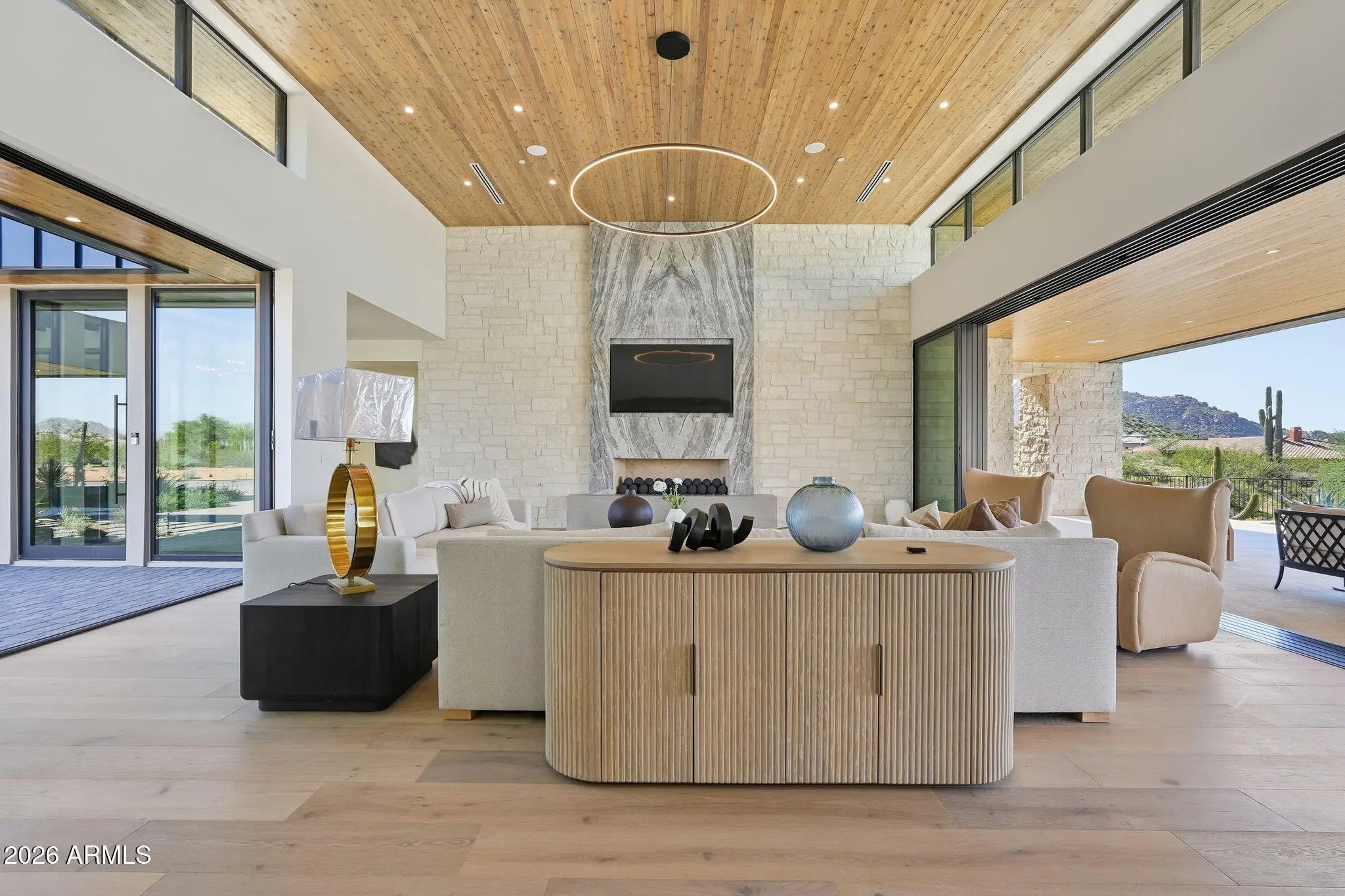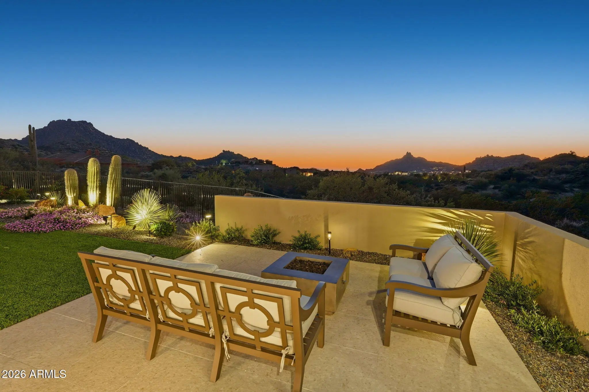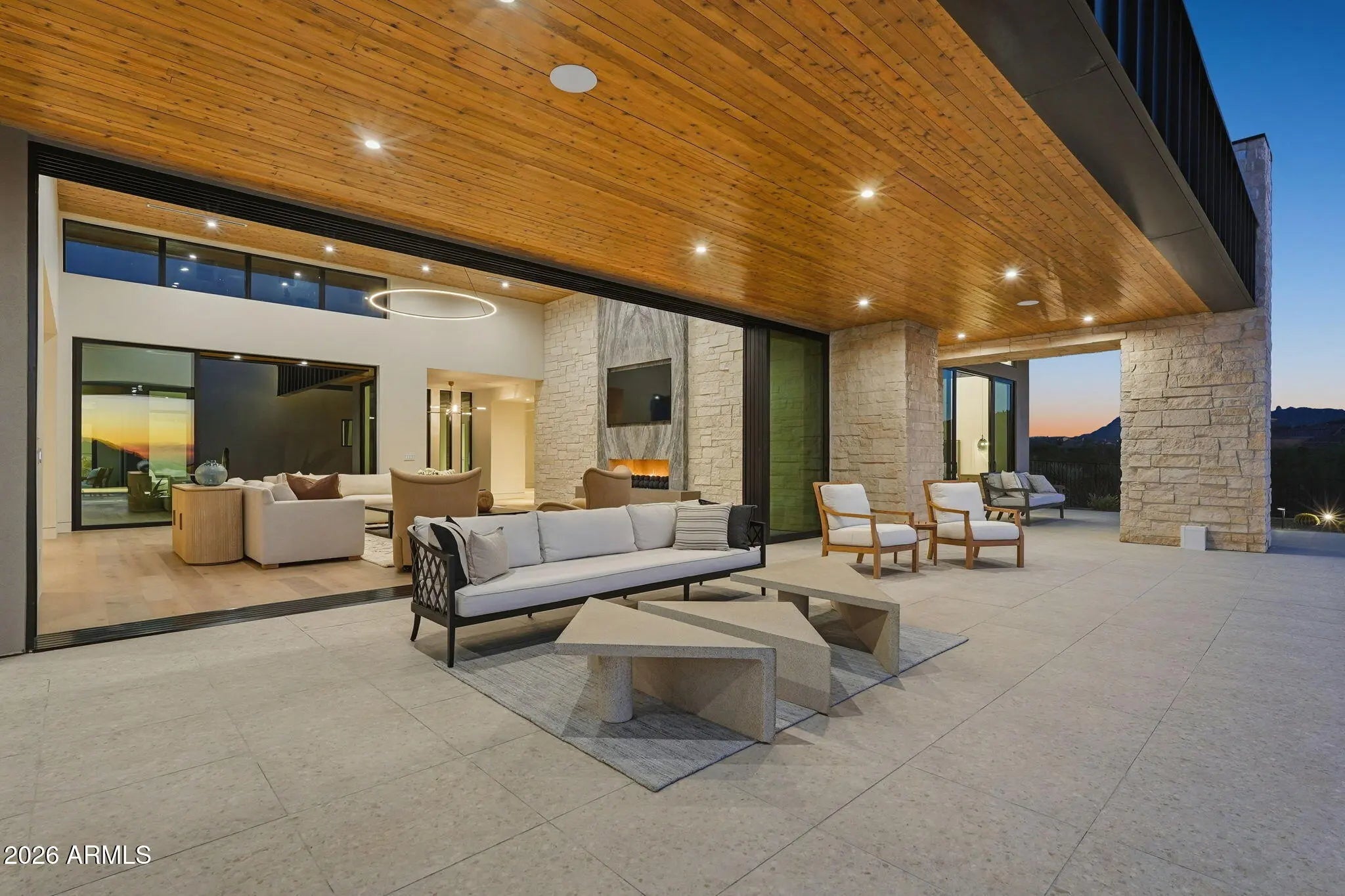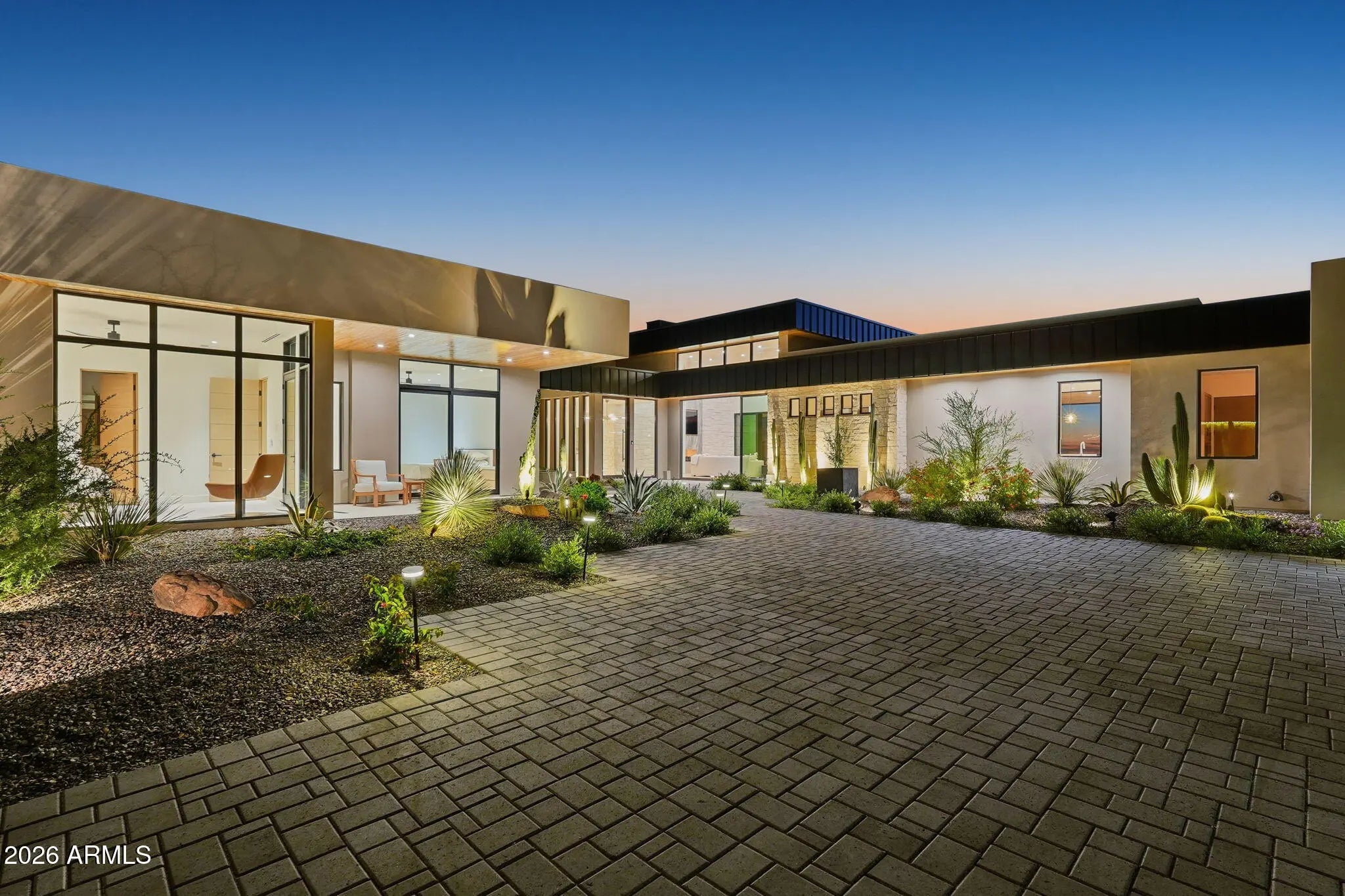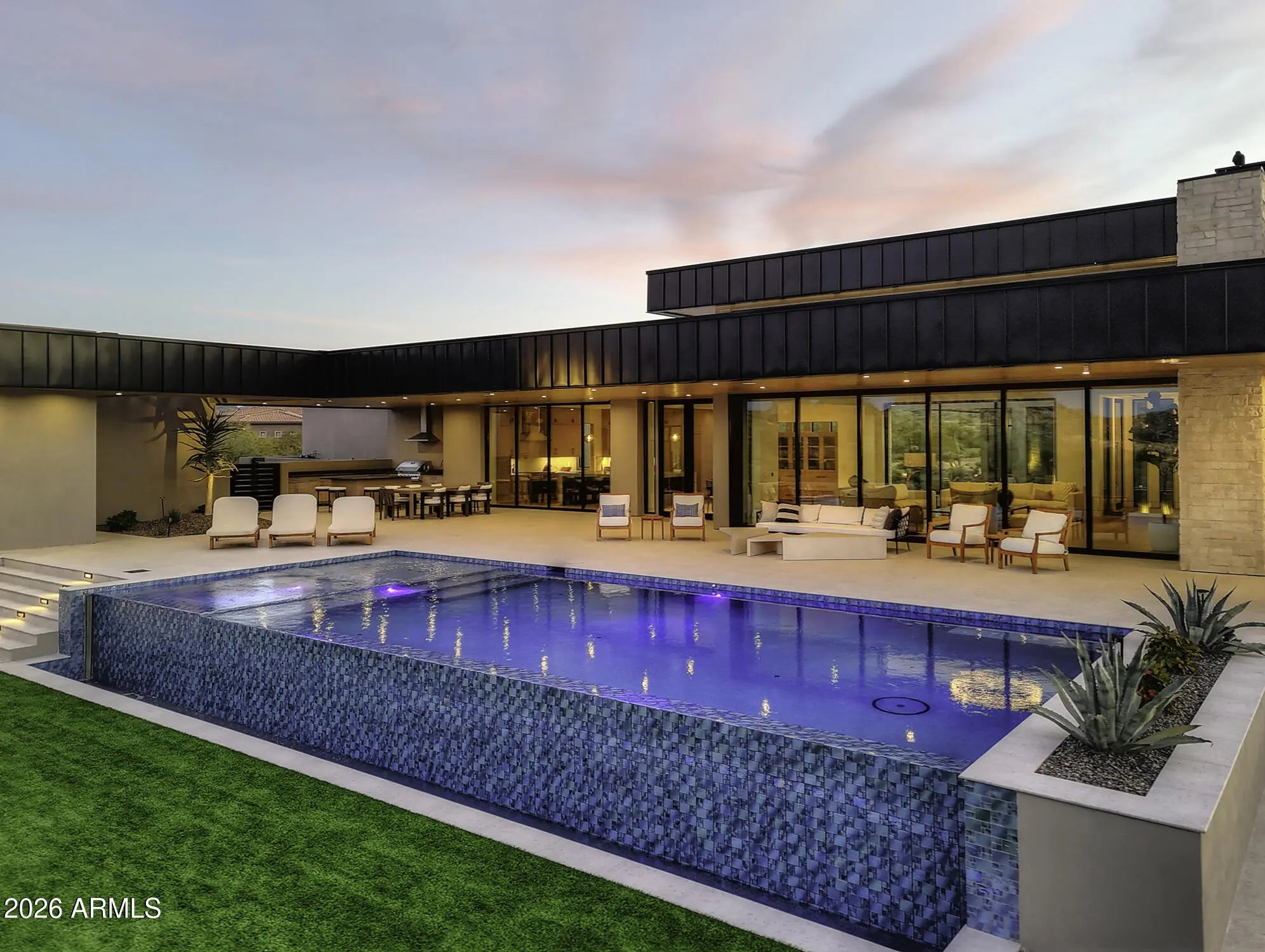 Perched at the end of a private cul-de-sac in the exclusive community of Pinnacle Vista, this newly constructed desert contemporary estate sits on a 3.71-acre elevated pad that captures commanding 360° views of the surrounding Sonoran Valley, Pinnacle Peak, and McDowell Mountains. Designed by ABL Design Studio and brought to life by Ridgeway Construction, this 5,511 sq. ft. livable masterpiece (8,663 sq. ft. under roof) represents the pinnacle of contemporary desert architecture — blending glass, steel, and stone with the natural contours of its landscape. Architectural Elegance This home's design celebrates seamless indoor-outdoor living through floor-to-ceiling glass walls, extended covered patios, and a fluid open-concept floor plan that connects every major space to panoramic desert views and Pinnacle Peak. The main residence offers approximately 4,964 sq. ft. of air-conditioned living, complemented by a 547 sq. ft. detached casita, perfect for guests or a private retreat. Every inch of this residence showcases clean lines, architectural symmetry, and precision detailing that exude modern refinement. Grand Great Room with 14' ceilings and automatic pocketing glass doors opening to a resort-style patio and pool as well as the entryway custom water feature. Designer kitchen with a massive island, top-tier panel ready Monogram appliances, and a butler's pantry crafted for entertaining. Owner's wing featuring a spa-style primary bath, dual vanities, soaking tub, private patio, fireplace, and boutique-style his and hers closet with stackable washer dryer. Dedicated office and fitness suite designed with architectural intention and natural light. 4 Car split executive garages and storage providing space for a luxury car collection or studio use. Outdoor Living Perfectly oriented for Arizona sunsets, the estate features an expansive negative-edge pool, fire features, and multiple lounge terraces that frame the sweeping desert backdrop. Thoughtful desert landscaping by Greey/Pickett preserves the native plant palette while accentuating the modern aesthetic. The site plan ensures maximum privacy, serenity, and harmony with the surrounding desert. From the great room the first visible home is over a city block away. Observing the Valley's best direct view of pinnacle peak" views are preserved as perimeter developments are fully improved. Lifestyle From its elevated position at the end of a cul-de-sac, this property offers rare tranquility and an immersive connection to the desert landscape. Minutes from Troon North, Pinnacle Peak, and Scottsdale's finest golf, dining, and hiking, this home redefines luxury desert living where architecture, craftsmanship, and nature exist in perfect balance.