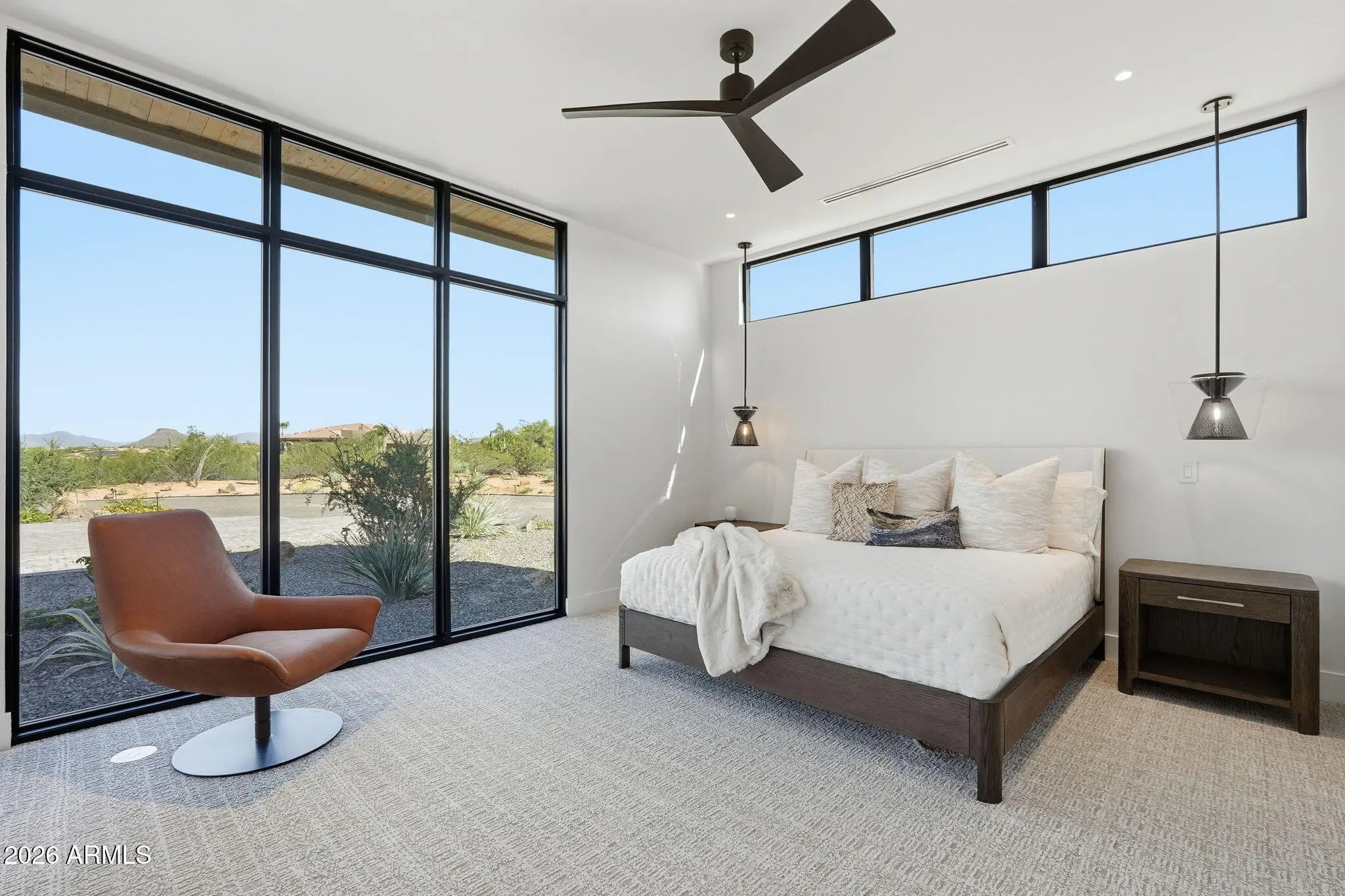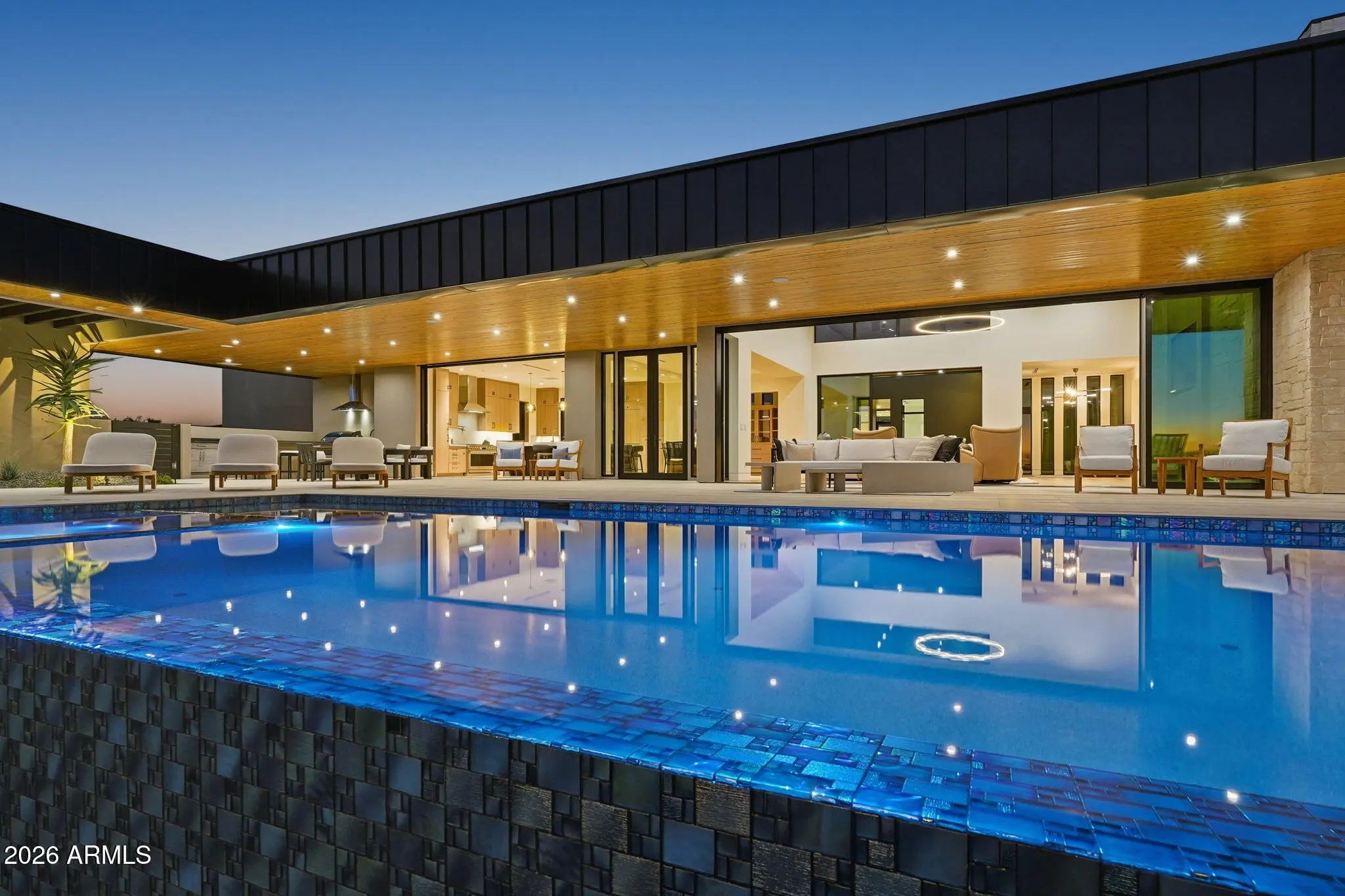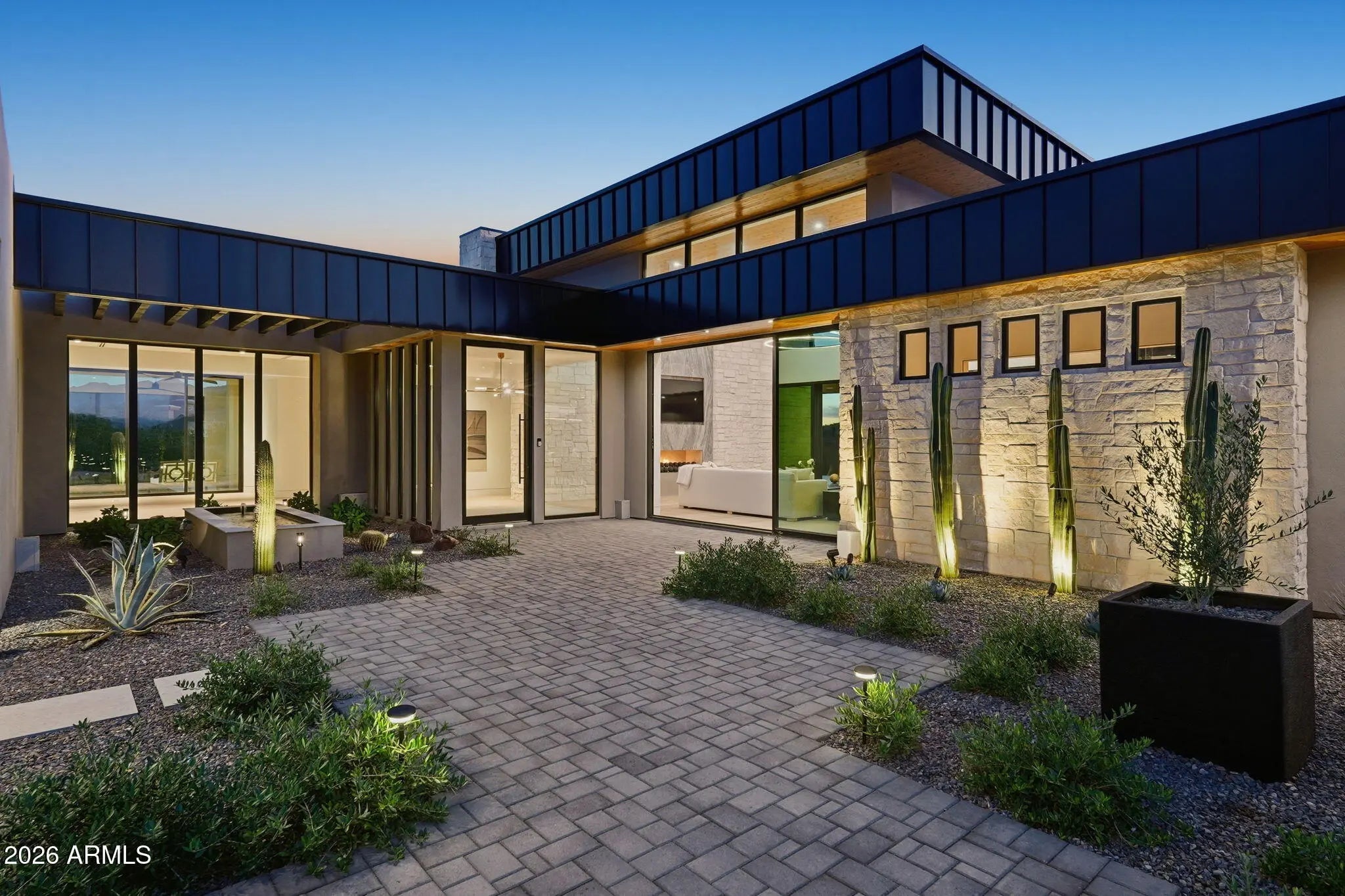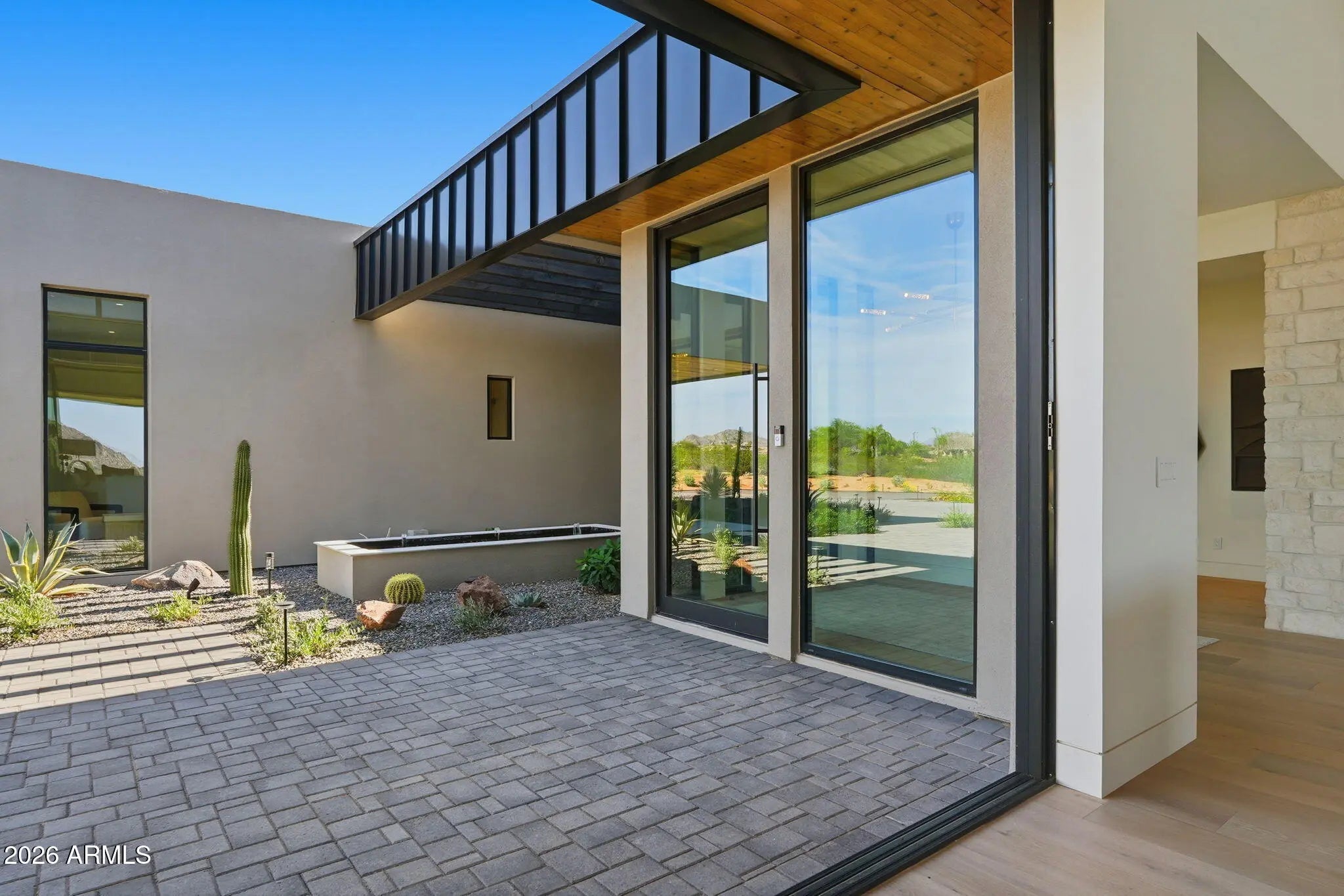 Perched at the end of a private cul-de-sac in the exclusive community of Pinnacle Vista, this newly constructed desert contemporary estate sits on a 3.71-acre elevated pad that captures commanding 360° views of the surrounding Sonoran Valley, Pinnacle Peak, and McDowell Mountains. Designed by ABL Design Studio and brought to life by Ridgeway Construction, this 5,511 sq. ft. livable masterpiece (8,663 sq. ft. under roof) represents the pinnacle of contemporary desert architecture — blending glass, steel, and stone with the natural contours of its landscape. Architectural Elegance This home's design celebrates seamless indoor-outdoor living through floor-to-ceiling glass walls, extended covered patios, and a fluid open-concept floor plan that connects every major space to panoramic desert views and Pinnacle Peak. The main residence offers approximately 4,964 sq. ft. of air-conditioned living, complemented by a 547 sq. ft. detached casita, perfect for guests or a private retreat. Every inch of this residence showcases clean lines, architectural symmetry, and precision detailing that exude modern refinement. Grand Great Room with 14' ceilings and automatic pocketing glass doors opening to a resort-style patio and pool as well as the entryway custom water feature. Designer kitchen with a massive island, top-tier panel ready Monogram appliances, and a butler's pantry crafted for entertaining. Owner's wing featuring a spa-style primary bath, dual vanities, soaking tub, private patio, fireplace, and boutique-style his and hers closet with stackable washer dryer. Dedicated office and fitness suite designed with architectural intention and natural light. 4 Car split executive garages and storage providing space for a luxury car collection or studio use. Outdoor Living Perfectly oriented for Arizona sunsets, the estate features an expansive negative-edge pool, fire features, and multiple lounge terraces that frame the sweeping desert backdrop. Thoughtful desert landscaping by Greey/Pickett preserves the native plant palette while accentuating the modern aesthetic. The site plan ensures maximum privacy, serenity, and harmony with the surrounding desert. From the great room the first visible home is over a city block away. Observing the Valley's best direct view of pinnacle peak" views are preserved as perimeter developments are fully improved. Lifestyle From its elevated position at the end of a cul-de-sac, this property offers rare tranquility and an immersive connection to the desert landscape. Minutes from Troon North, Pinnacle Peak, and Scottsdale's finest golf, dining, and hiking, this home redefines luxury desert living where architecture, craftsmanship, and nature exist in perfect balance.