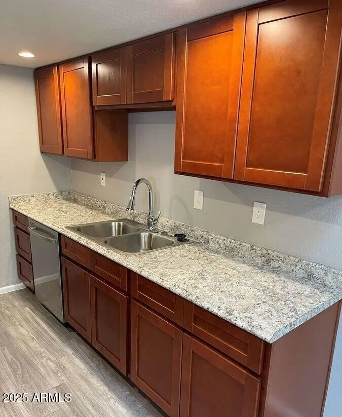 Generously sized 2 bedroom 2 bathroom unit located in Glendale with wood plank flooring and custom grey paint throughout. As you walk-in the front door, you will be greeted by a bright open concept living room and eat-in kitchen area. The kitchen has updated shaker style cabinets, double sink and full stainless steel appliance package. The primary bedroom also has an updated vanity in the private bathroom and walk-in closet. Other amenities include a dedicated laundry room with washer/dryer, carport and an enclosed patio with private yard area. This cozy community has a pool for the hot Arizona summer, a dog station and close to historic area of Glendale, shopping and restaurants. Pet-friendly for up to two spayed/neutered pets with a $350 fee per pet.
