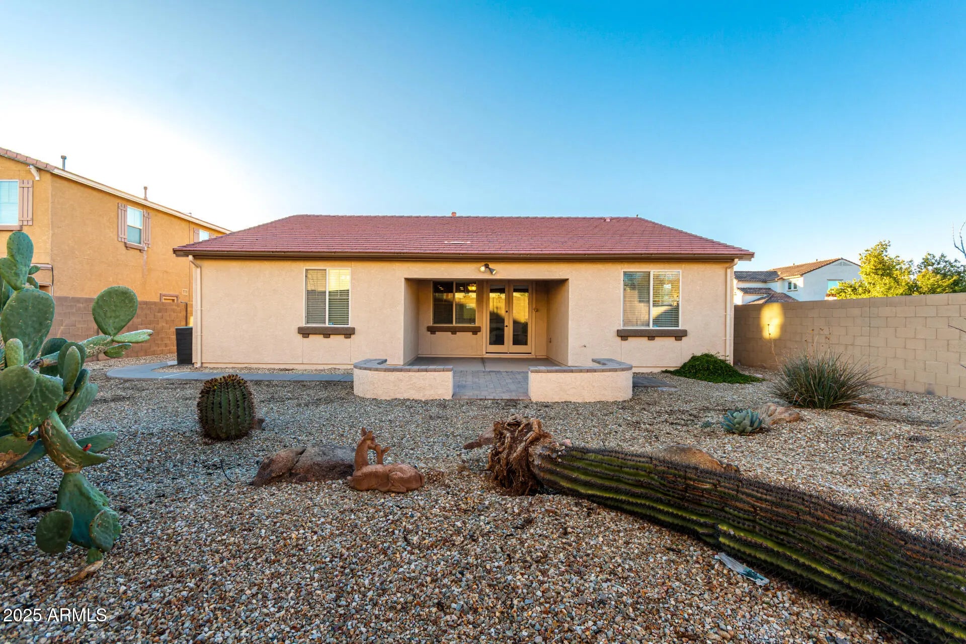 Home, sweet home! This gorgeous 4-bedroom residence awaits you on a desirable corner lot in Desert Oasis! Inside, you'll be charmed by sizable living spaces featuring tile flooring, carpet in select areas, abundant natural light, a neutral palette, surround sound system ideal for fun movie nights, and arched passageways that allow you to transition from one space to another in harmony. The impeccable kitchen is equipped with ample cabinetry adorned with crown molding, granite countertops, built-in appliances, and an island featuring a breakfast bar, perfect for casual conversations and quick bites. The serene main retreat boasts a walk-in closet for easy organization and a bathroom with dual sinks and a separate shower & tub. The backyard is complete with a covered patio ideal for morning coffee or outdoor entertaining, a nice seating space with pavers, and a relaxing landscape. This home also features a convenient central vacuum system and fresh exterior paint. Come check out this great home in a wonderful family friendly neighborhood.