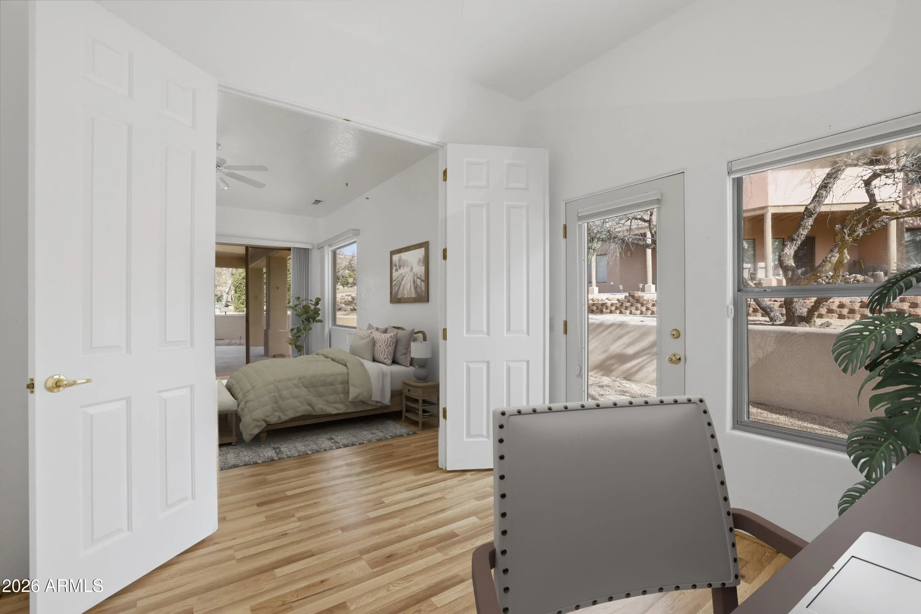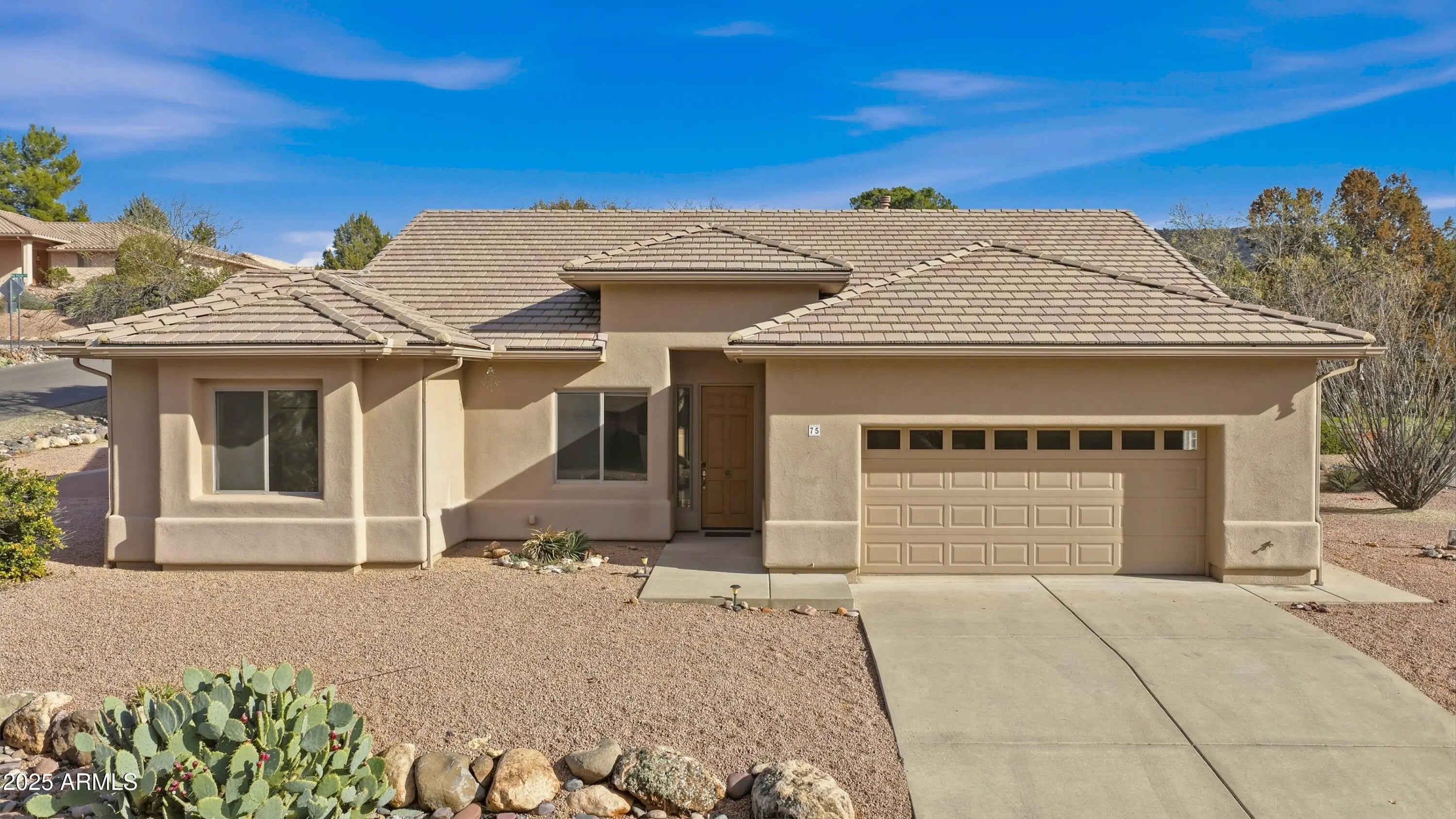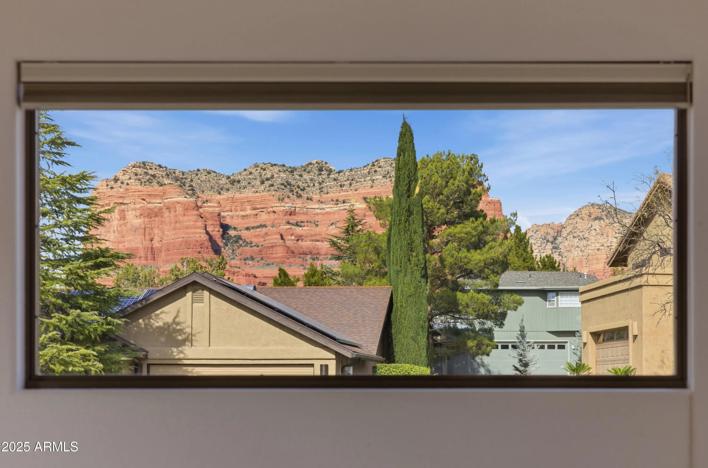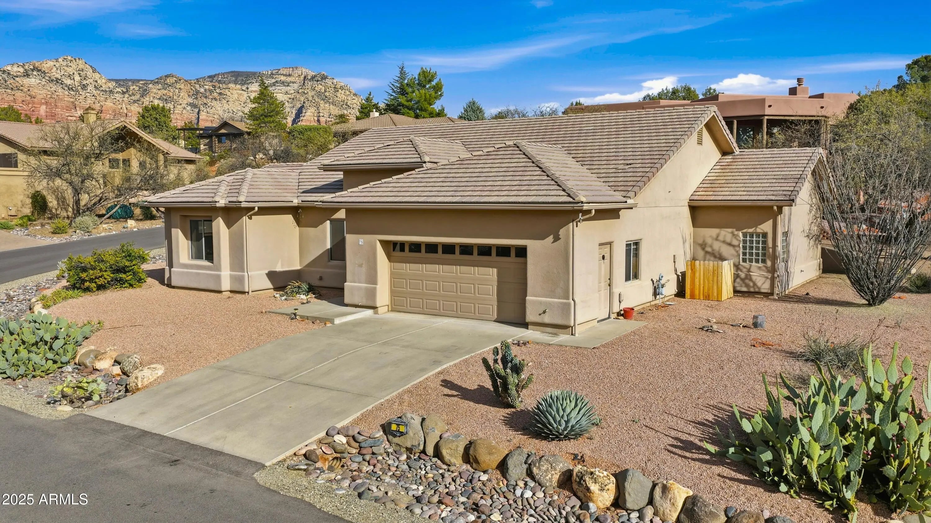 This charming single level 1978 square feet 3 bedroom 2 bath Southwestern home sits on a sunny corner lot with red rock views from the living room and front bedroom and offers a welcoming, easygoing feel from the moment you arrive. Inside, soaring ceilings and classic niches add character, while wood-look laminate and tile flooring create warmth and comfort throughout. The kitchen, dining, and living areas come together as one inviting great room, light and air, and perfect for everyday living and relaxed gatherings. Kitchen features a breakfast bar height island, and custom built-in oak cabinetry that add both charm and generous storage. The living room opens directly to a large covered backyard patio with ceiling fans ideal for morning coffee, outdoor meals, or unwinding in the shade. The primary bedroom also opens to the covered patio and includes a versatile sitting room - awesome as a home office or exercise space. And with its own private exterior entrance and a sweet little patio it's perfect! The primary bath offers dual sinks, a make up station, large walk in closet and a corner garden soaking tub for relaxing at day's end. AHHH!!! Home boasts a split floorplan offering two additional bedrooms, a full guest bath, hallway with built in cabinets. and a separate laundry room with built in cabinets is another plus! Need more storage? No problem, the two-car garage offers more built in additional storage cabinets and completes the picture of this inviting southwestern Sedona gem that is calling you home to a lifestyle that's easy to settle into and enjoy.