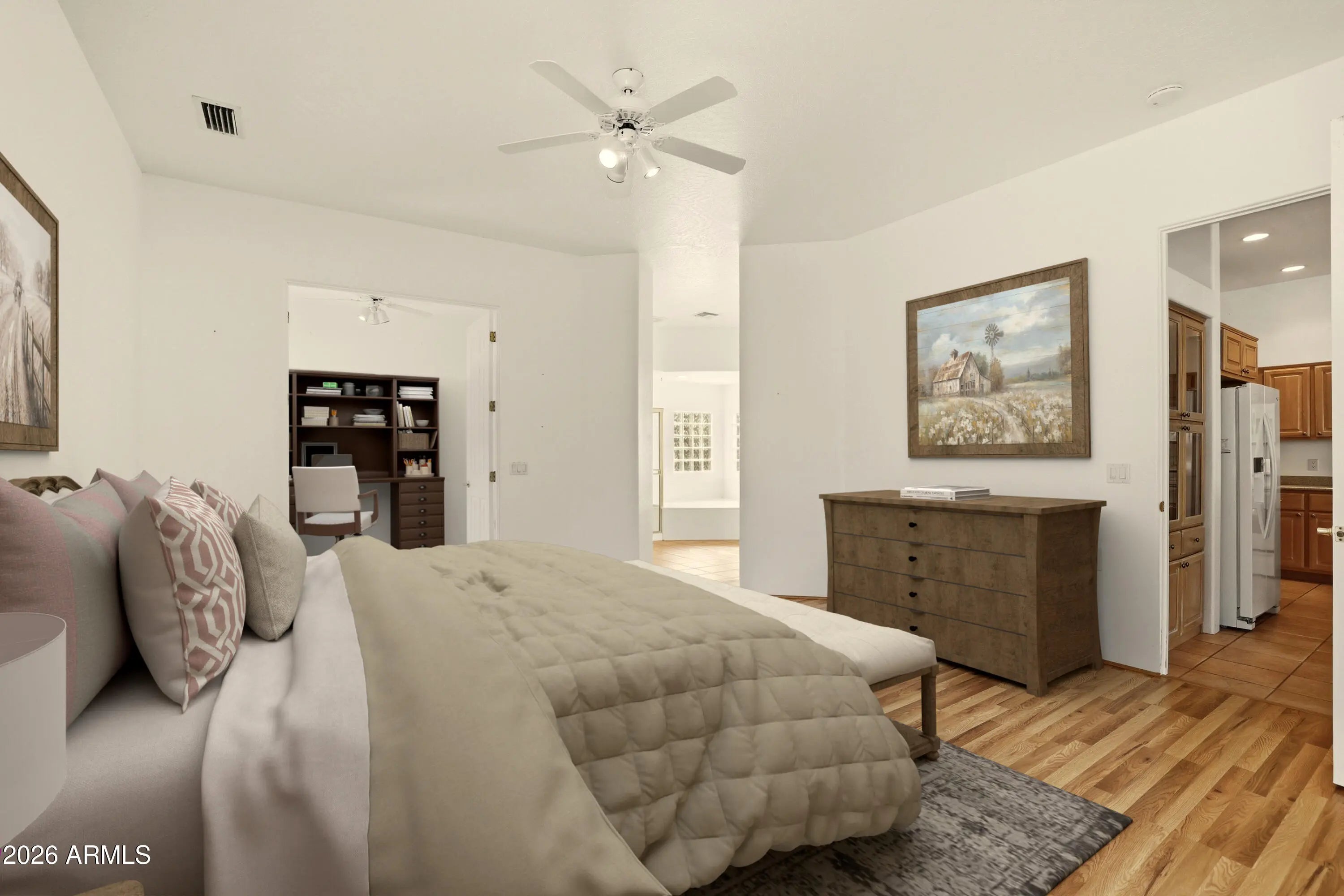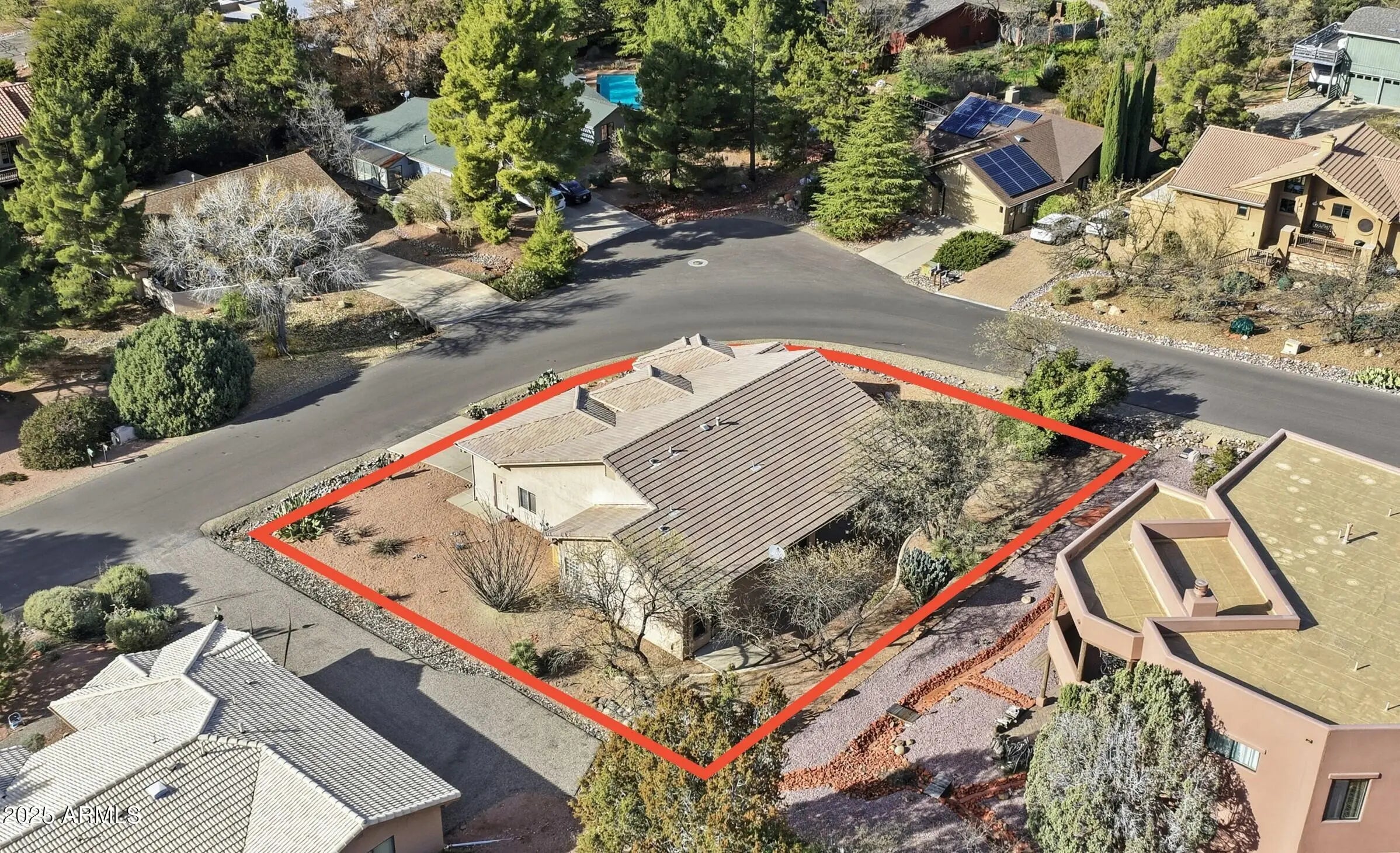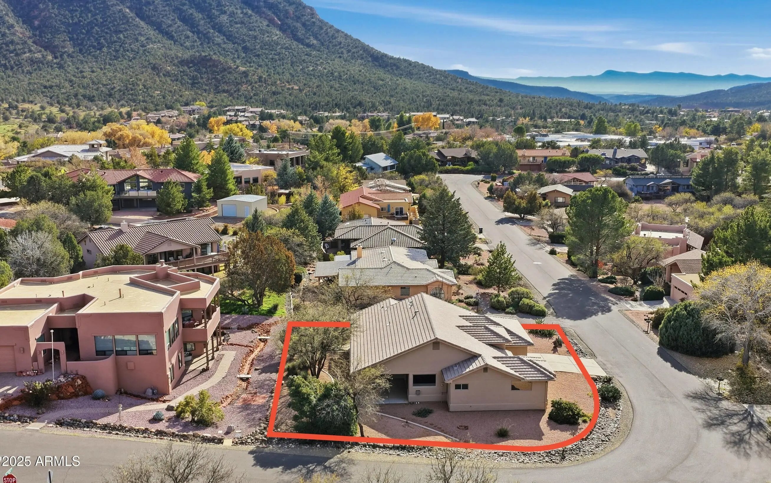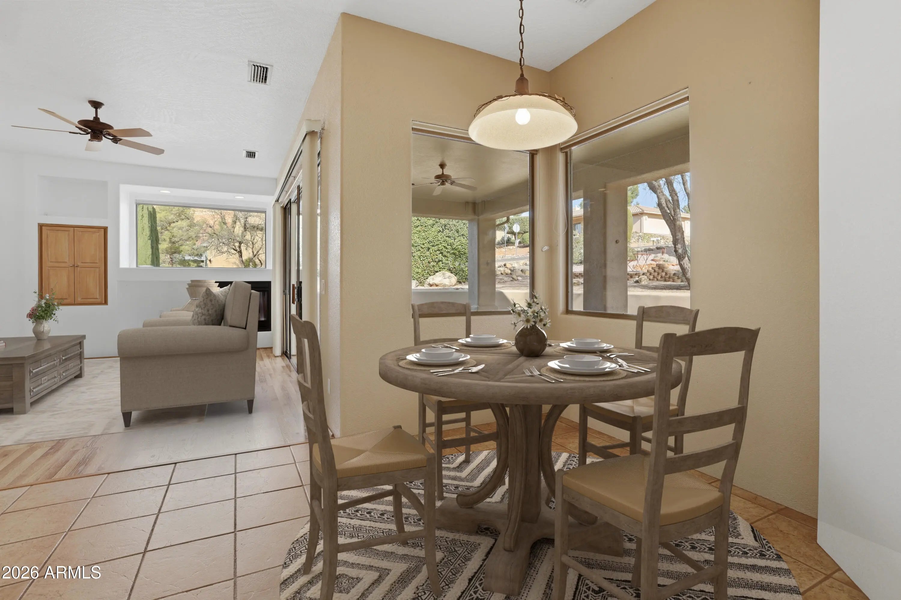 This charming single level 1978 square feet 3 bedroom 2 bath Southwestern home sits on a sunny corner lot with red rock views from the living room and front bedroom and offers a welcoming, easygoing feel from the moment you arrive. Inside, soaring ceilings and classic niches add character, while wood-look laminate and tile flooring create warmth and comfort throughout. The kitchen, dining, and living areas come together as one inviting great room, light and air, and perfect for everyday living and relaxed gatherings. Kitchen features a breakfast bar height island, and custom built-in oak cabinetry that add both charm and generous storage. The living room opens directly to a large covered backyard patio with ceiling fans ideal for morning coffee, outdoor meals, or unwinding in the shade. The primary bedroom also opens to the covered patio and includes a versatile sitting room - awesome as a home office or exercise space. And with its own private exterior entrance and a sweet little patio it's perfect! The primary bath offers dual sinks, a make up station, large walk in closet and a corner garden soaking tub for relaxing at day's end. AHHH!!! Home boasts a split floorplan offering two additional bedrooms, a full guest bath, hallway with built in cabinets. and a separate laundry room with built in cabinets is another plus! Need more storage? No problem, the two-car garage offers more built in additional storage cabinets and completes the picture of this inviting southwestern Sedona gem that is calling you home to a lifestyle that's easy to settle into and enjoy.
