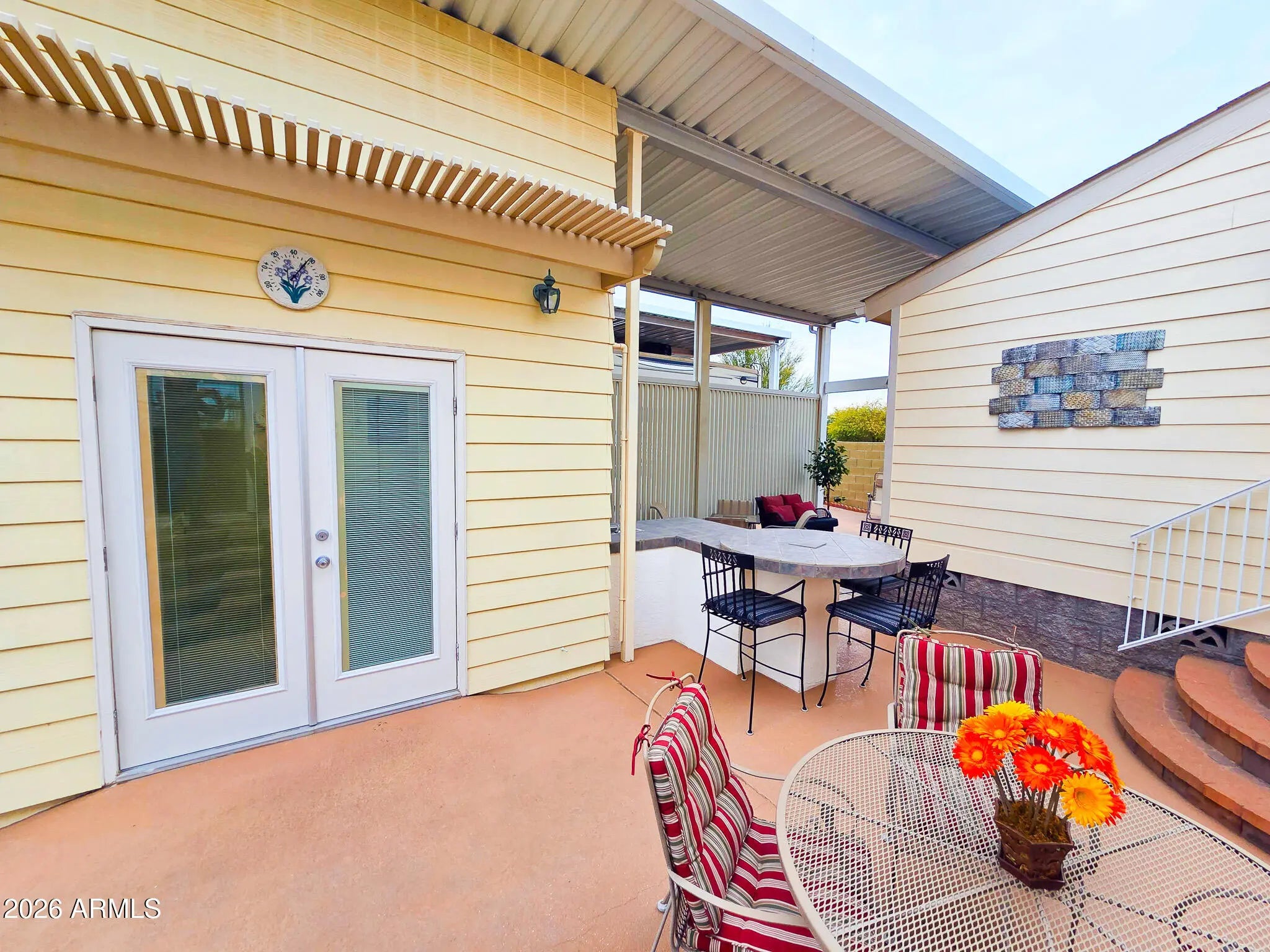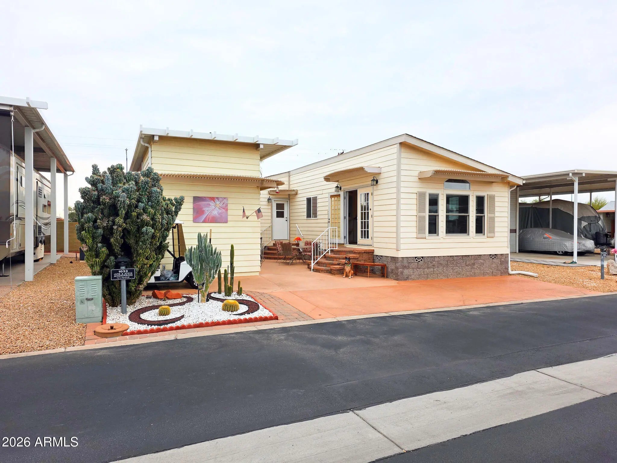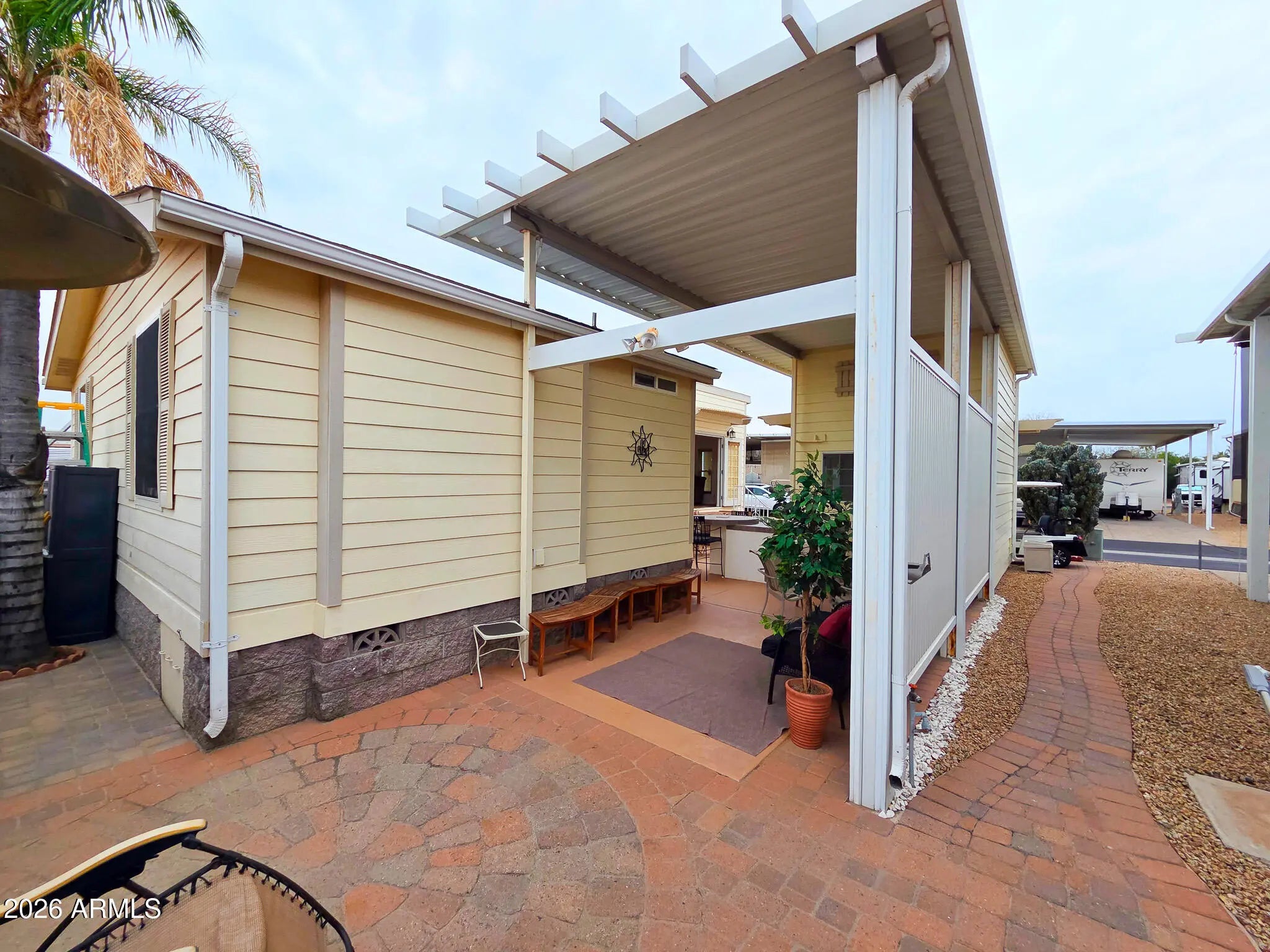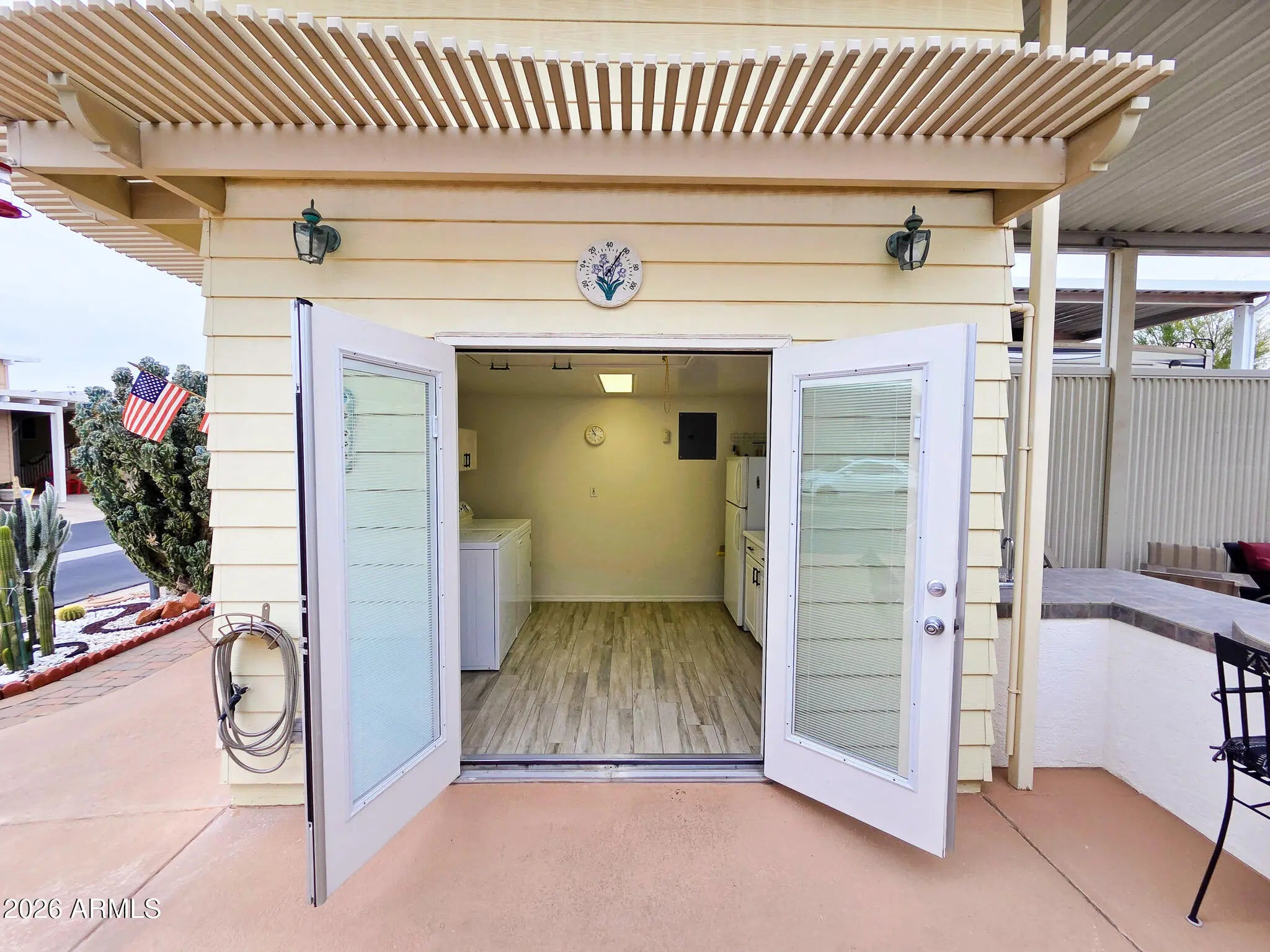 This is not your average Snugglewide. Built in 2007, this 2bd/2ba home is solid, upgraded, and set on a permanent foundation with R-38 walls and ceiling. New Andersen windows, newer flooring, newer A/C with heat pump, a 30-year architectural roof, French doors, and a main bedroom ensuite with a step-in shower cover the major improvements. The casita-style shed is a bonus: French doors, washer, dryer, laundry sink, and tons of overhead storage. Out back is where it really shines—private entertaining space tucked behind the shed with a built-in wet bar and raised seating, backing to a block wall with no neighbors behind. Located in Happy Trails Resort, offering full lot ownership and low HOAs that include water, sewer, trash, amenities, activities, and an impressively active social scene.