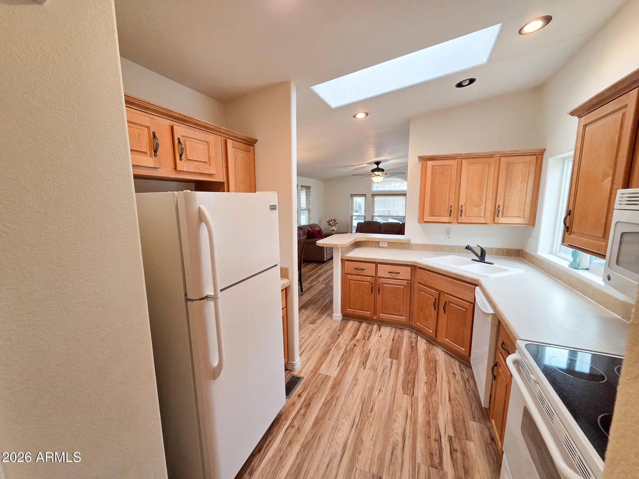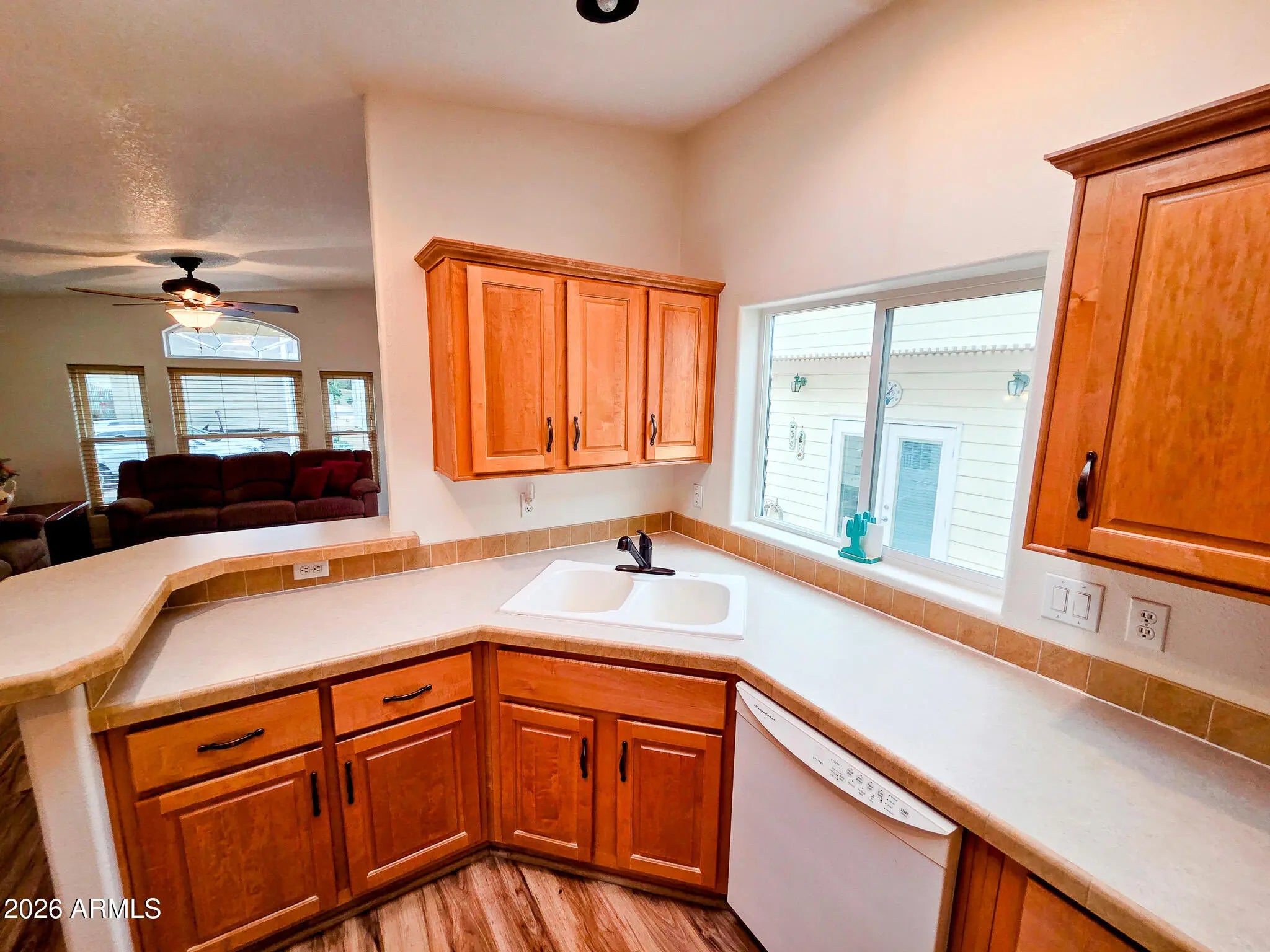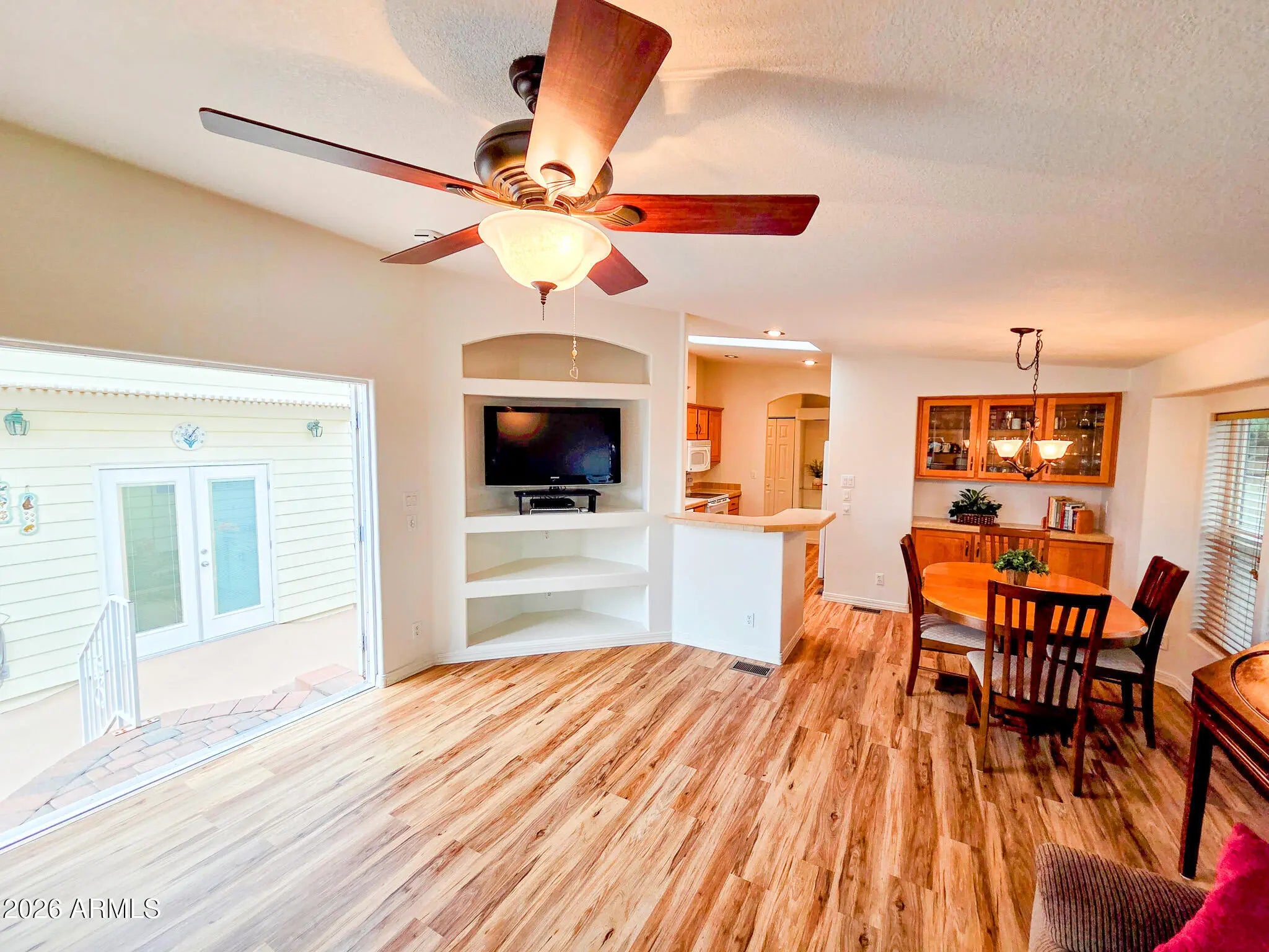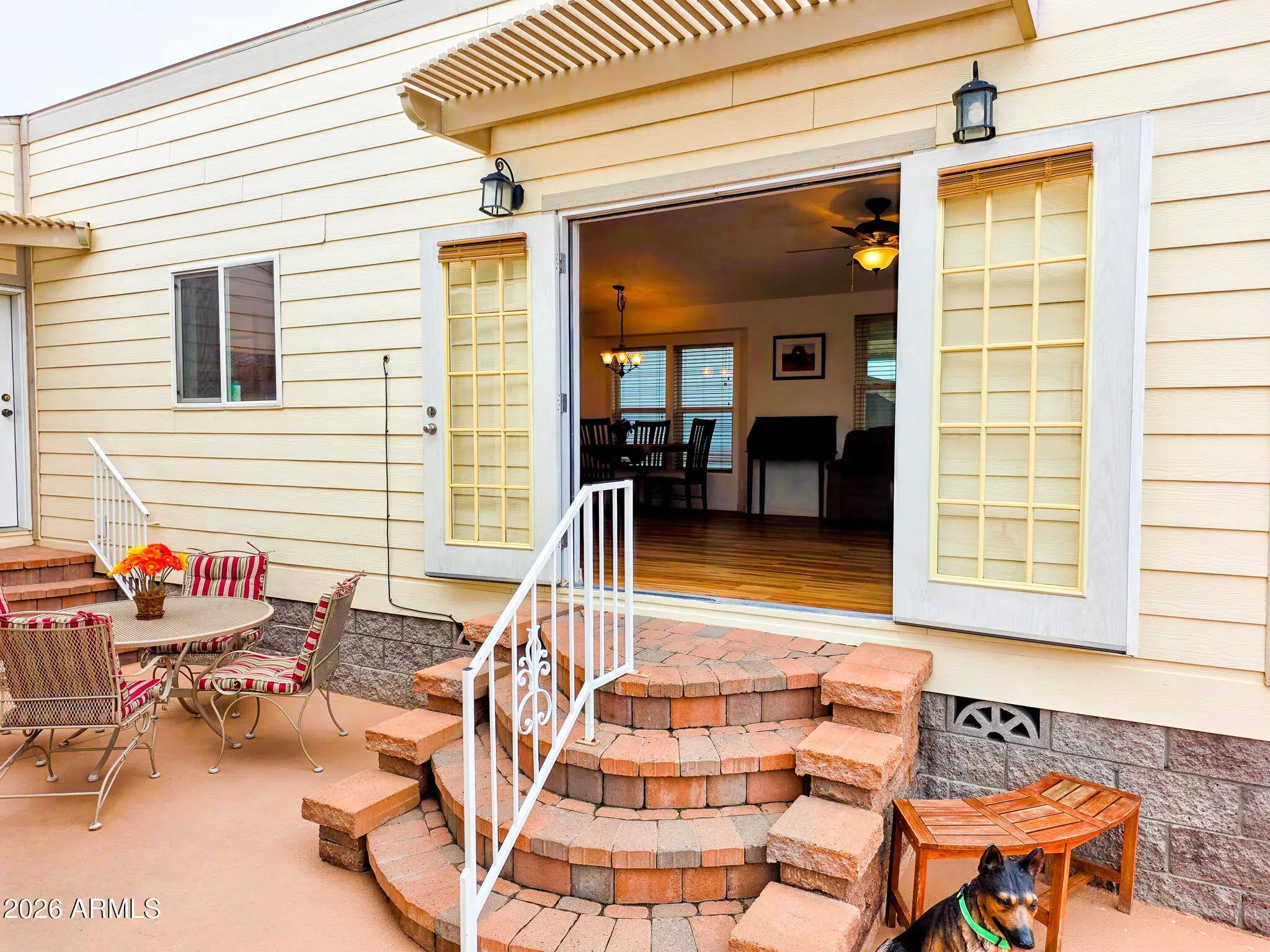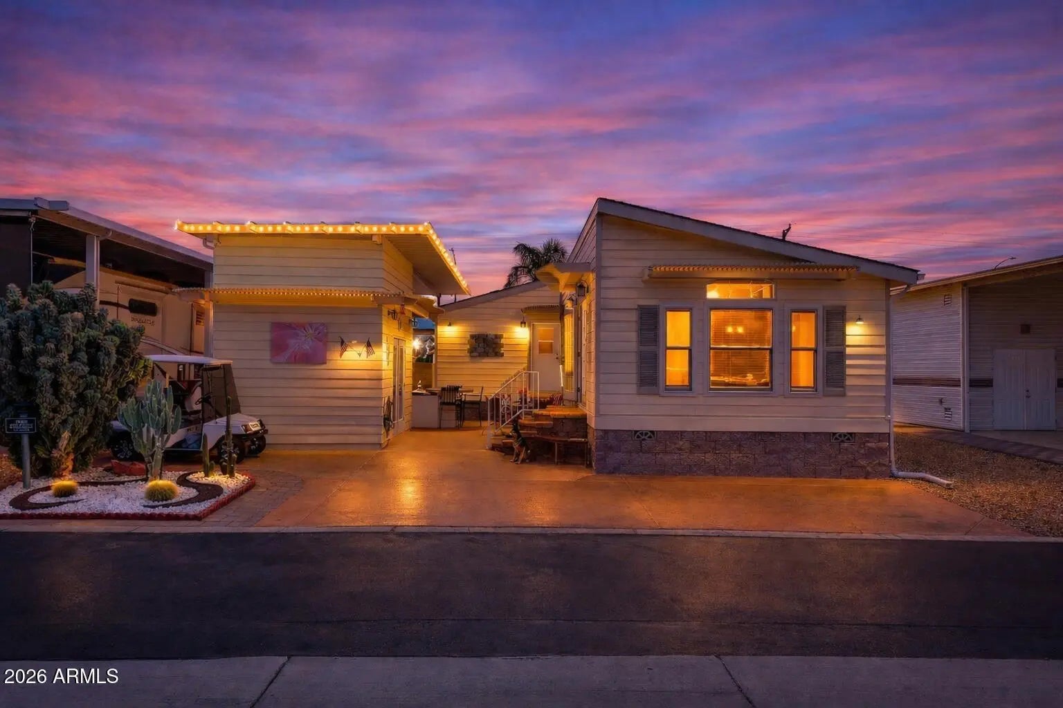 This is not your average Snugglewide. Built in 2007, this 2bd/2ba home is solid, upgraded, and set on a permanent foundation with R-38 walls and ceiling. New Andersen windows, newer flooring, newer A/C with heat pump, a 30-year architectural roof, French doors, and a main bedroom ensuite with a step-in shower cover the major improvements. The casita-style shed is a bonus: French doors, washer, dryer, laundry sink, and tons of overhead storage. Out back is where it really shines—private entertaining space tucked behind the shed with a built-in wet bar and raised seating, backing to a block wall with no neighbors behind. Located in Happy Trails Resort, offering full lot ownership and low HOAs that include water, sewer, trash, amenities, activities, and an impressively active social scene.