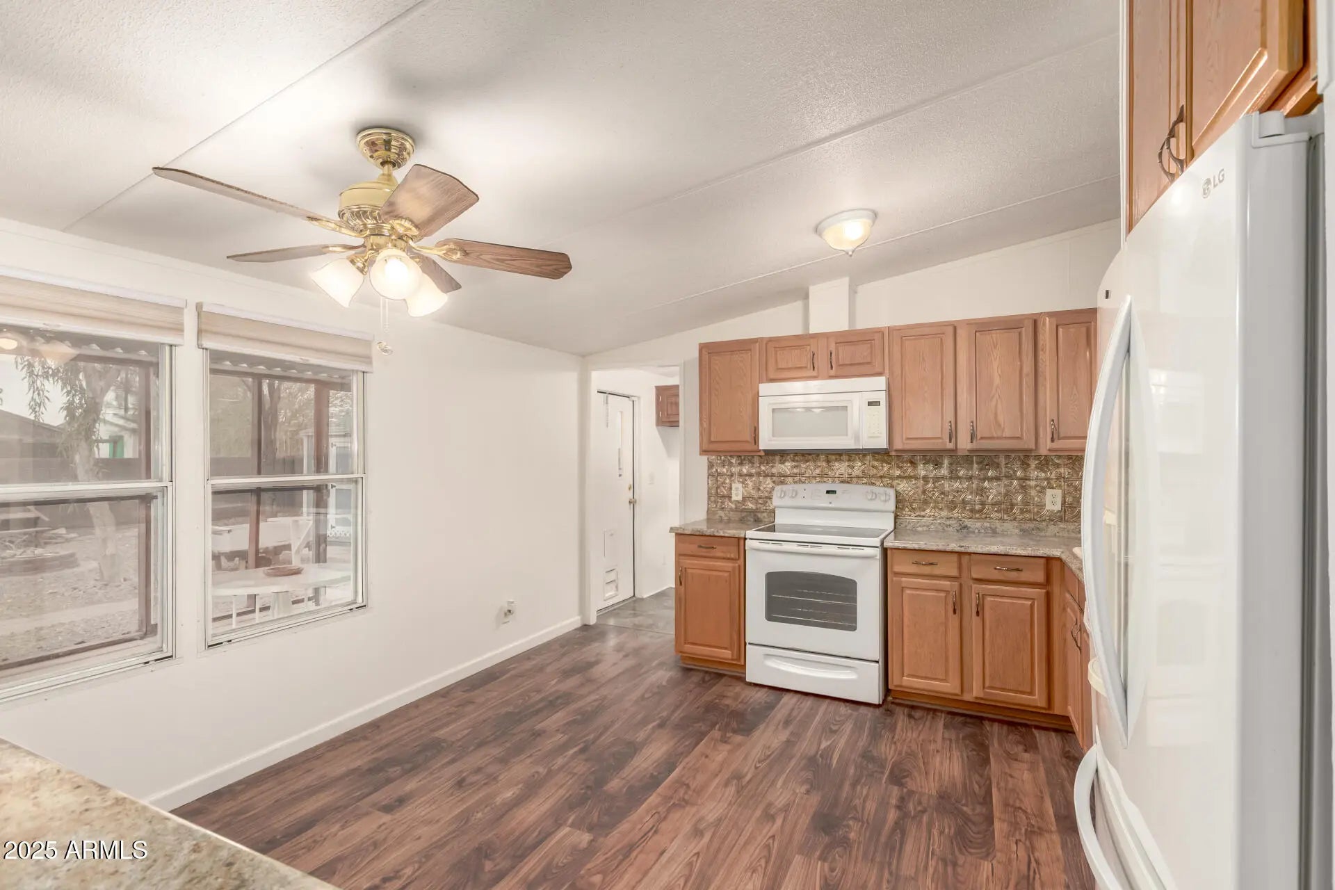 Start creating lasting memories in this inviting 3-bedroom mobile home! The interior shines with wood-look flooring, vaulted ceilings, and a cozy living room perfect for everyday comfort. The kitchen is designed to delight, featuring matching appliances, warm wood cabinetry, a tile backsplash, ample counter space, and a convenient serving window that opens to the living area. Recharge in the spacious main bedroom complete with dual sinks and a relaxing soaking tub. Outside, unwind on the screened-in patio or head to the backyard offering a storage shed, a firepit, and plenty of room for fun barbecues or peaceful evenings under the starry skies. This one is full of charm and ready to be enjoyed. Don't miss it!