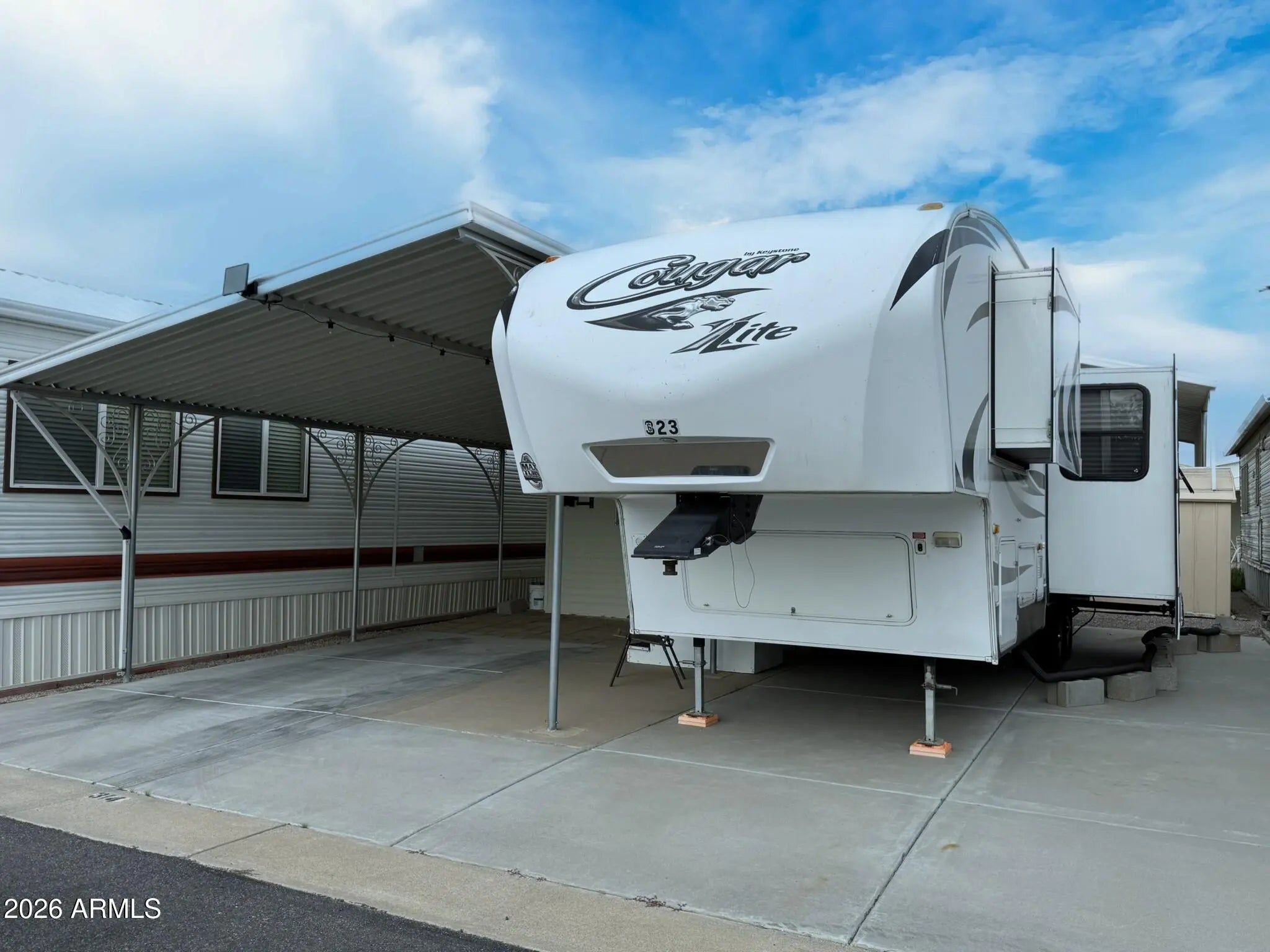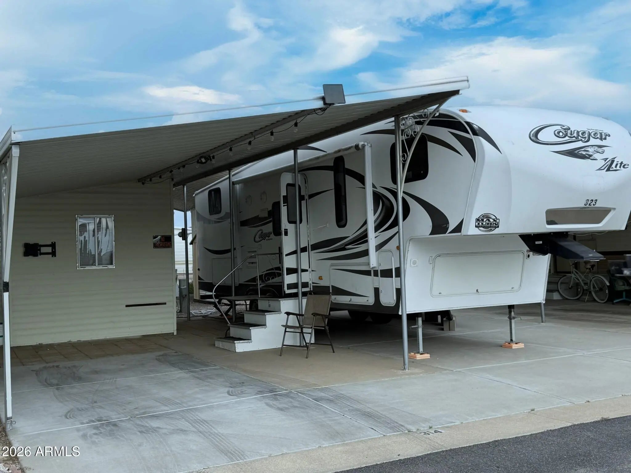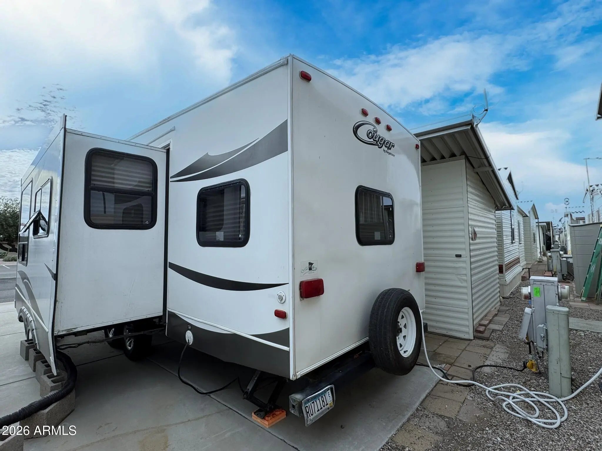You OWN THE LAND! This 30x42 lot in Caliente Casa de Sol, a vibrant 55+ active adult community in Florence, AZ, offers a turn-key setup with excellent proximity to amenities. Located on the sunny side of the street and facing the clubhouse parking lot, you're just steps from everything the community offers. The sale includes a 2012 Keystone Cougar 5th wheel featuring a bunk room, one bedroom, one bathroom, two slide outs, new tires, and an outdoor kitchen—perfect for enjoying the Arizona weather. A powered shed adds flexibility and function with a refrigerator, workbench, and built-in cabinets. The entire lot is fully concreted with decorative paver accents and includes a partial covered carport plus full hookups (water, sewer, and electric). Residents enjoy access to four pools with heated spas, a clubhouse with fitness center, billiard room, craft and woodworking shops, pickleball courts, shuffleboard, laundry facilities, and a full calendar of social activities. For golf enthusiasts, the nearby Three Parks Fairways golf course adds even more recreation options. This well-located, low-maintenance lot is perfect for RVers, snowbirds, or investors looking for lifestyle and value in Florence, AZ.