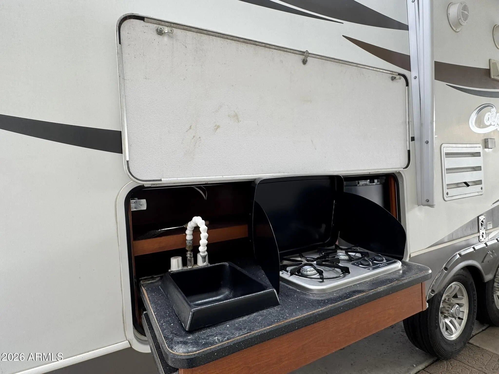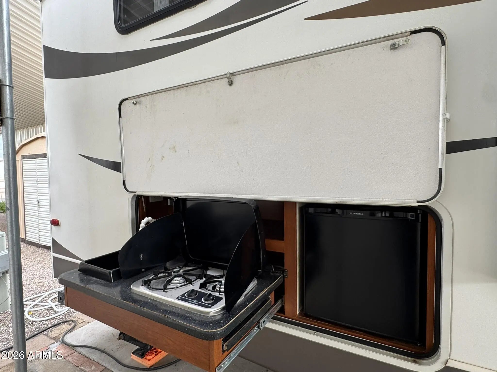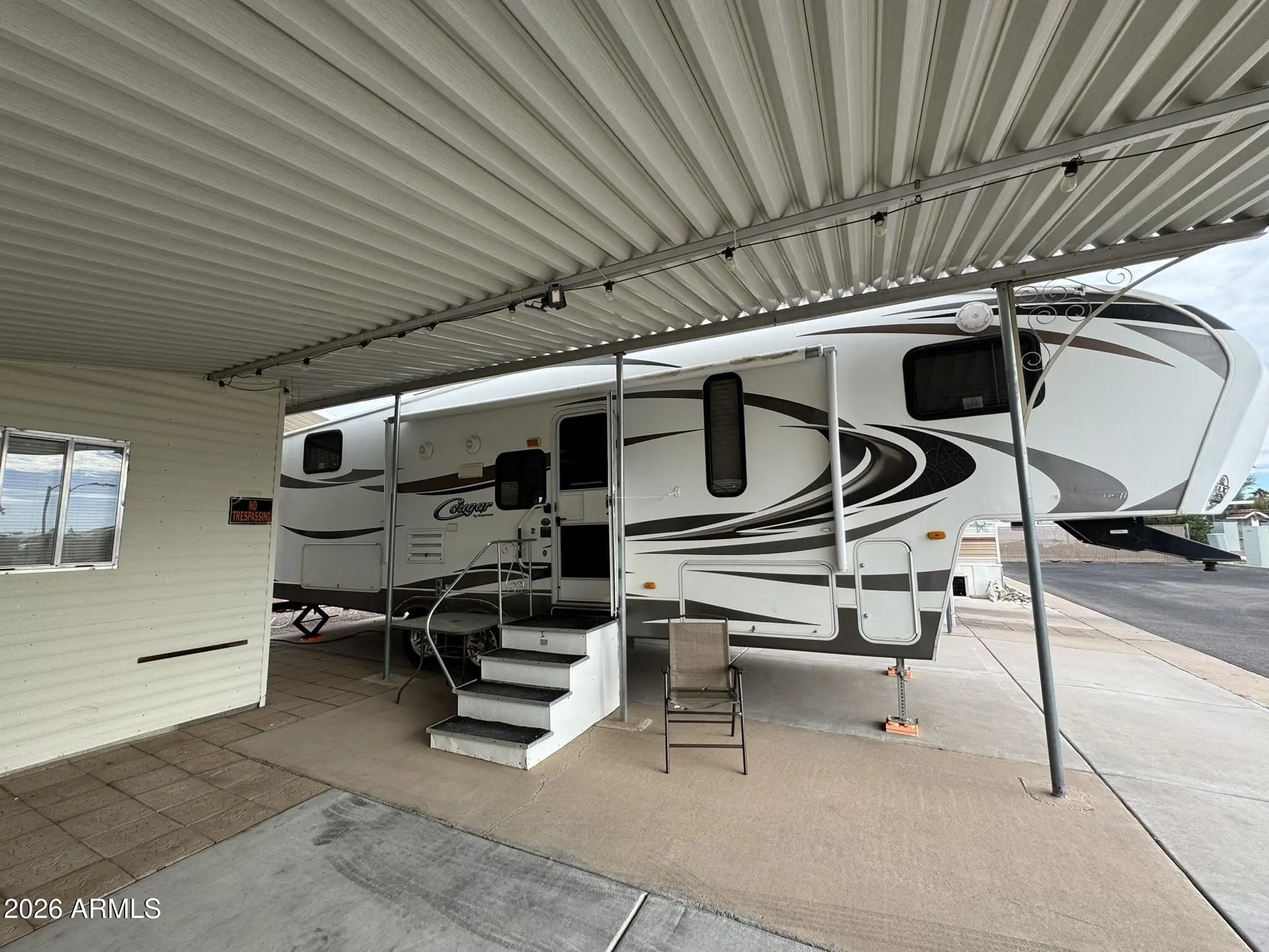 You OWN THE LAND! This 30x42 lot in Caliente Casa de Sol, a vibrant 55+ active adult community in Florence, AZ, offers a turn-key setup with excellent proximity to amenities. Located on the sunny side of the street and facing the clubhouse parking lot, you're just steps from everything the community offers. The sale includes a 2012 Keystone Cougar 5th wheel featuring a bunk room, one bedroom, one bathroom, two slide outs, new tires, and an outdoor kitchen—perfect for enjoying the Arizona weather. A powered shed adds flexibility and function with a refrigerator, workbench, and built-in cabinets. The entire lot is fully concreted with decorative paver accents and includes a partial covered carport plus full hookups (water, sewer, and electric). Residents enjoy access to four pools with heated spas, a clubhouse with fitness center, billiard room, craft and woodworking shops, pickleball courts, shuffleboard, laundry facilities, and a full calendar of social activities. For golf enthusiasts, the nearby Three Parks Fairways golf course adds even more recreation options. This well-located, low-maintenance lot is perfect for RVers, snowbirds, or investors looking for lifestyle and value in Florence, AZ.