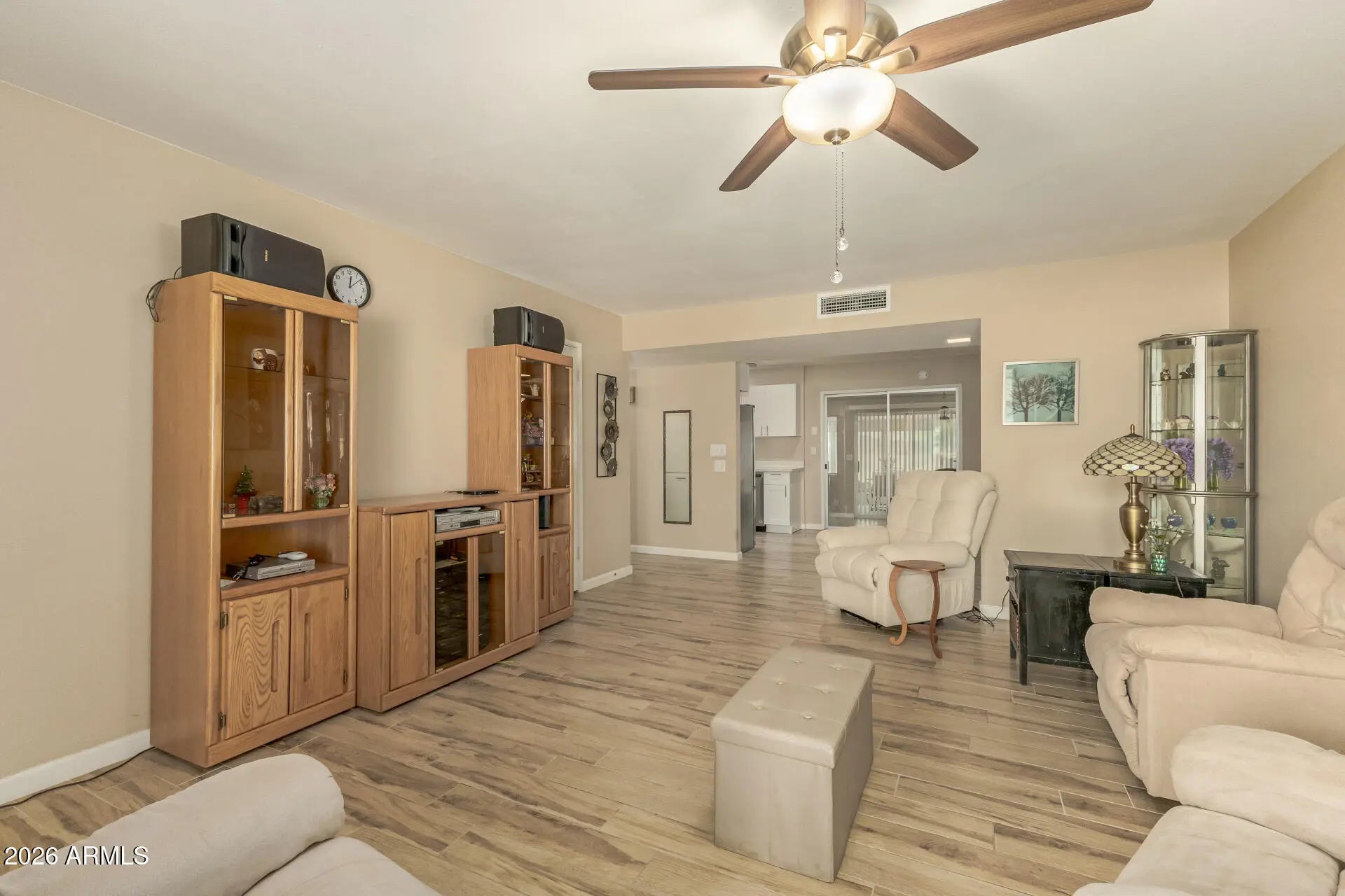Beautiful 2-bedroom, 2-bath Gemini home in Sun City! Split floor plan with an open kitchen featuring white granite countertops, white cabinetry, and stainless-steel appliances. Wood-look tile throughout. Enclosed summer room offers flexible living space, plus a screened-in patio to enjoy the outdoors. Large indoor laundry and 2-car garage. HVAC replaced in 2011. Conveniently located near shopping, dining, US-60, and Loop 101. Enjoy Sun City's 55+ lifestyle with 8 recreation centers, pools, fitness centers, golf courses, and a dog park.