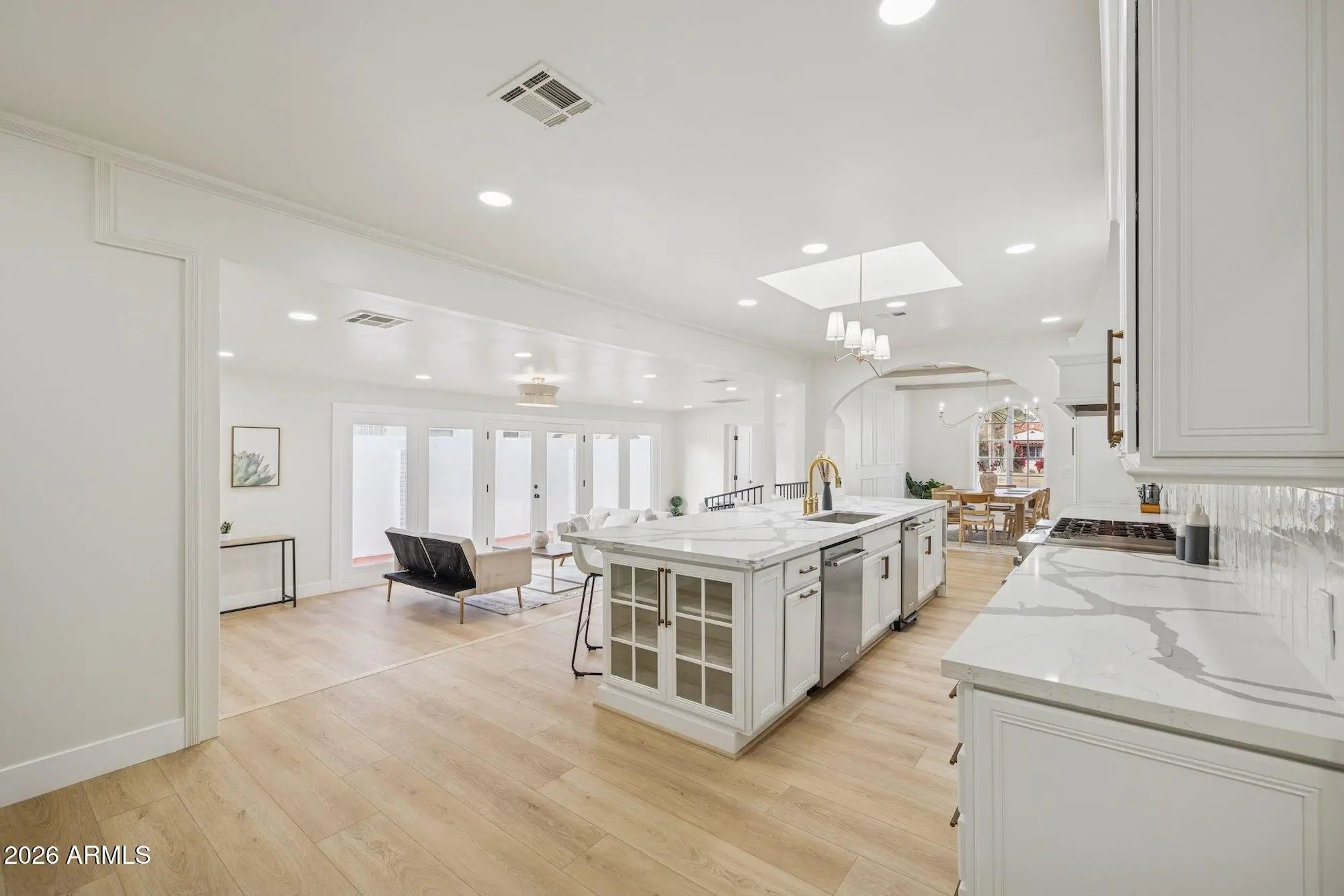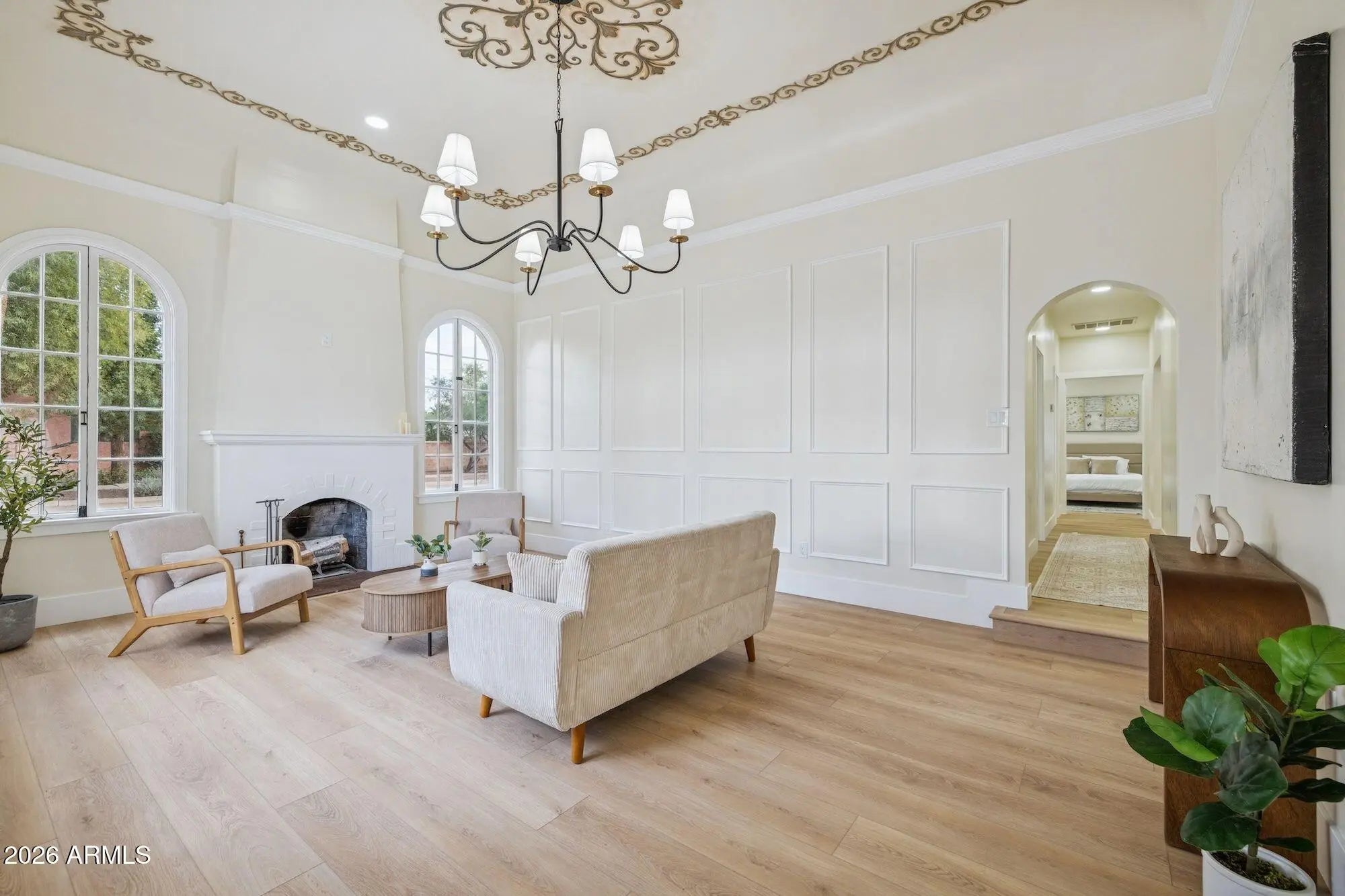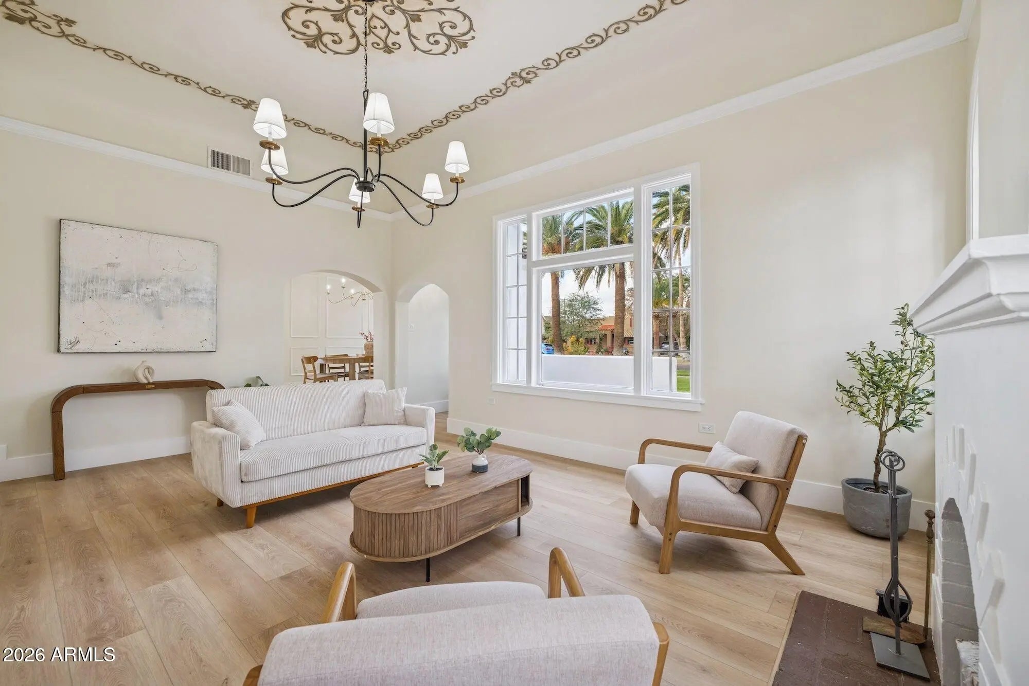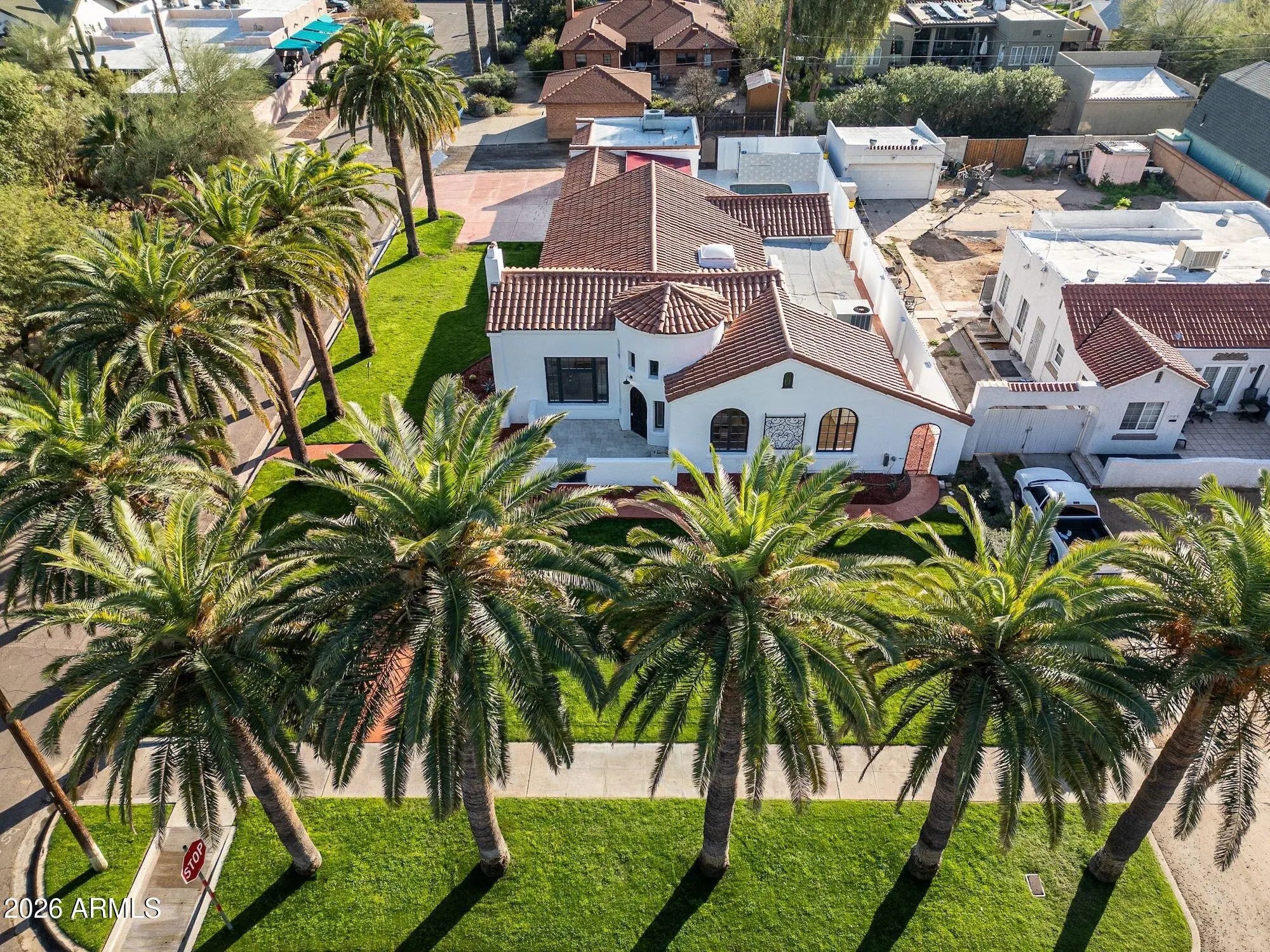 Exquisitely reimagined, this iconic Spanish Revival Mediterranean estate is gracefully positioned in the heart of central Phoenix's coveted Historic FQ Story District. Dating back a century, the residence artfully balances timeless architectural elegance with sophisticated modern luxury, creating a truly rare living experience. This 2361 sf single-level home is anchored by an expansive chef's kitchen, highlighted by a dramatic 14-foot waterfall island and an exceptional suite of top-of-the-line appliances, including a gas range with dual ovens, an additional convection oven, warming drawer, microwave, and integrated espresso machine. Custom-crafted cabinetry extends throughout both the kitchen and bathrooms, with dual vanities enhancing the spa-inspired baths. Rich wood flooring flows seamlessly throughout the home, imparting warmth and refinement. The thoughtfully curated floor plan features two elegant guest bedrooms and bathroom plus a generously proportioned primary suite, accompanied by a beautifully appointed bathroom with a large walk-in closet. An additional 480 square foot private casita complete with a fully equipped kitchen, bath, and washer/dryer offers an ideal retreat for guests, extended stays, or multigenerational living. Designed for both intimate living and grand entertaining, the property boasts a full-size swimming pool, a dedicated wine cellar for the discerning collector, and dual air-conditioning systems to ensure year-round comfort. The formal living room is a true showpiece, showcasing a hand-painted mural and striking chandeliers that beautifully accentuate the home's historic character. A formal dining room and inviting family room further complement the home's elegant yet livable design. Custom closets and abundant storage complete this exceptional offering. With its captivating architectural details, refined upgrades, and premier location, this residence stands as one of the finest homes in the FQ Story community an extraordinary opportunity to own a timeless piece of Phoenix history.
